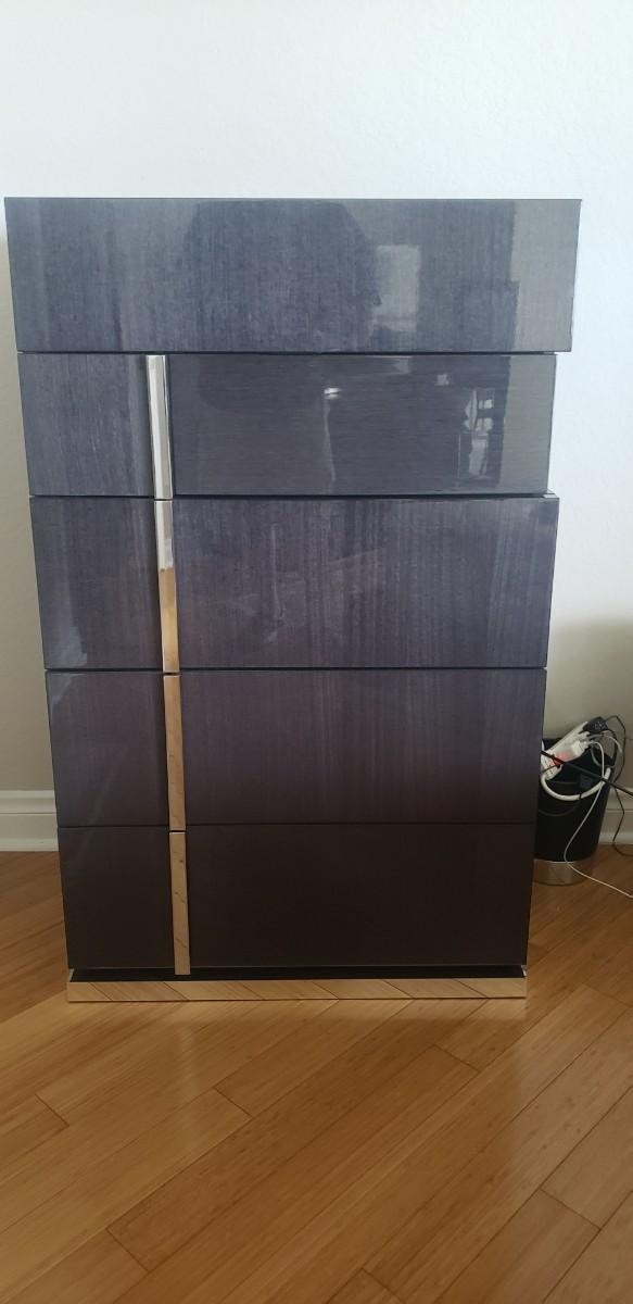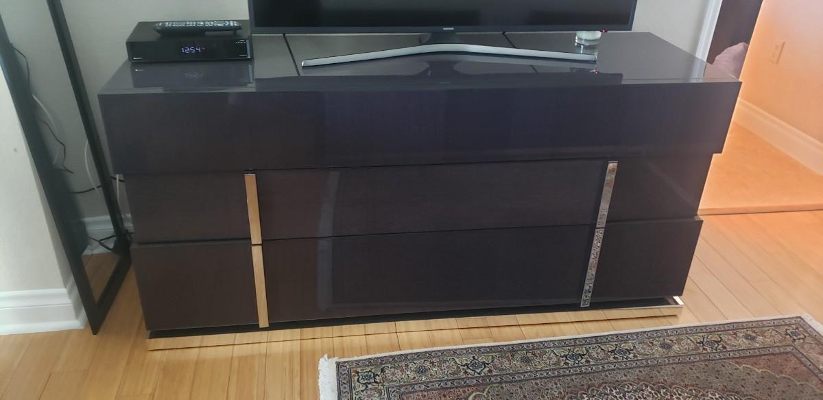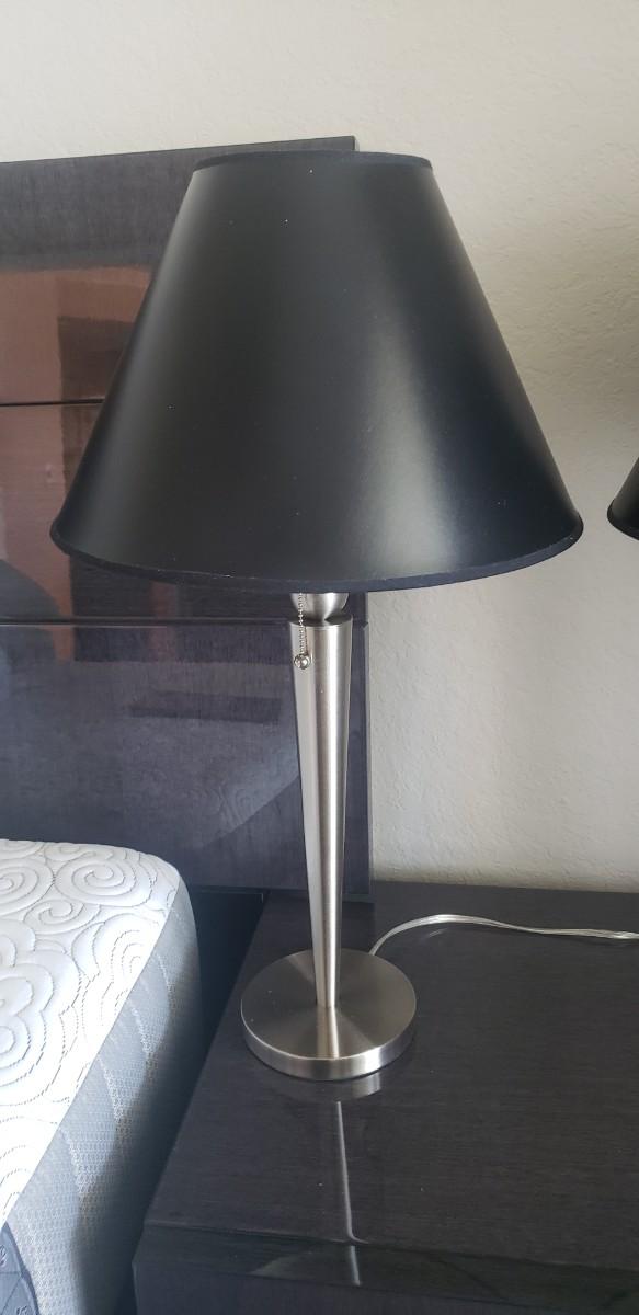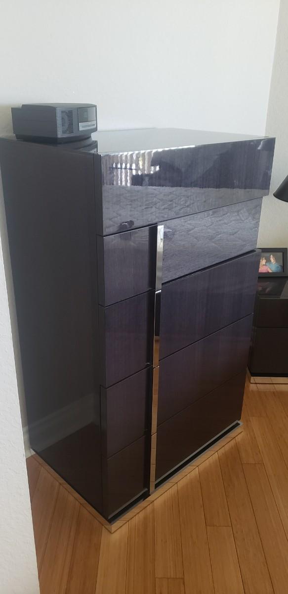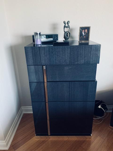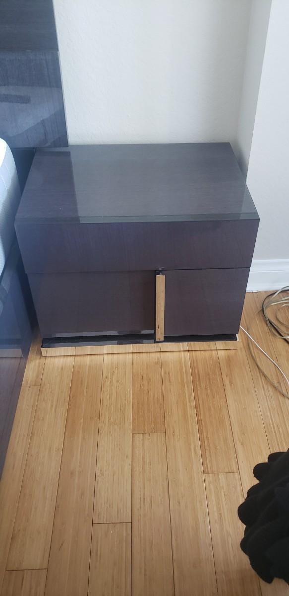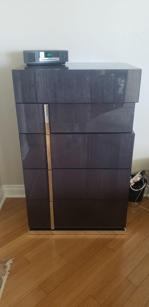 This Lot Includes King size bed (slate wood base) and mattress, two night stands (left & right) high dresser, Low dresser, solid wood made in Italy. 3 Silver Lamps, 1 is a Floor Lamp and 2 are Table lamps, Suede chair and Ottoman