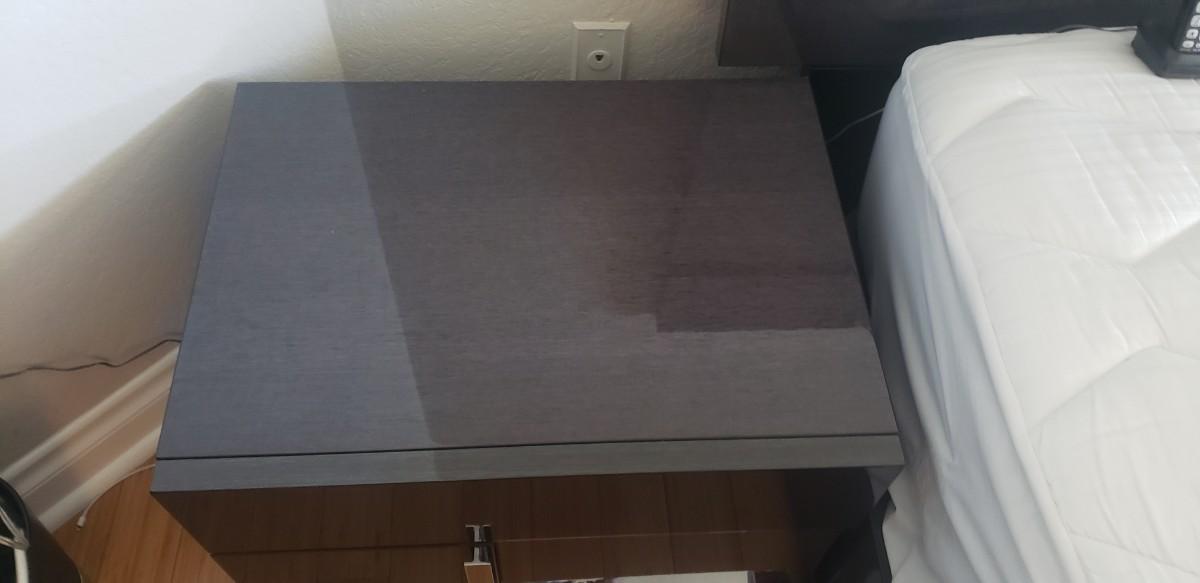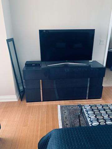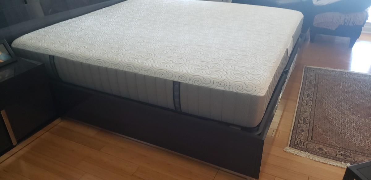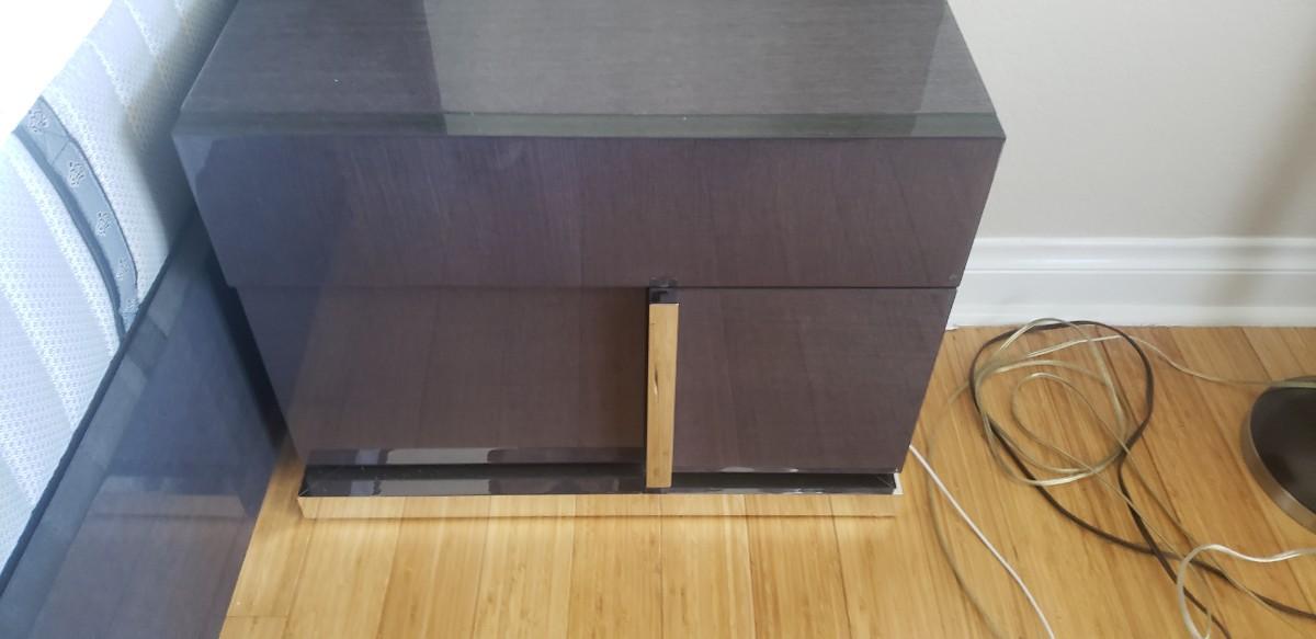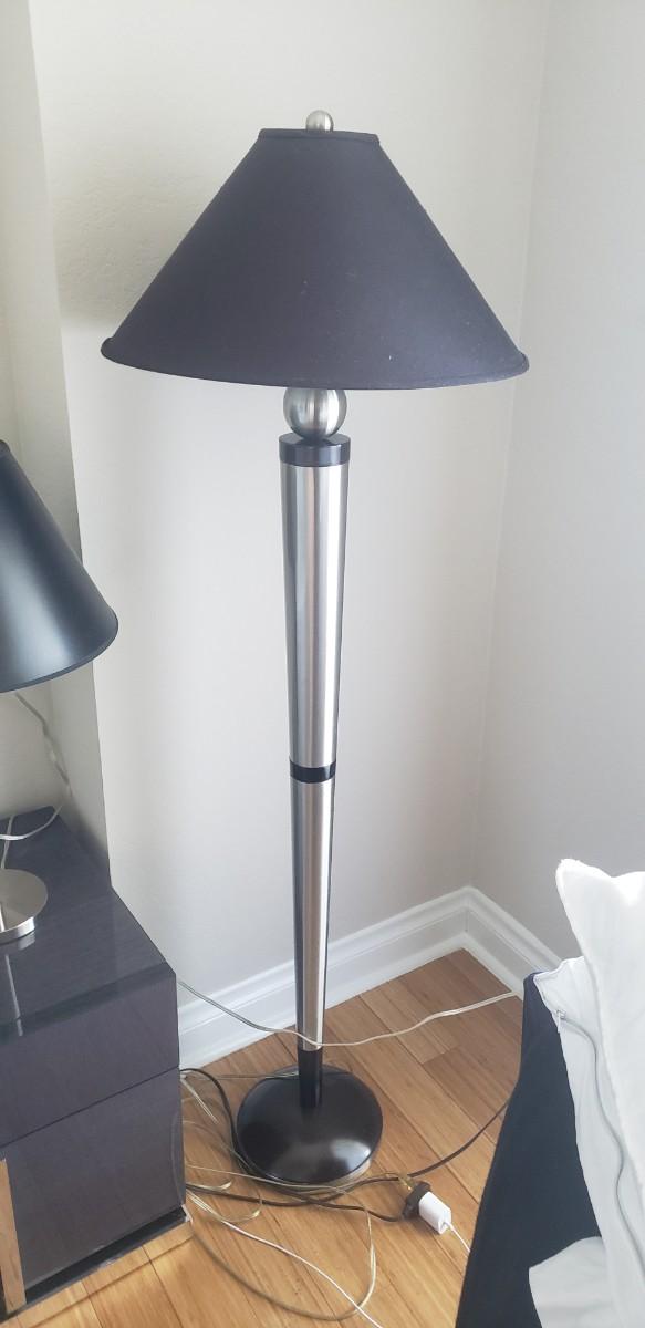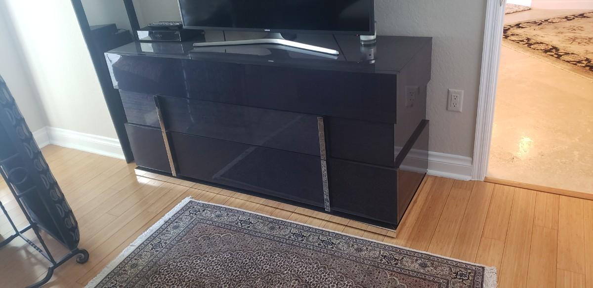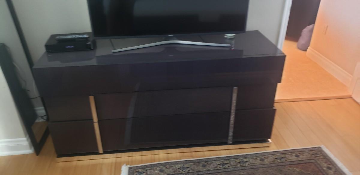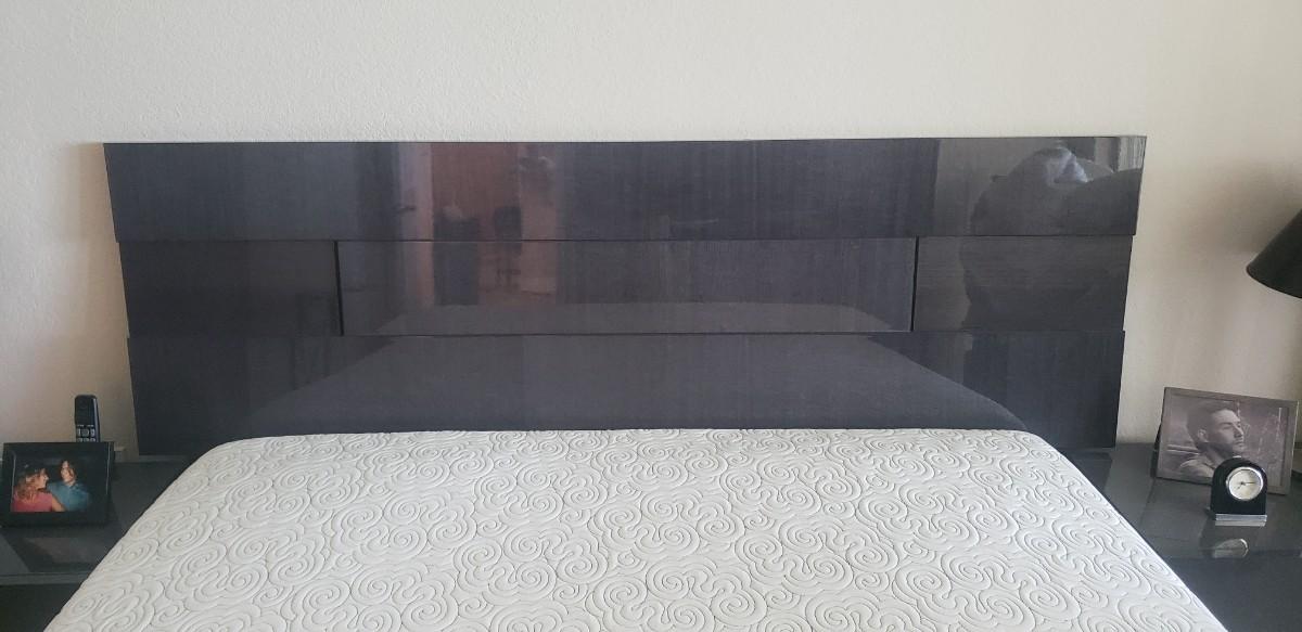 This Lot Includes King size bed (slate wood base) and mattress, two night stands (left & right) high dresser, Low dresser, solid wood made in Italy. 3 Silver Lamps, 1 is a Floor Lamp and 2 are Table lamps, Suede chair and Ottoman