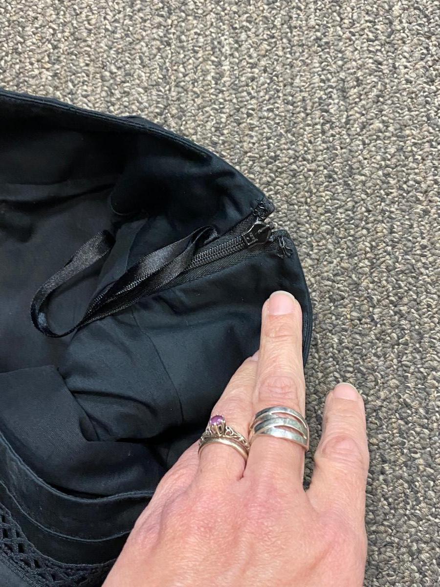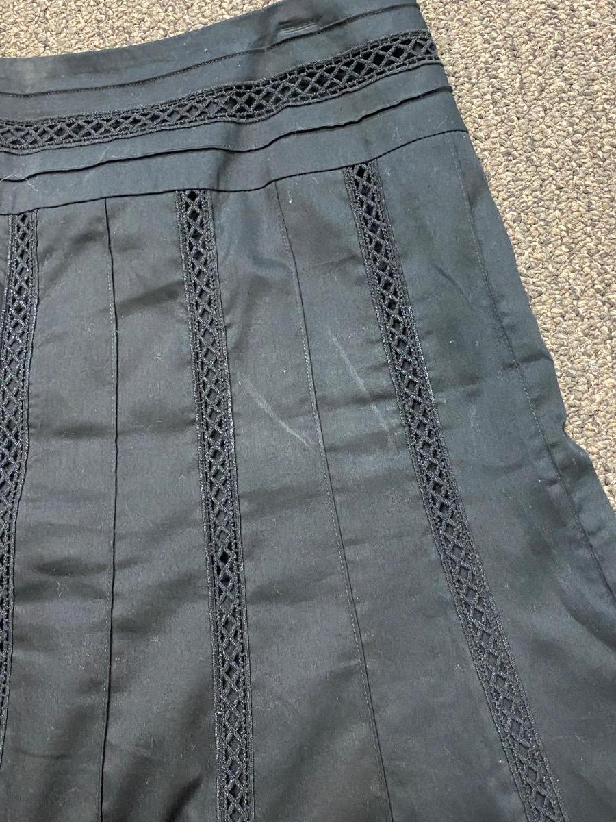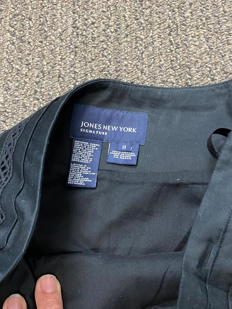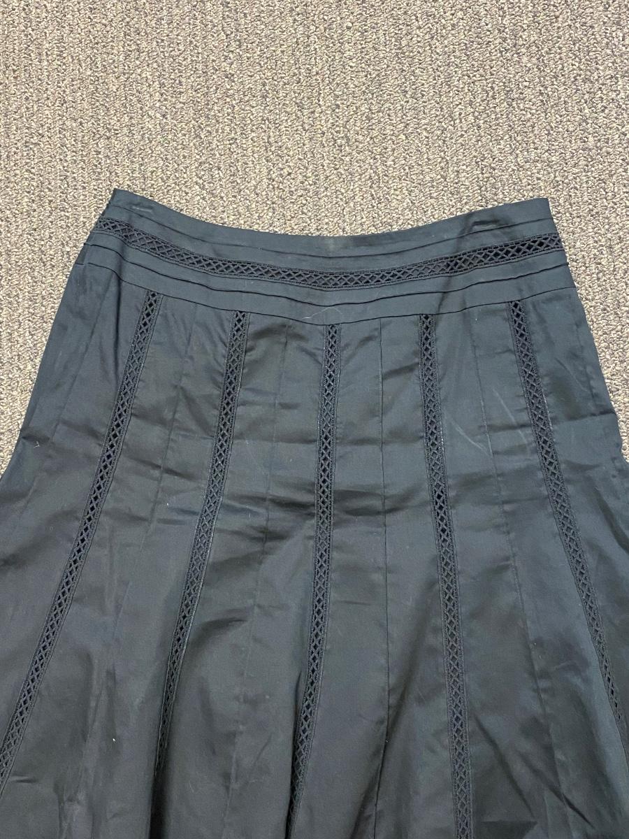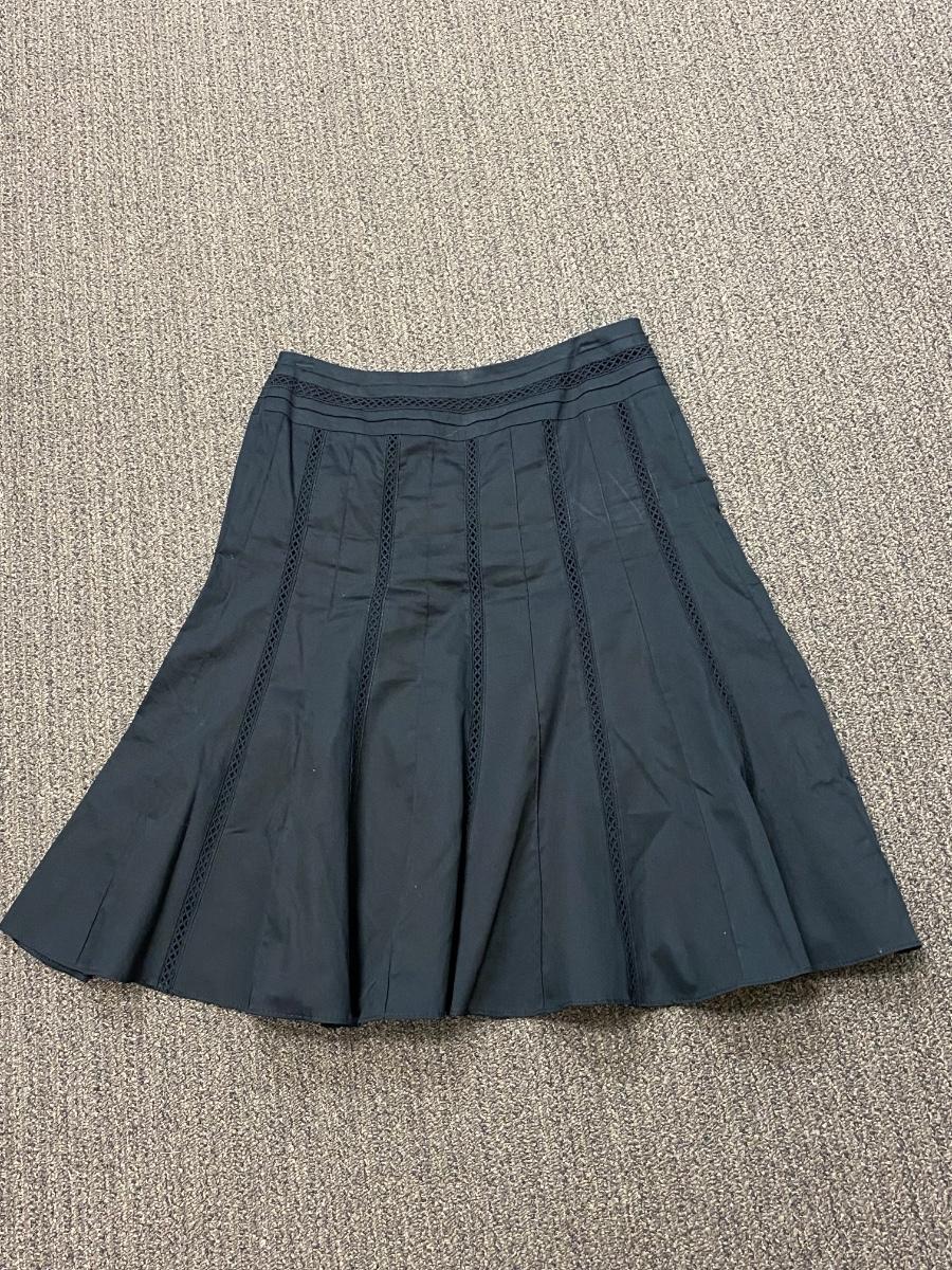 Black Knee Length Pleated Flair Skirt Jones New York Signature. In worn condition, a couple of smudge spots, think it may just need to be cleaned. Side zip. Size 8.