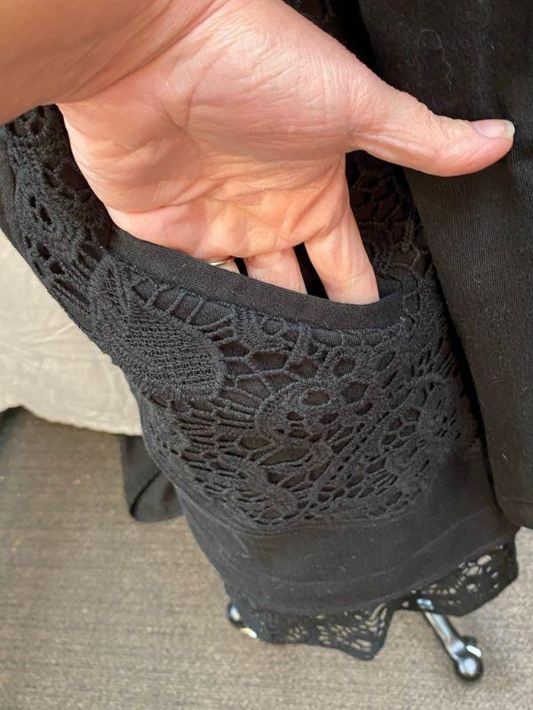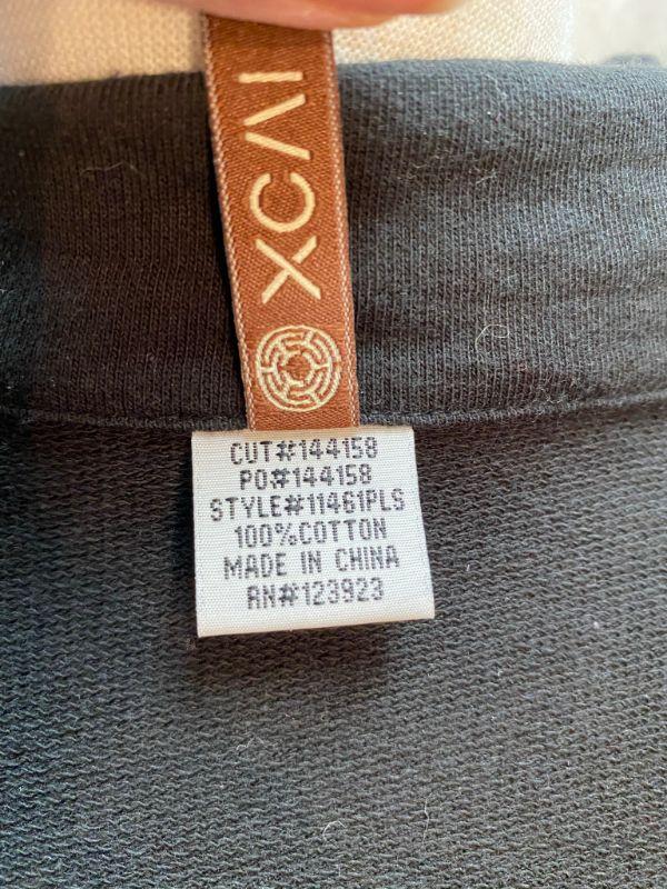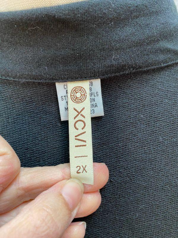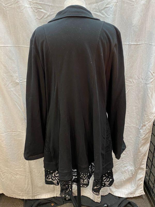 Black button front jacket by XCVI. Lace edge and applique. Front pockets. Size 2X. Good condition.