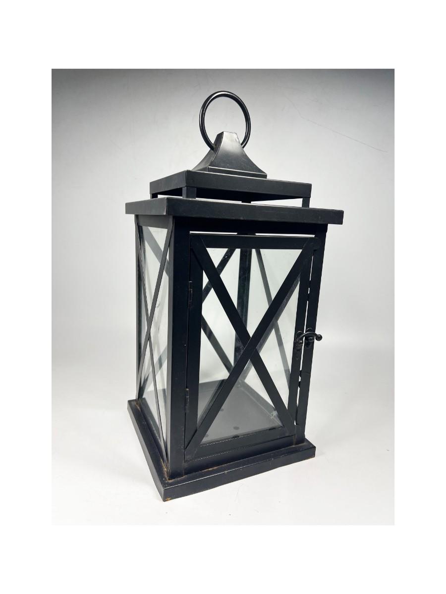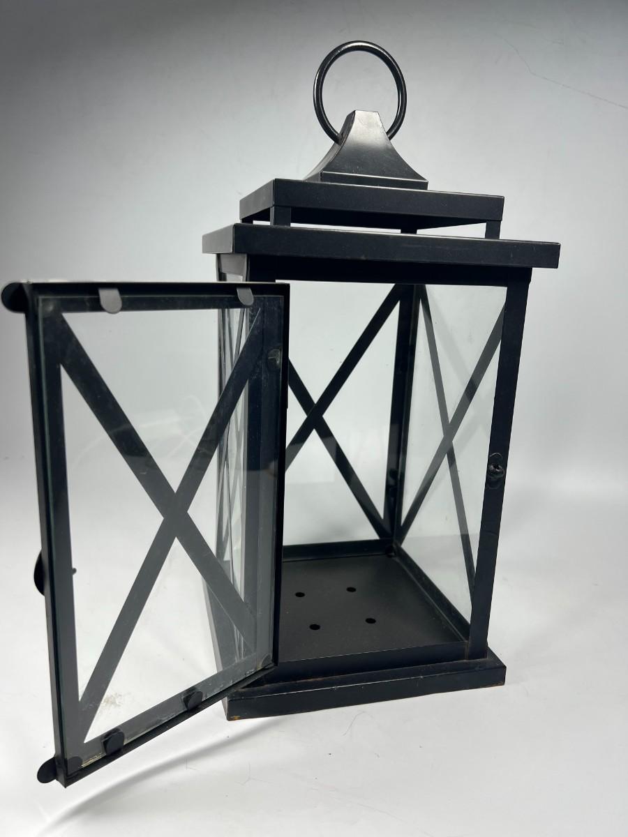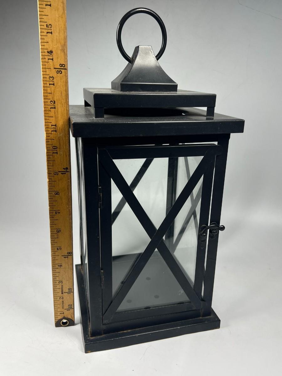 Black lantern style candle holder lamp. In good condition. Can be used inside or outside. About 15" height.