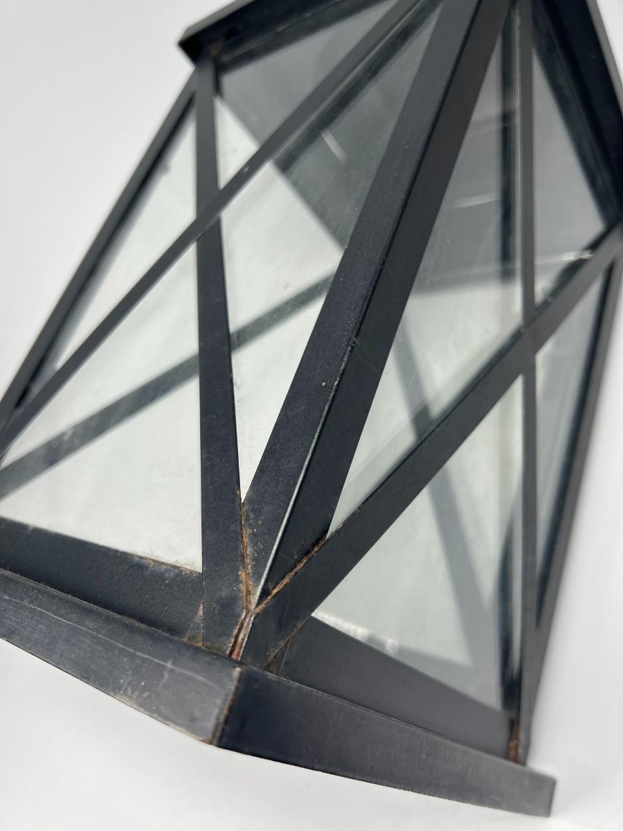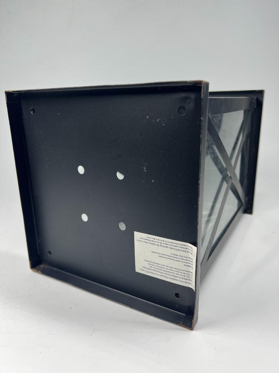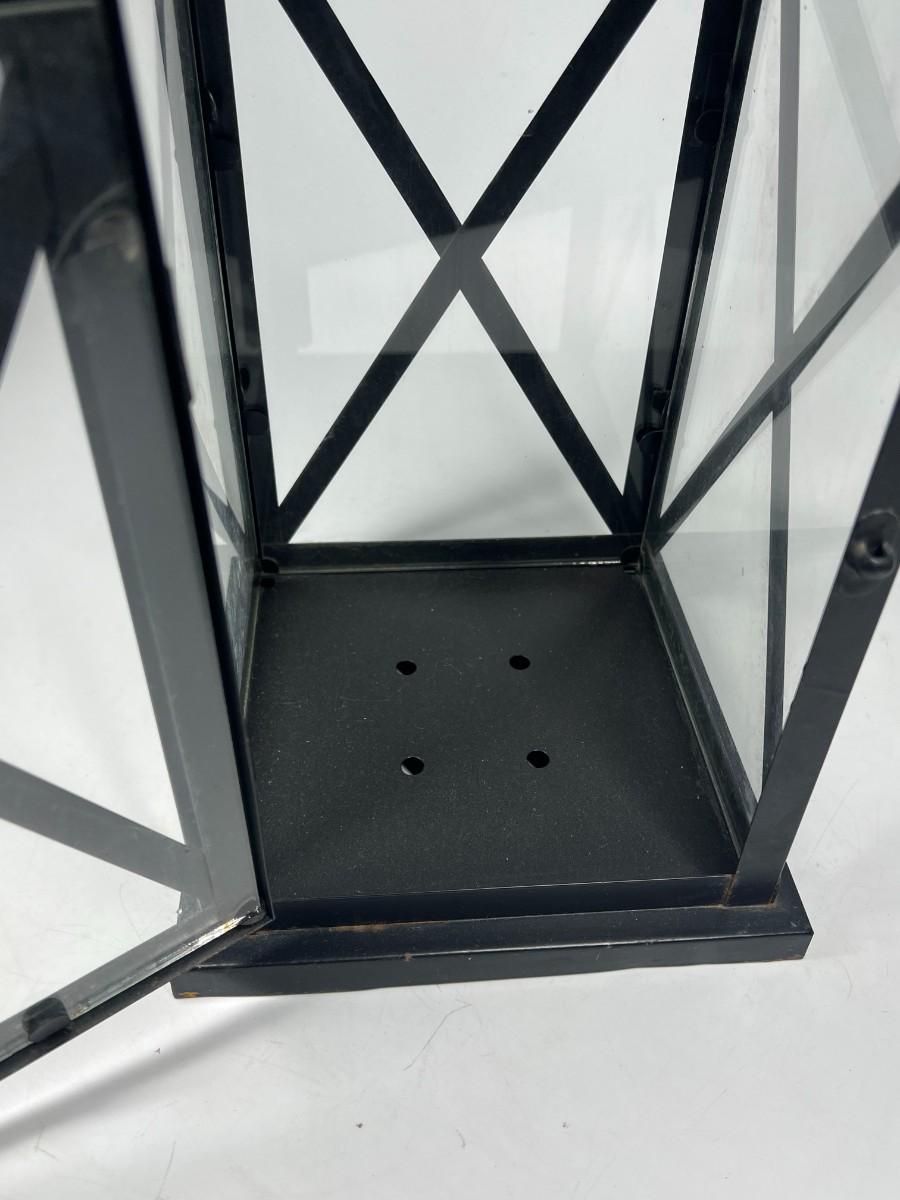 Black lantern style candle holder lamp. In good condition. Can be used inside or outside. About 15" height.