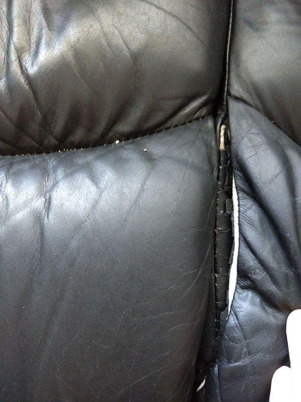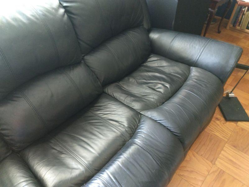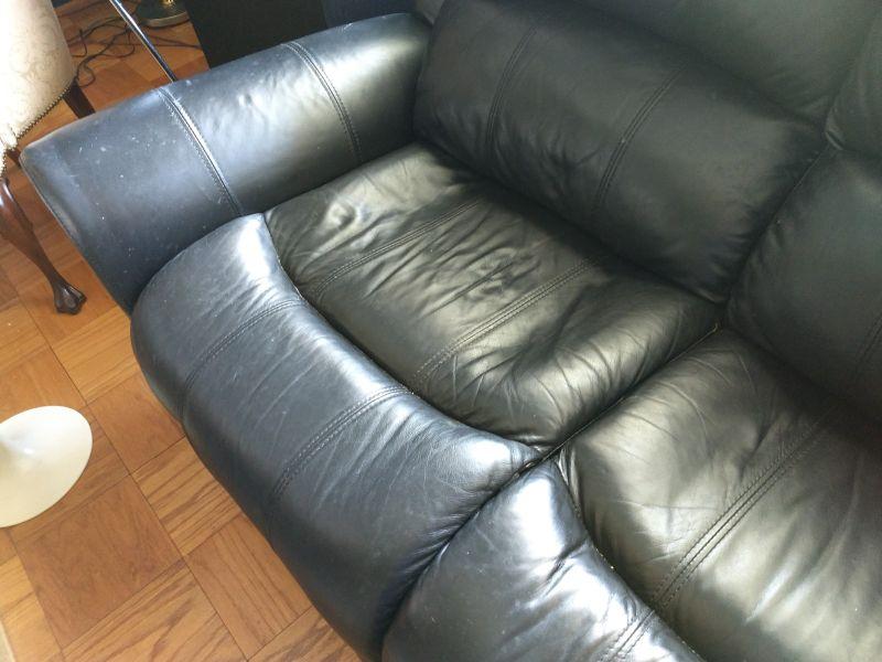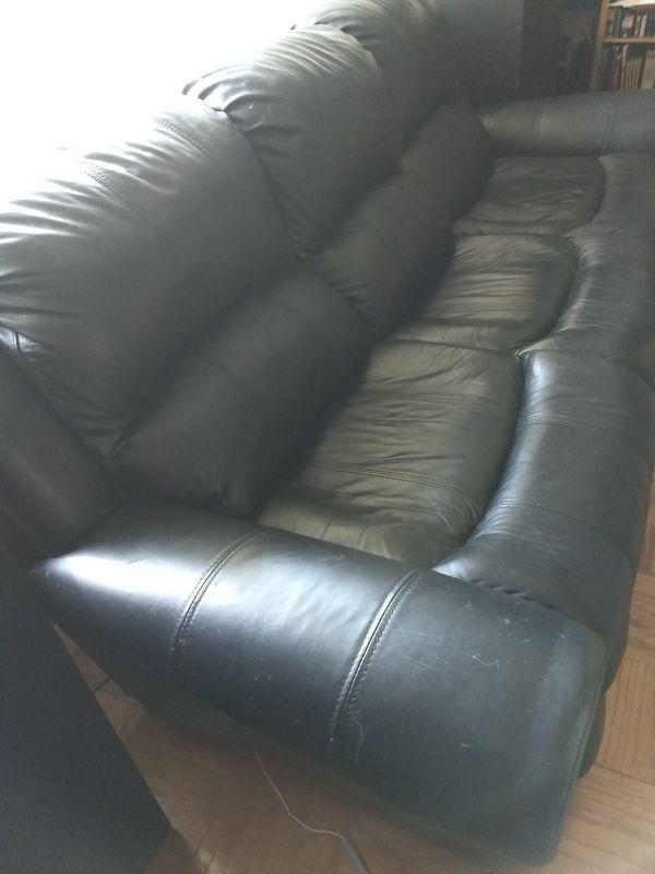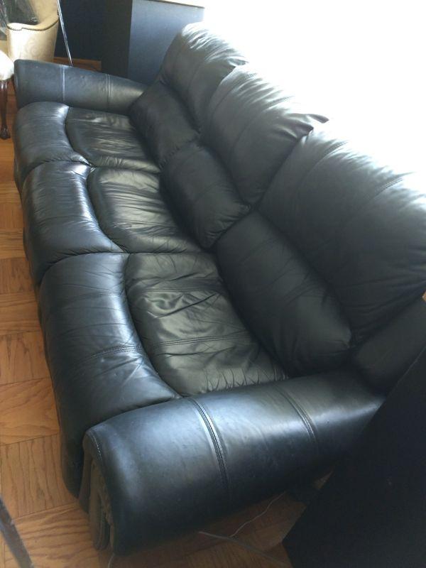 Black Leather Couch with Brass Button Accents has some wear to the surface. Cracking at seems on cushion as shown