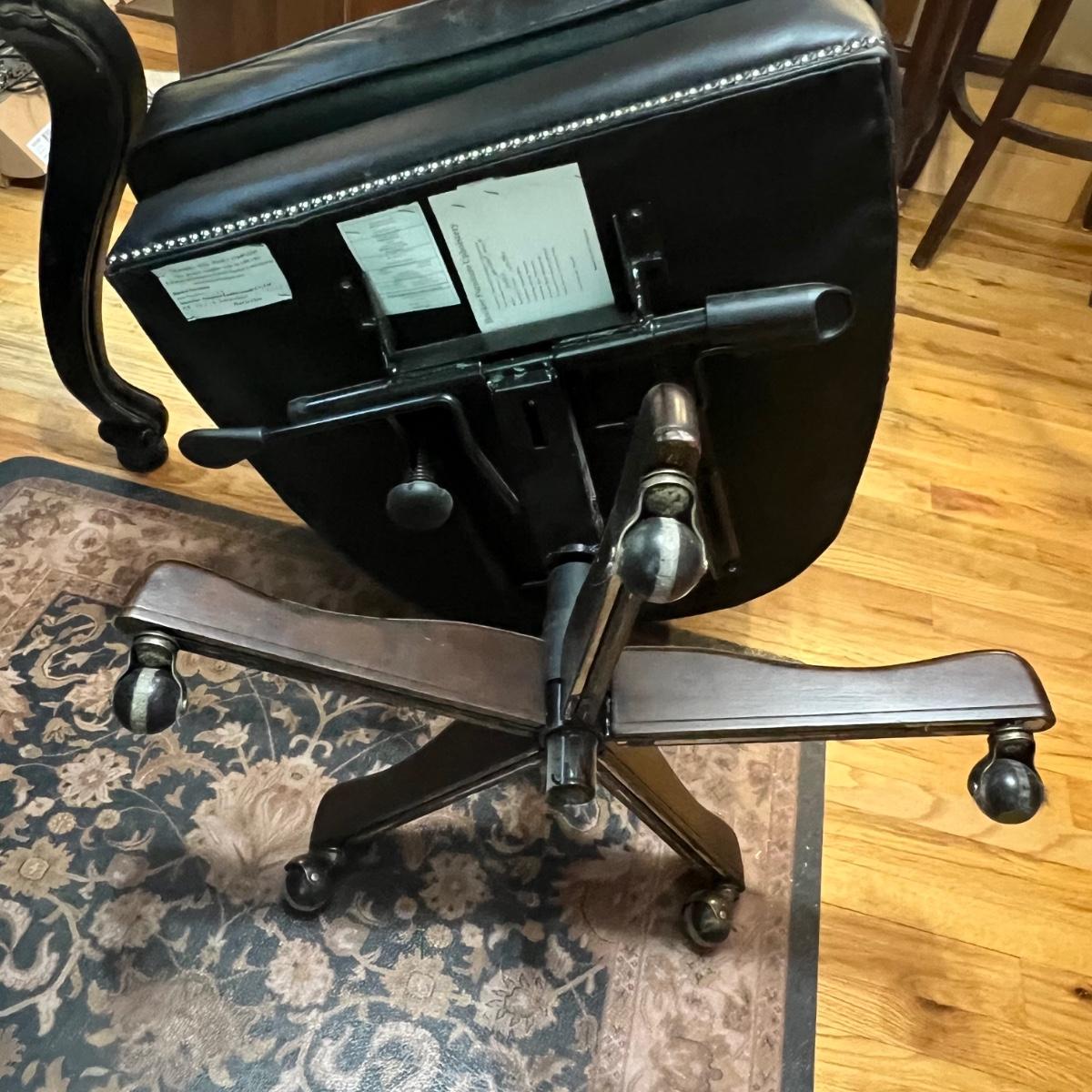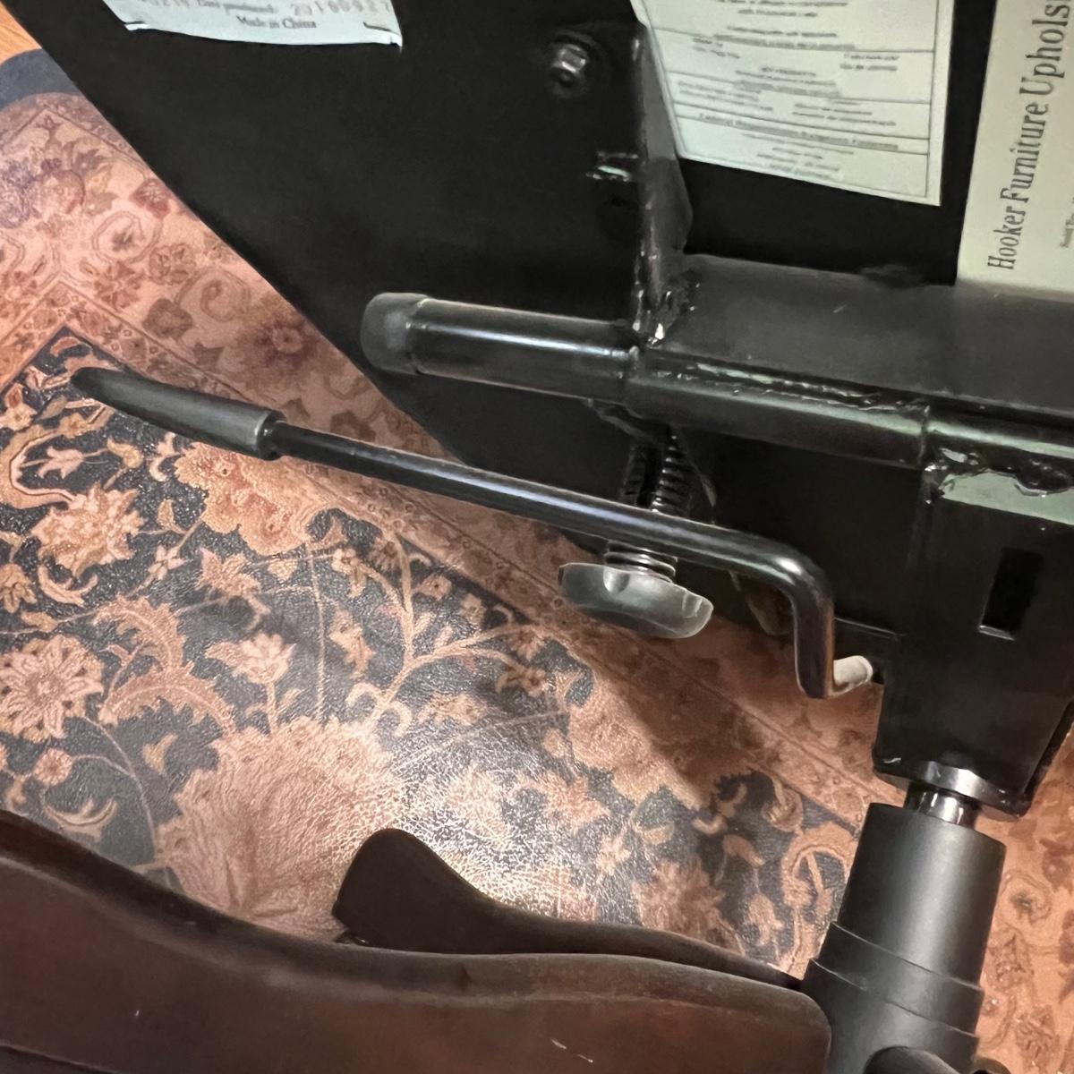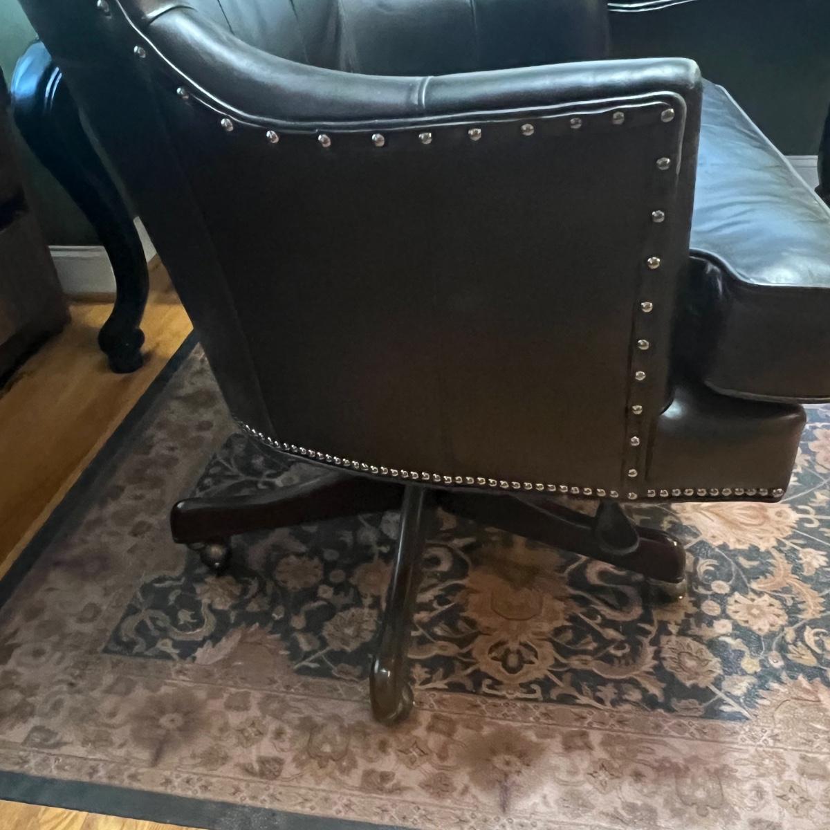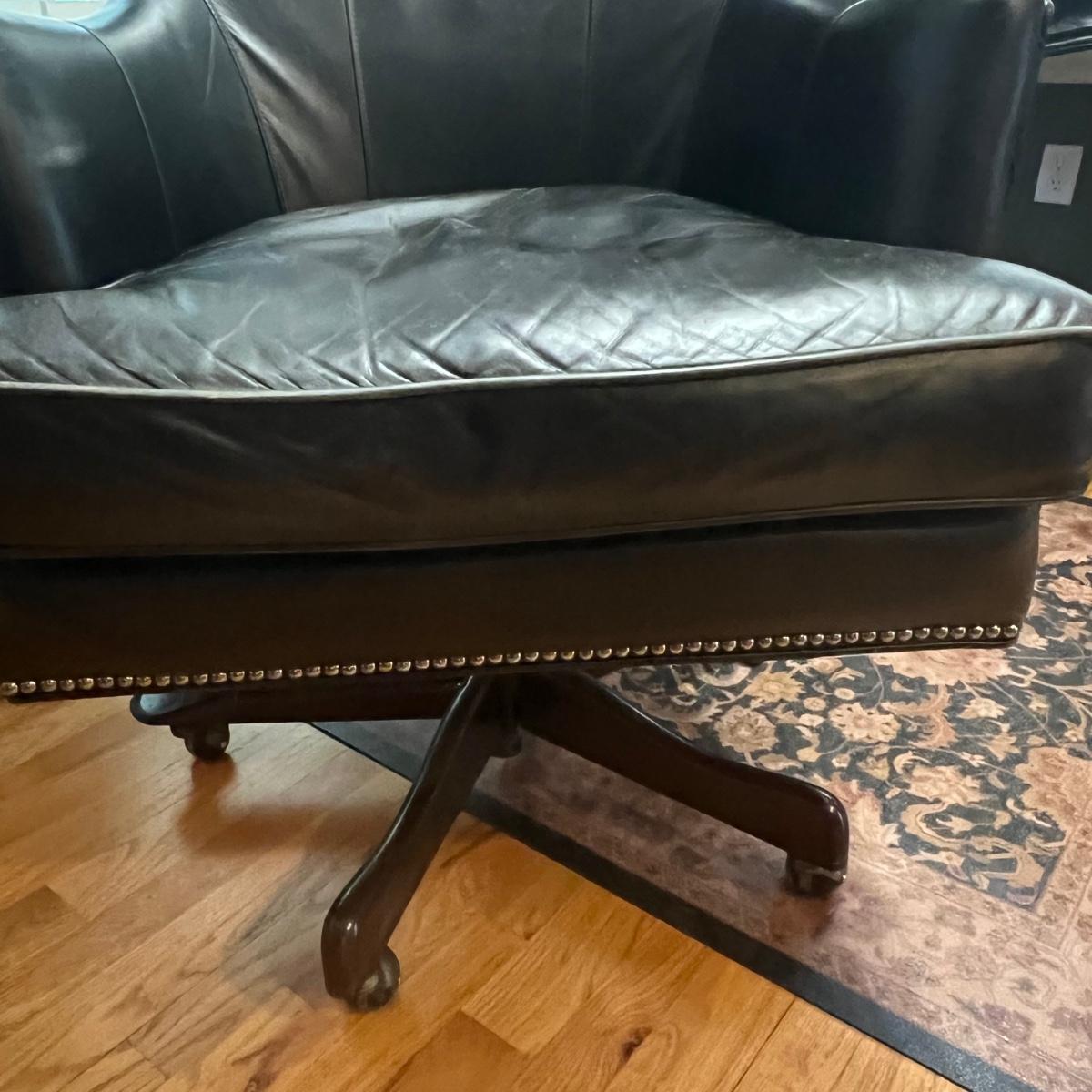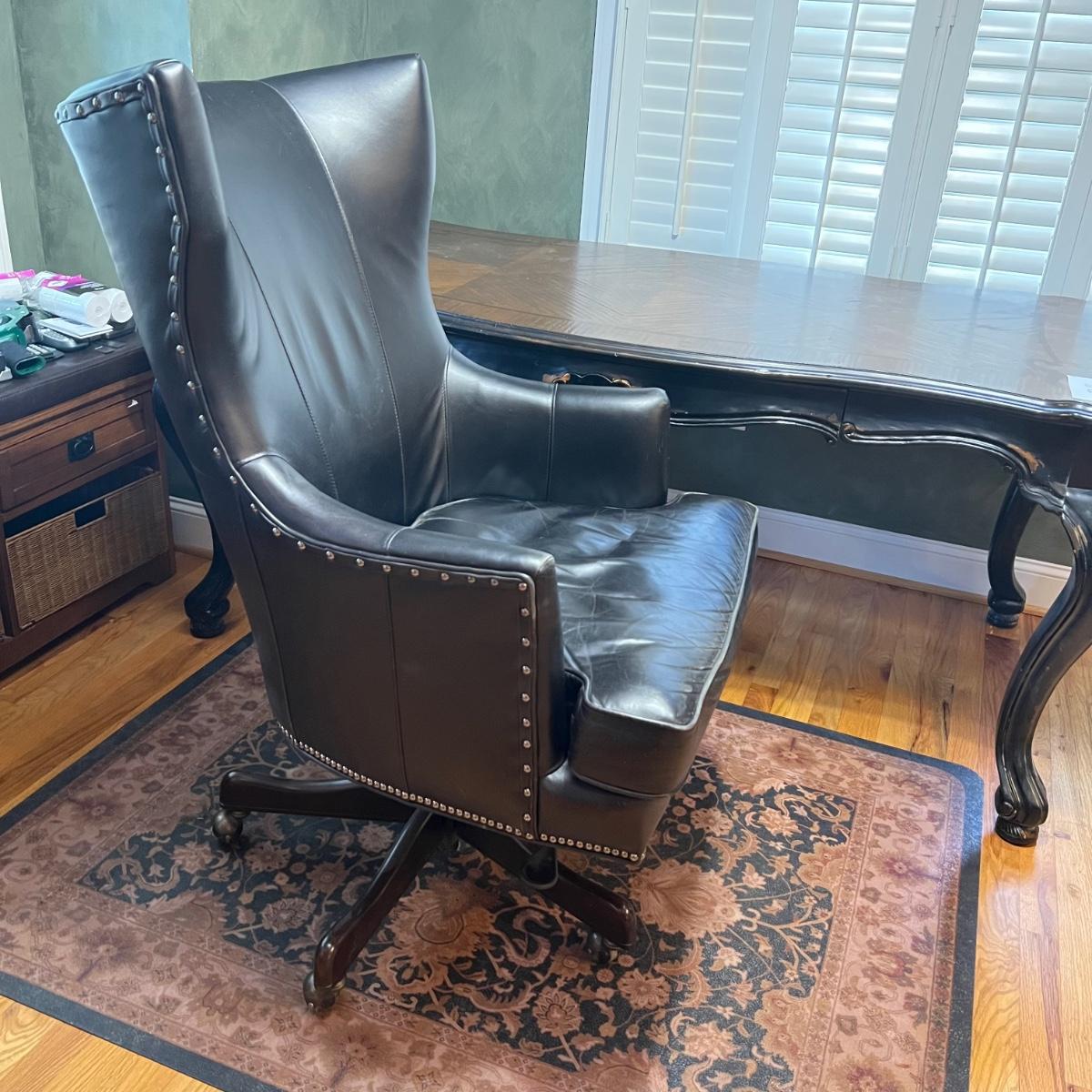 This buttery soft black leather chair is from Hooker Furniture Company and comes with a plastic floor protector pad that resembles a rug. Chair swivels, is on wheels and adjusts in seat height from 20”-23”. Extremely comfortable this handsome chair also features metal rivets and the seat cushion is removable.