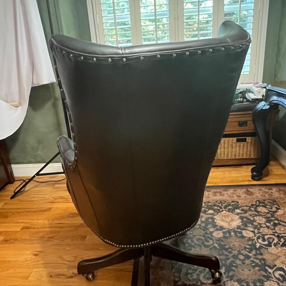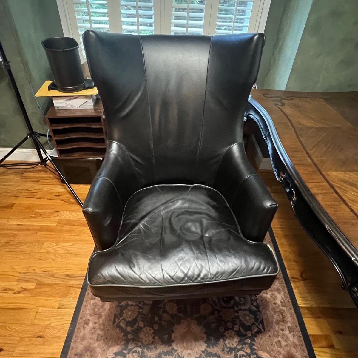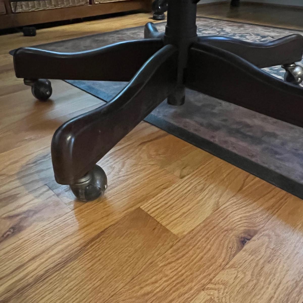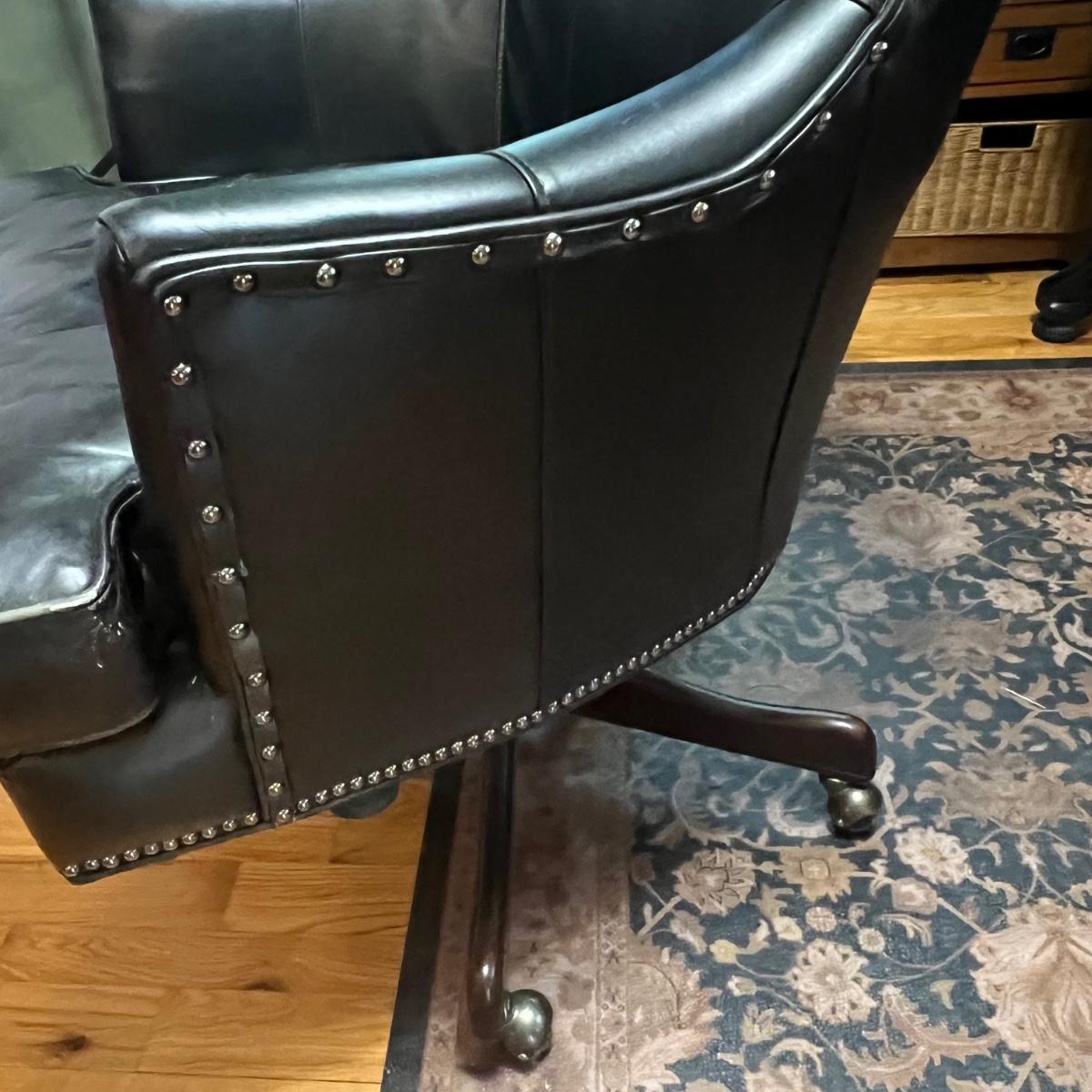 This buttery soft black leather chair is from Hooker Furniture Company and comes with a plastic floor protector pad that resembles a rug. Chair swivels, is on wheels and adjusts in seat height from 20”-23”. Extremely comfortable this handsome chair also features metal rivets and the seat cushion is removable.