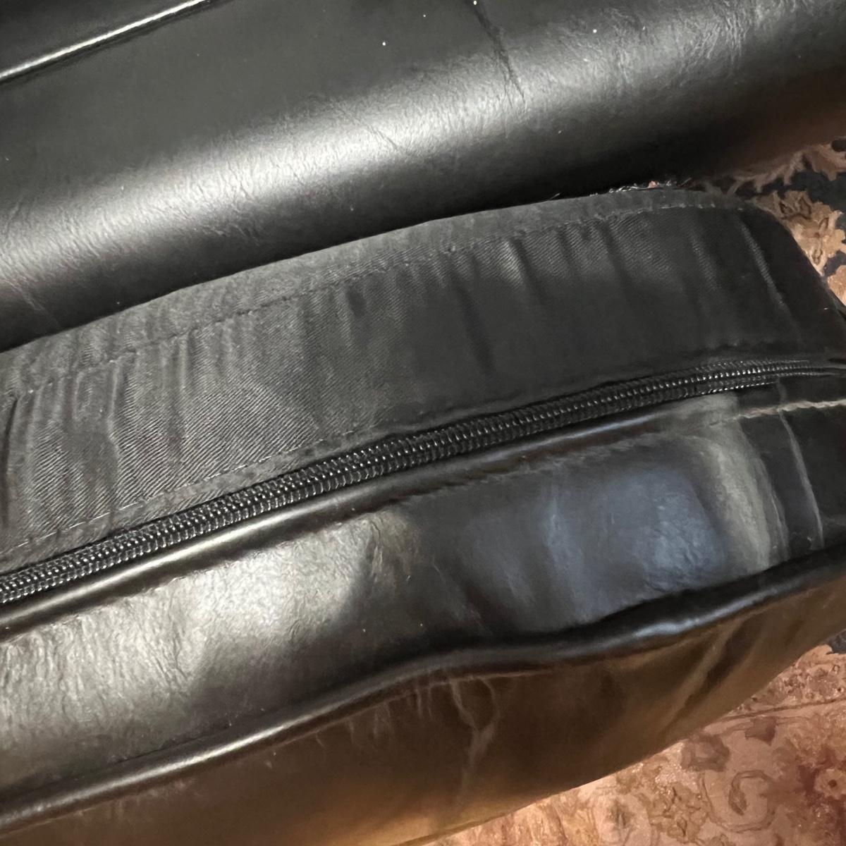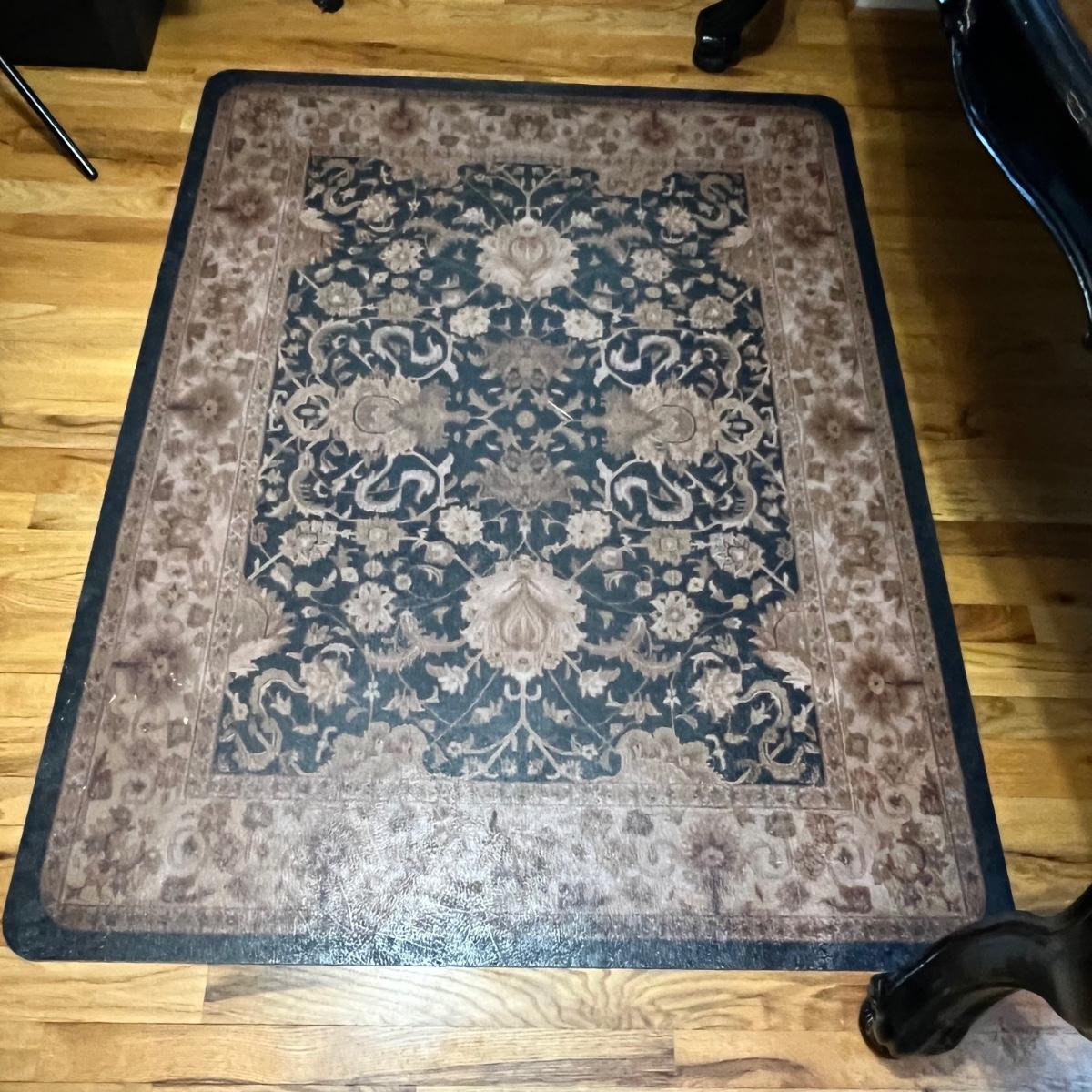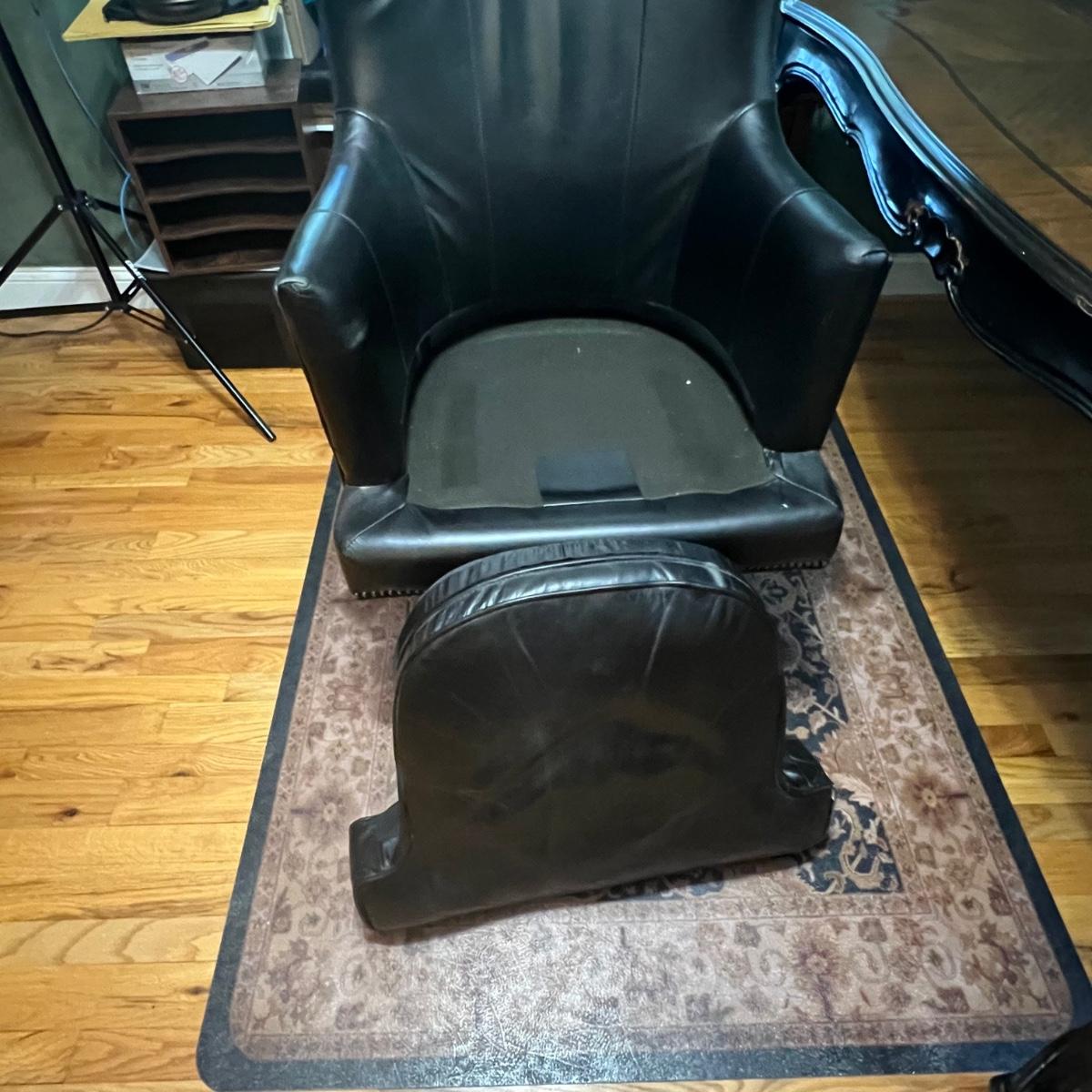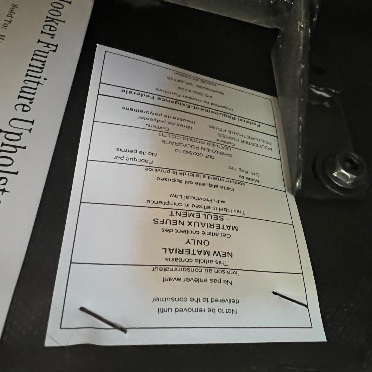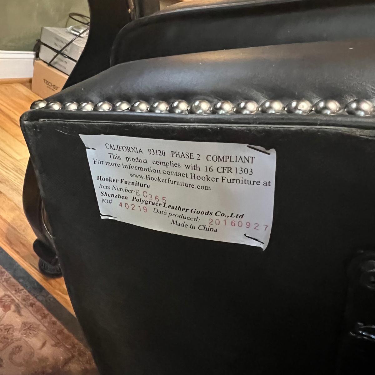 This buttery soft black leather chair is from Hooker Furniture Company and comes with a plastic floor protector pad that resembles a rug. Chair swivels, is on wheels and adjusts in seat height from 20”-23”. Extremely comfortable this handsome chair also features metal rivets and the seat cushion is removable.