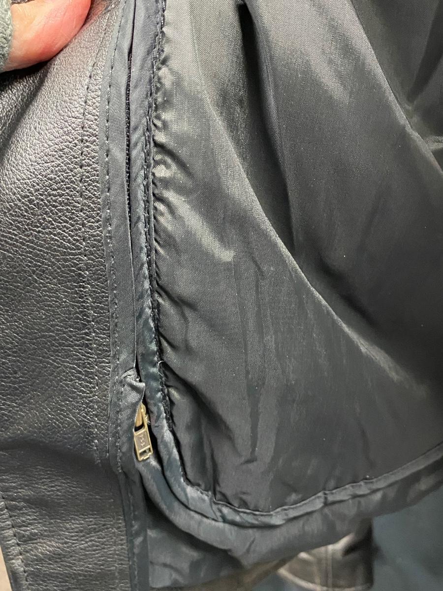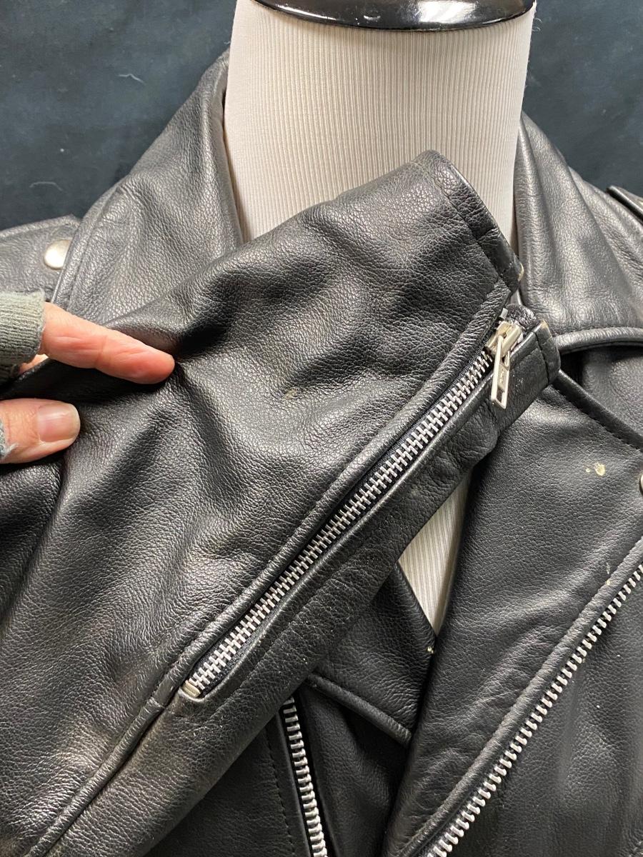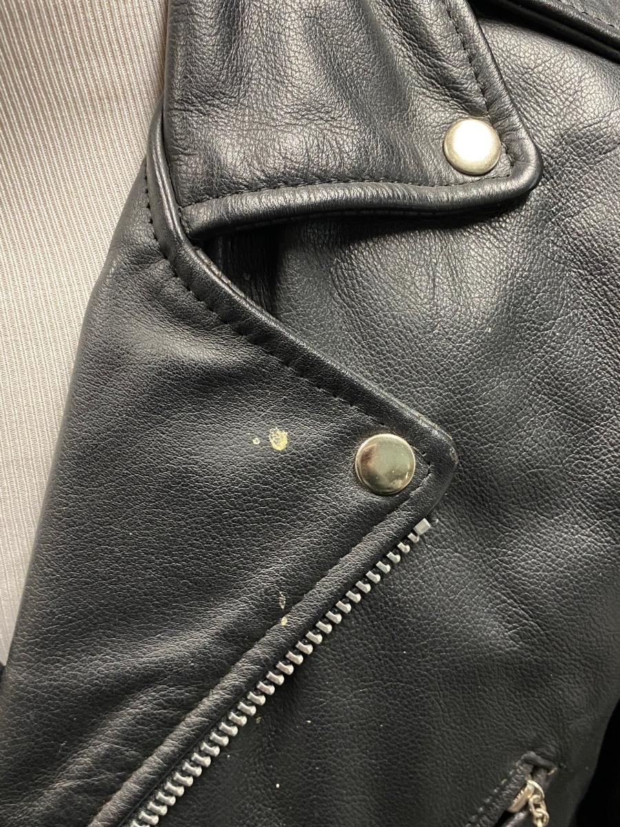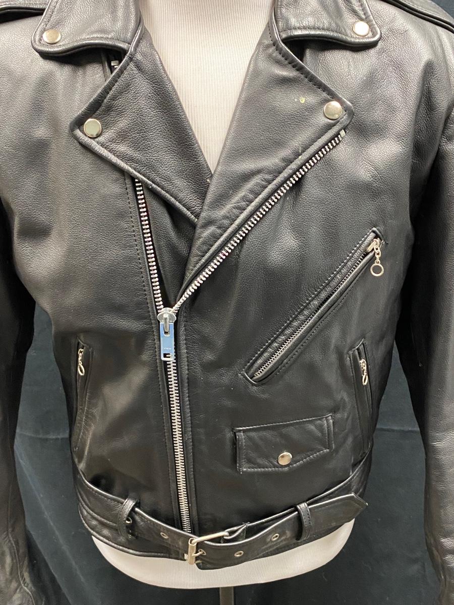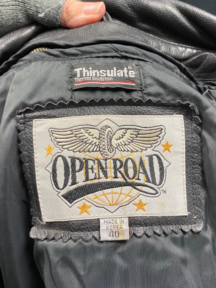 Classic black leather motorcycle jacket from Open Road. Size 40 (medium). In good worn condition. Does have a couple splatter spots, may come clean. Has removeable lining.