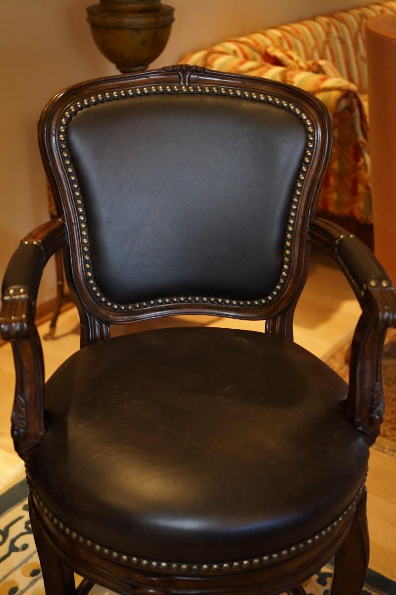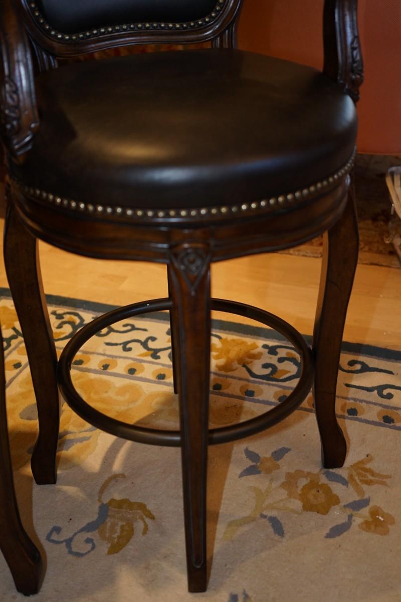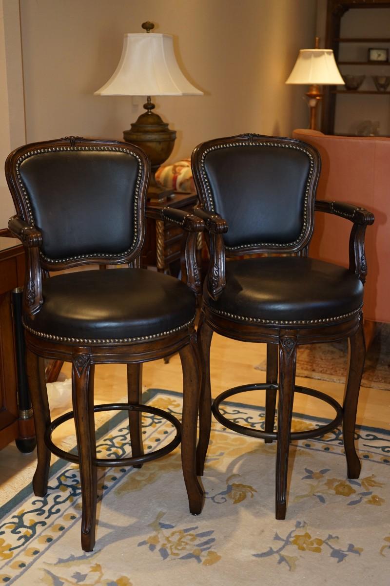 BLACK LEATHER UPHOLSTERED FRENCH STYLE CARVED FRAMED COUNTER CHAIRS