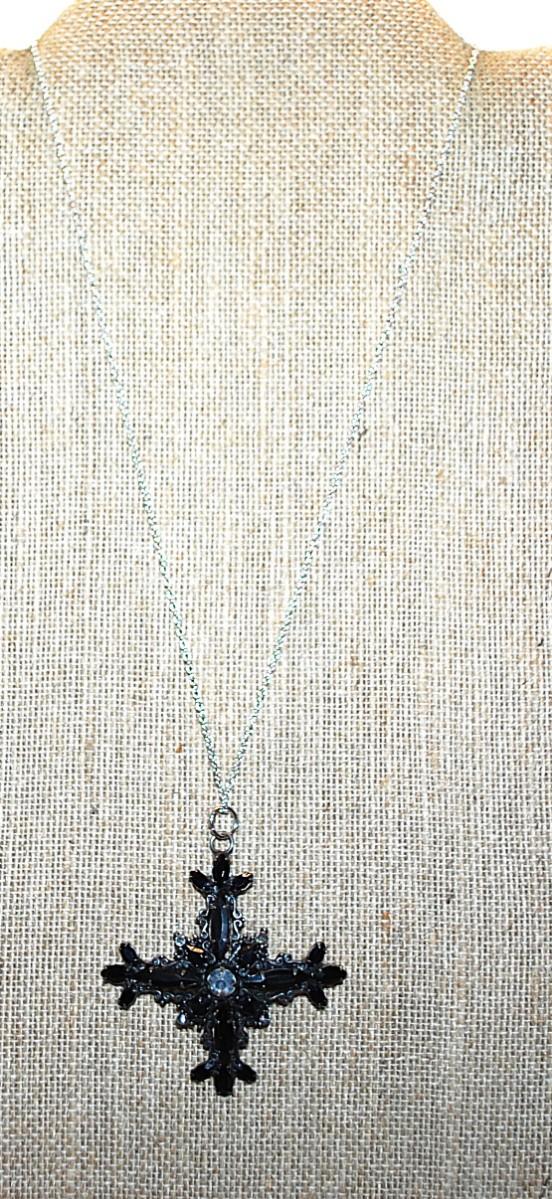 Black MALTESE CROSS NECKLACE PENDANT (2" x 2") with Black Acrylic Segments, Clear Stones & Lobster Clasp and Silver Tone Necklace Chain 18" L
