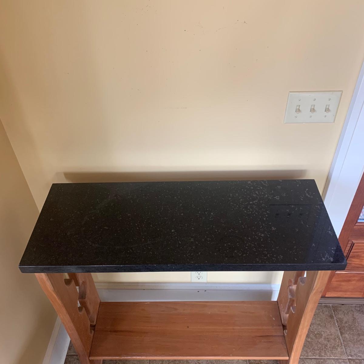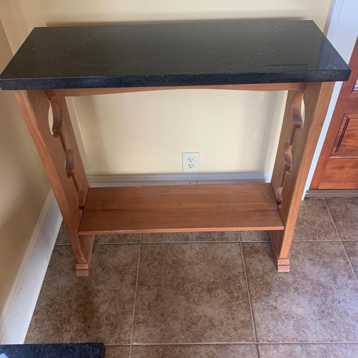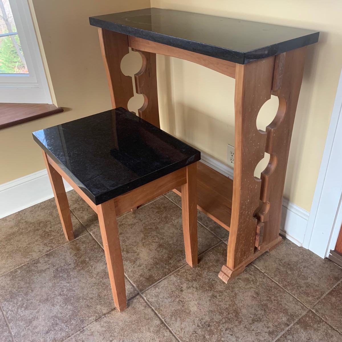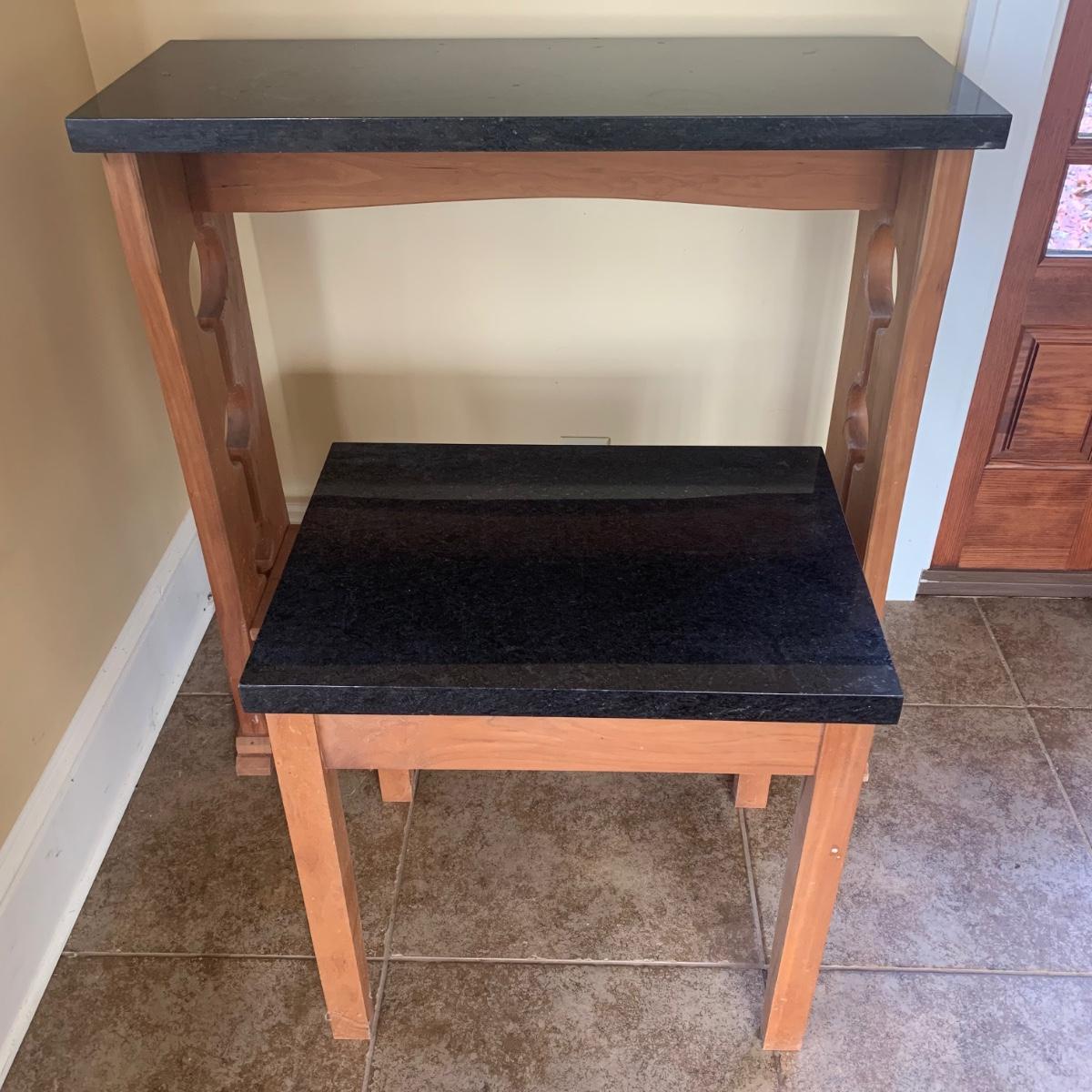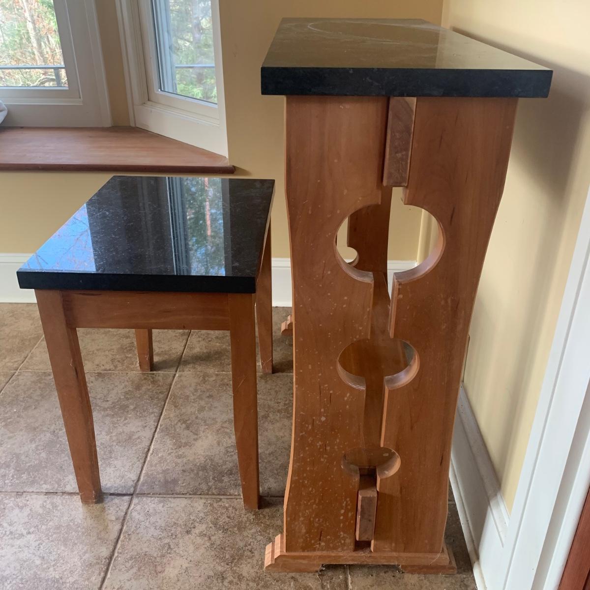 This lot includes a marble top stand with matching side table. Stand features a black marble top with circle designs carved into the wooden sides. There is a small shelf for accessories. Side table features black marble atop a wooden base. Please note that the marble is not attached to the base of the side table. Stand measures, 36”L x 14”W x 36”H. Side table measures, 22”L x 16”W x 22”H. Both items could use a bit of furniture polish, but are in good condition overall.