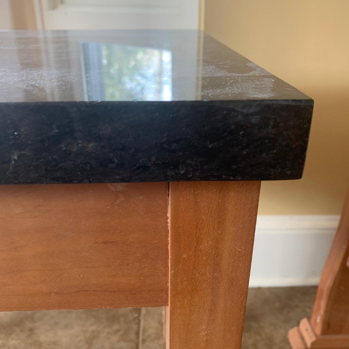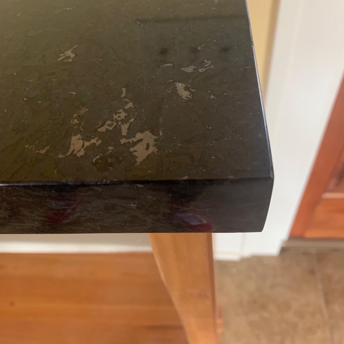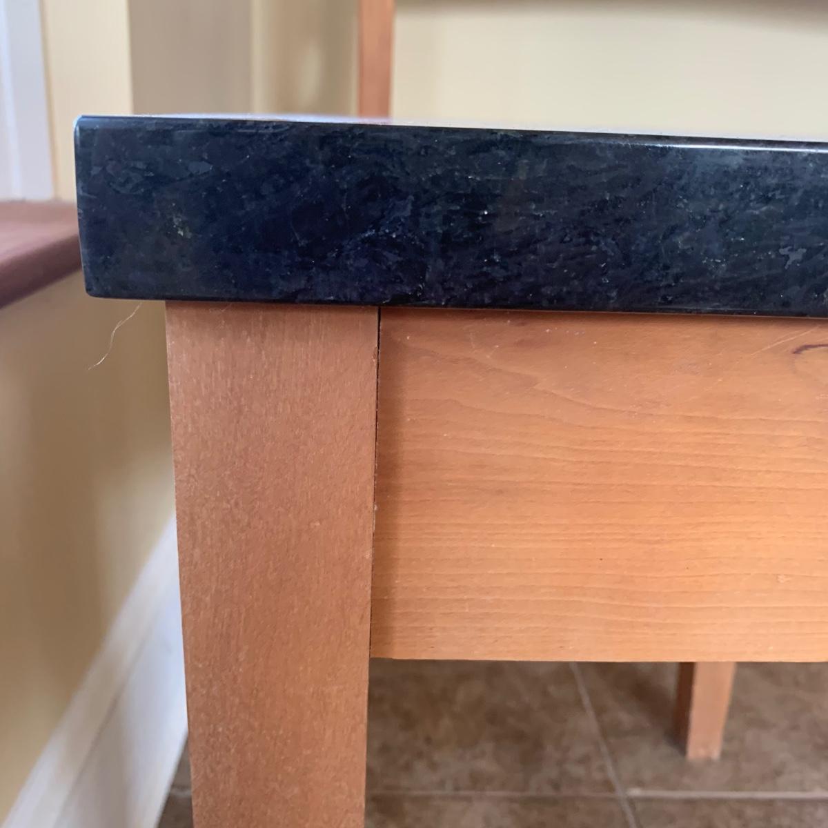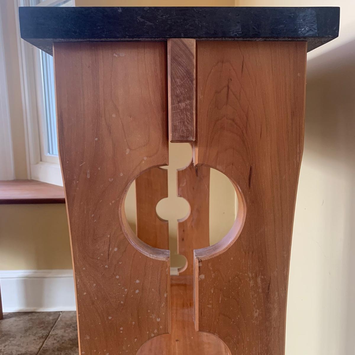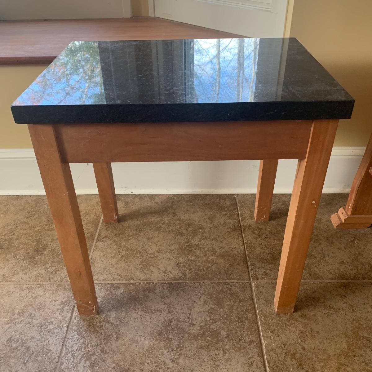 This lot includes a marble top stand with matching side table. Stand features a black marble top with circle designs carved into the wooden sides. There is a small shelf for accessories. Side table features black marble atop a wooden base. Please note that the marble is not attached to the base of the side table. Stand measures, 36”L x 14”W x 36”H. Side table measures, 22”L x 16”W x 22”H. Both items could use a bit of furniture polish, but are in good condition overall.