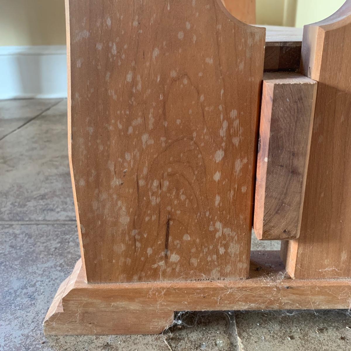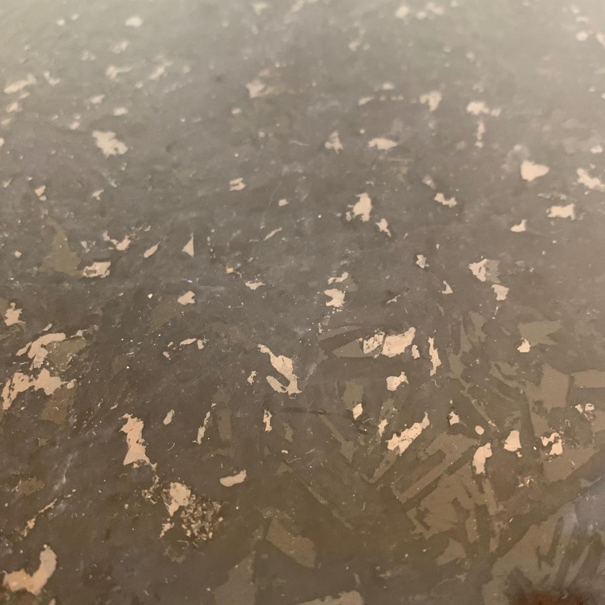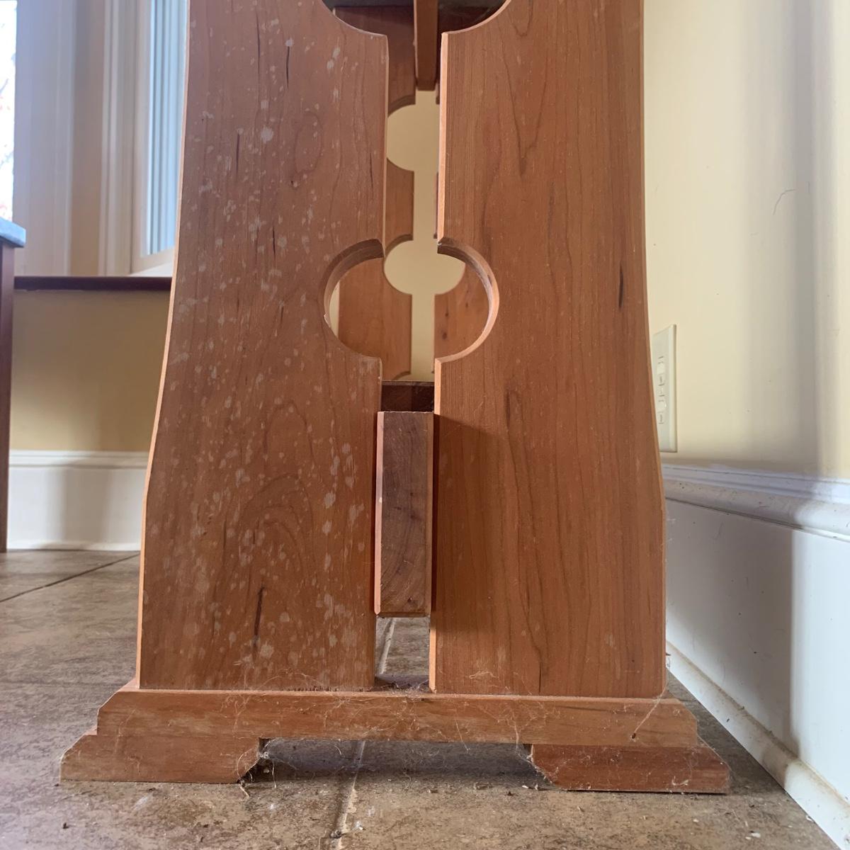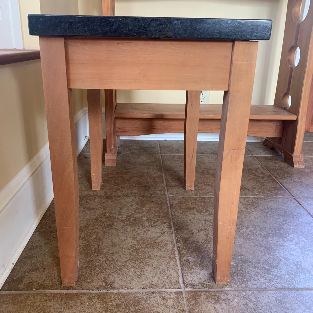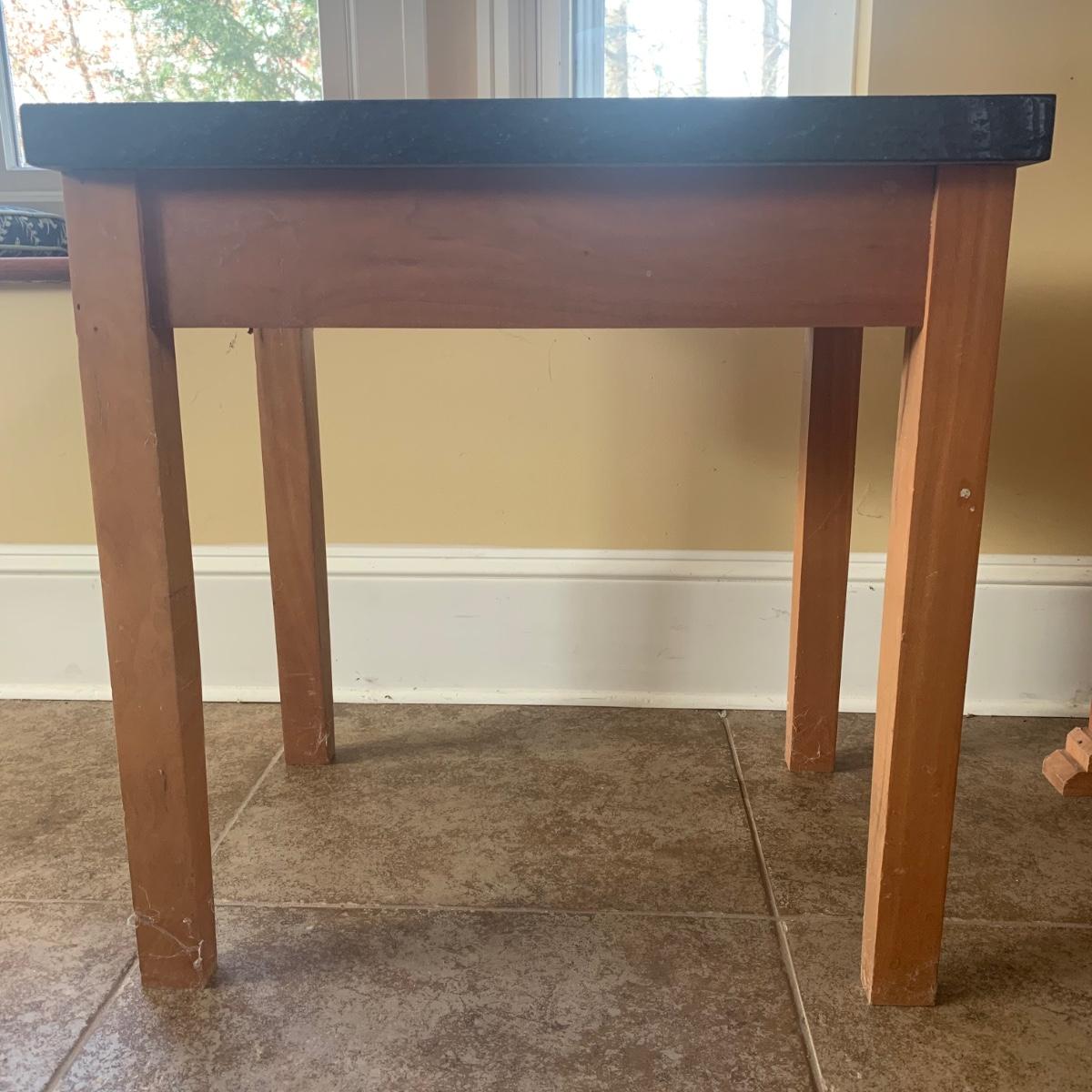 This lot includes a marble top stand with matching side table. Stand features a black marble top with circle designs carved into the wooden sides. There is a small shelf for accessories. Side table features black marble atop a wooden base. Please note that the marble is not attached to the base of the side table. Stand measures, 36”L x 14”W x 36”H. Side table measures, 22”L x 16”W x 22”H. Both items could use a bit of furniture polish, but are in good condition overall.