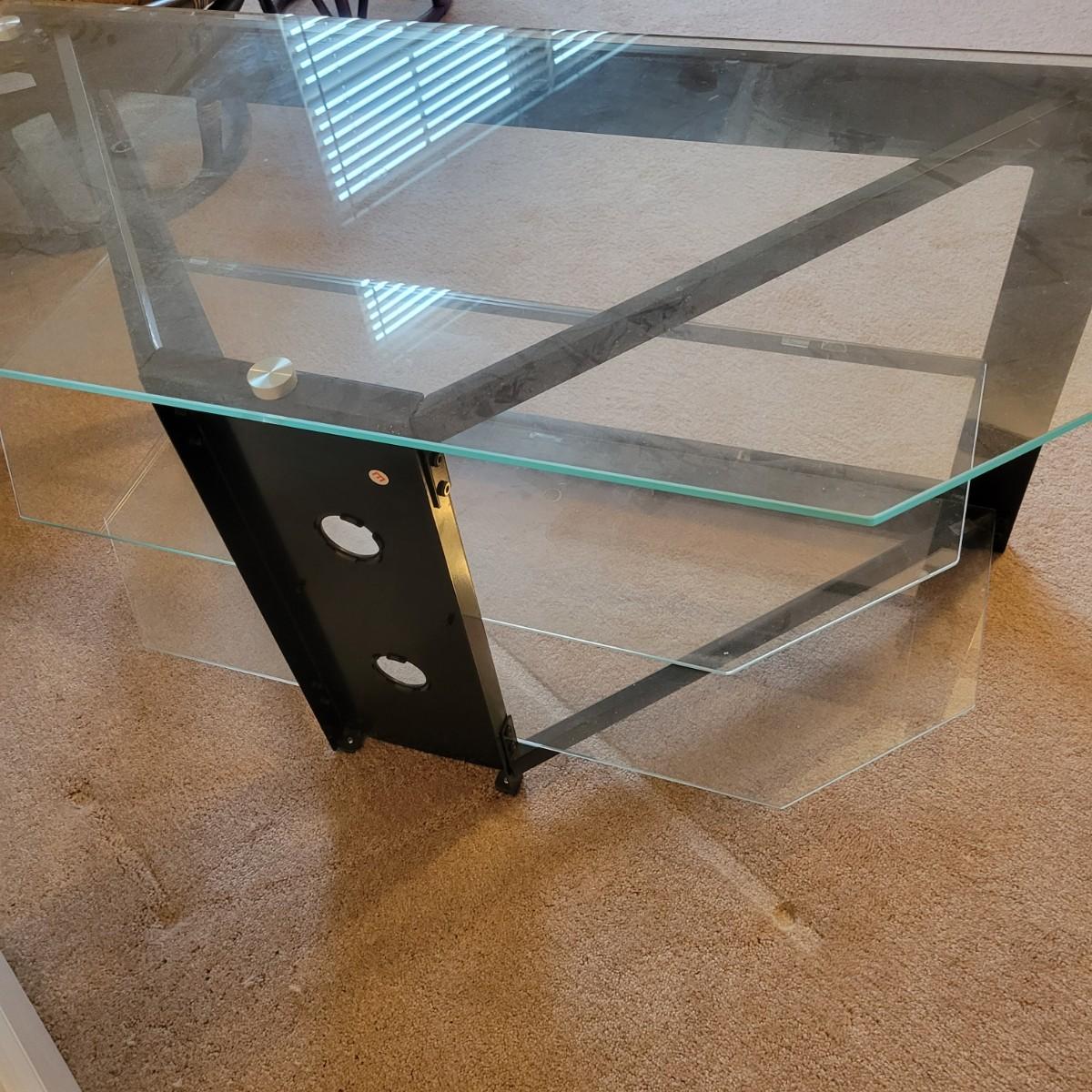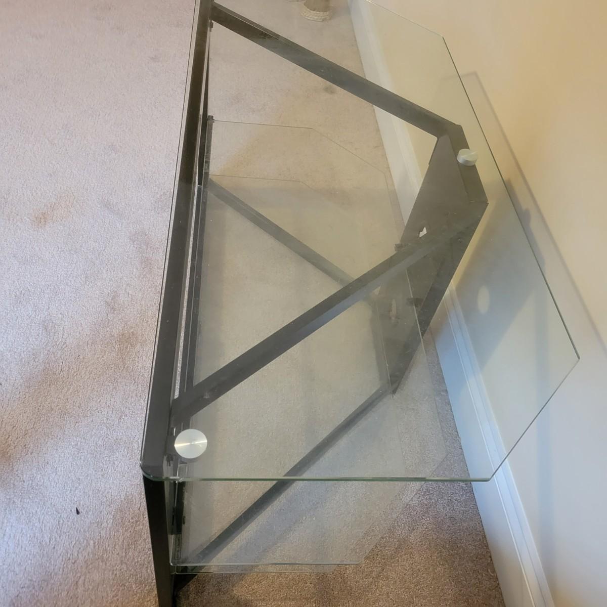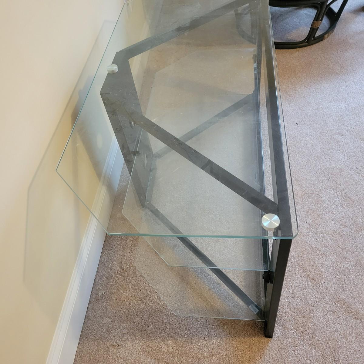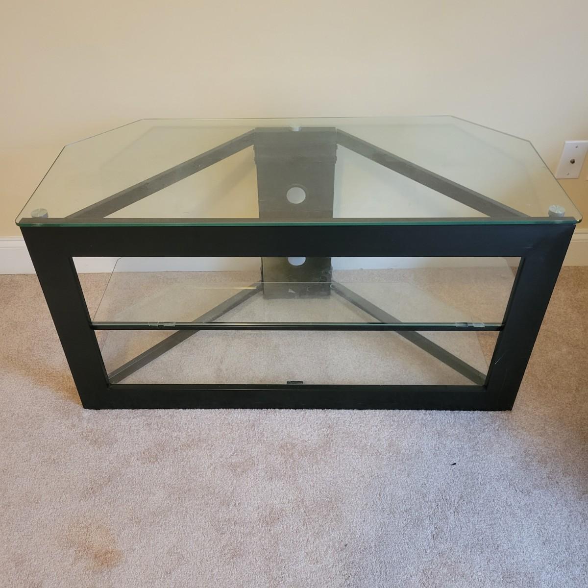 A black metal and glass TV stand with no notable damage. Designed to fit into a corner, this TV stand has three tempered glass shelves. It measures approximately 42" x 19" x 21 5"H. Local pickup only