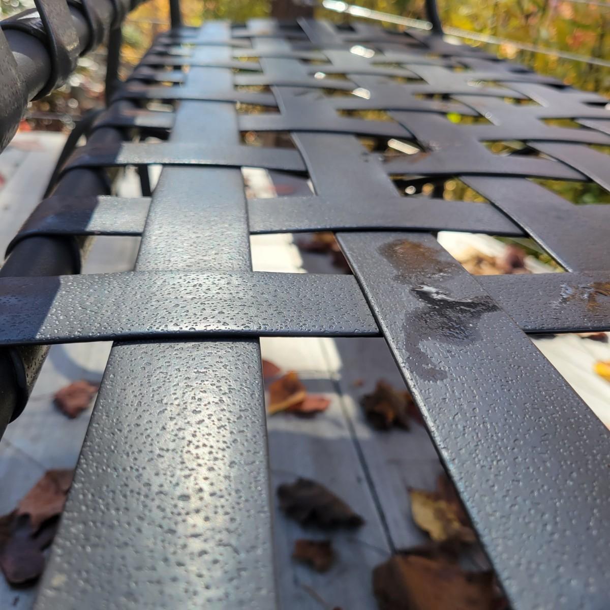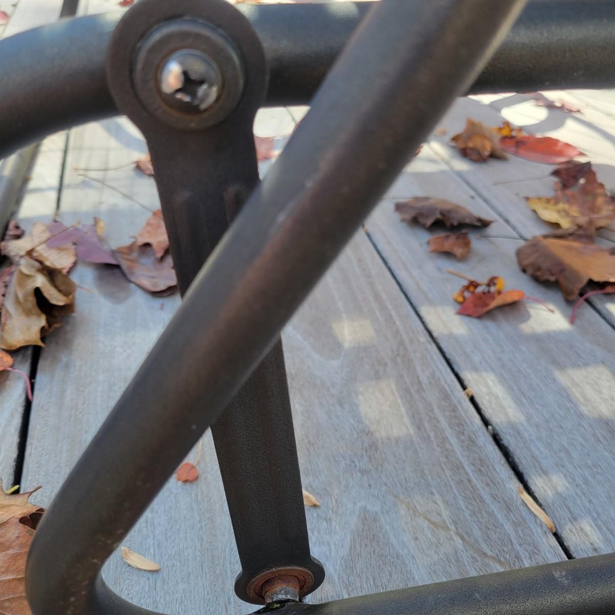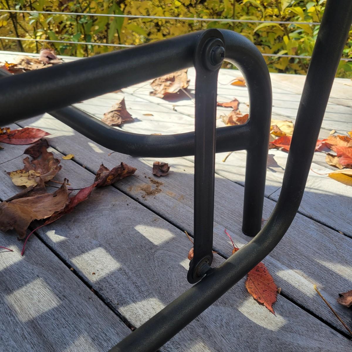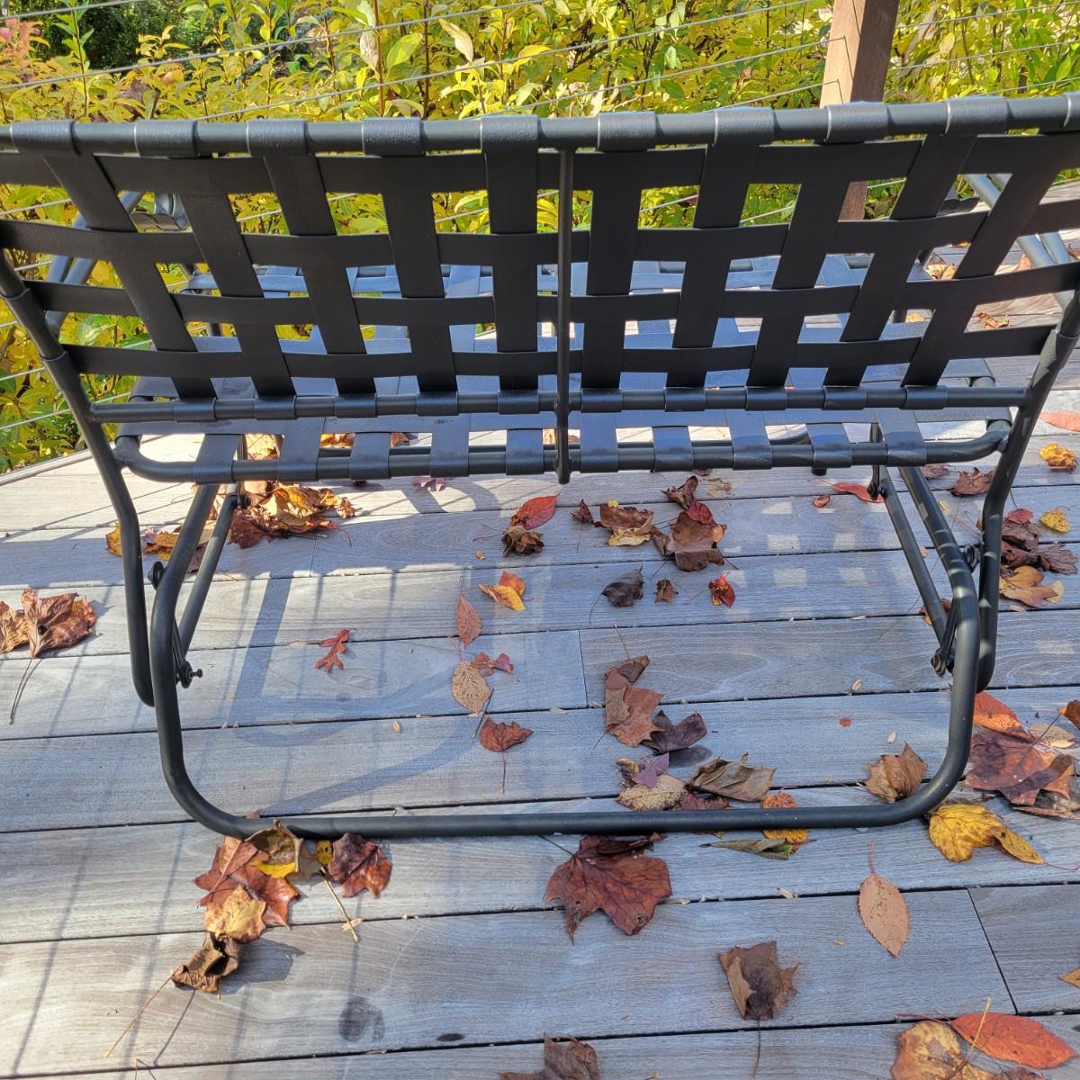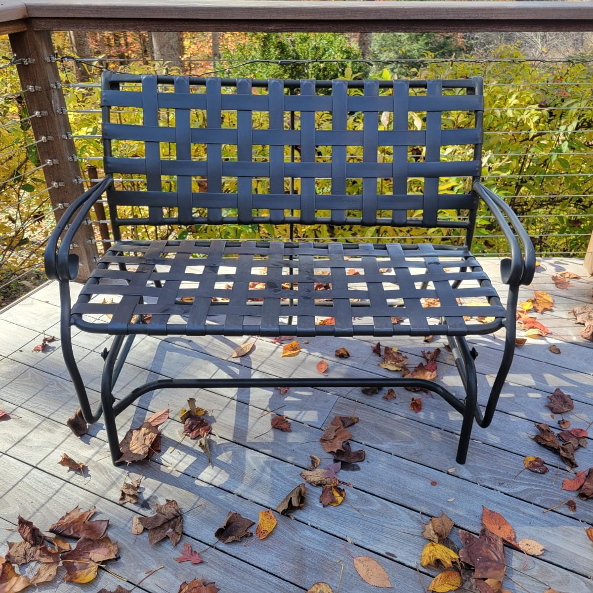A black metal and vinyl glider in good condition. This piece will comfortably sit two people and has a gliding motion for relaxation. Measures approximately 44" x 24" x 33" with a seat height of 16". There is only a very small amount of rust found around the screws.