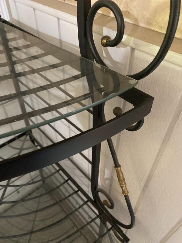 Corner style black metal bakers rack. 4 glass shelves. About 7’ tall.