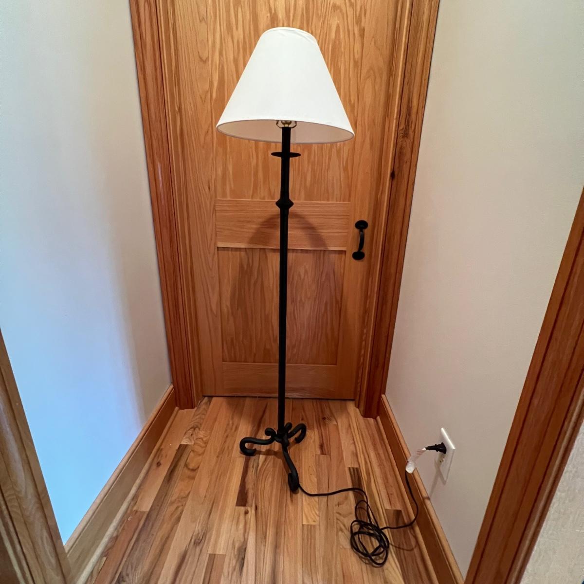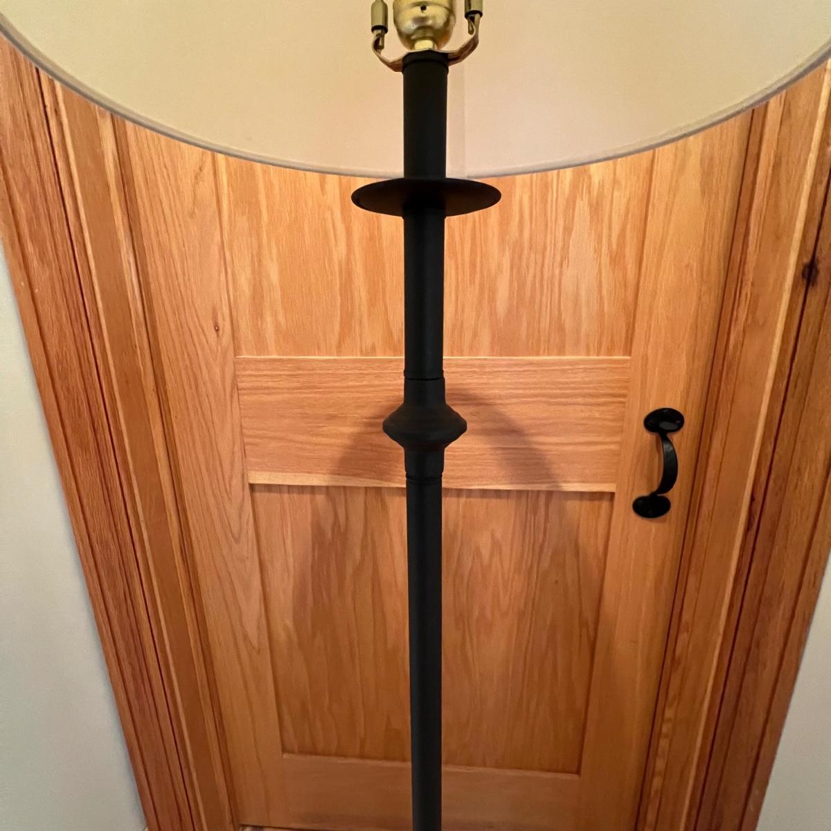 This floor lamp has a sturdy black metal body and has a three way switch. The ivory shade has some light discoloration which is mainly noticeable when lamp is on, see pics.