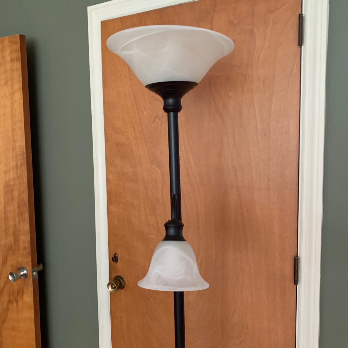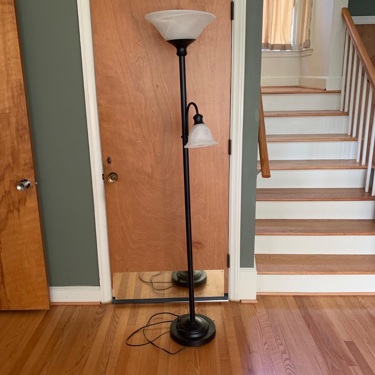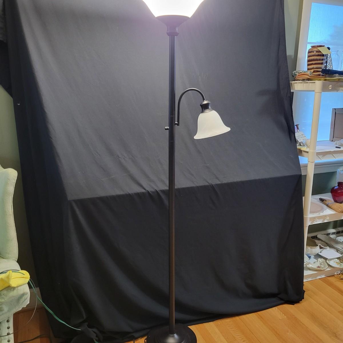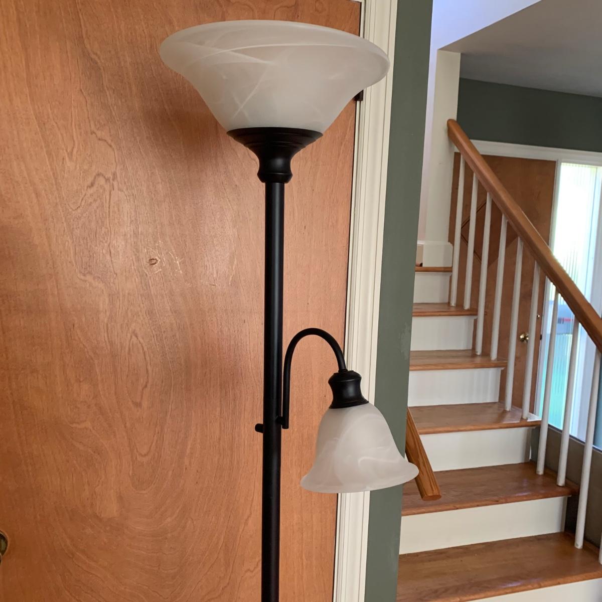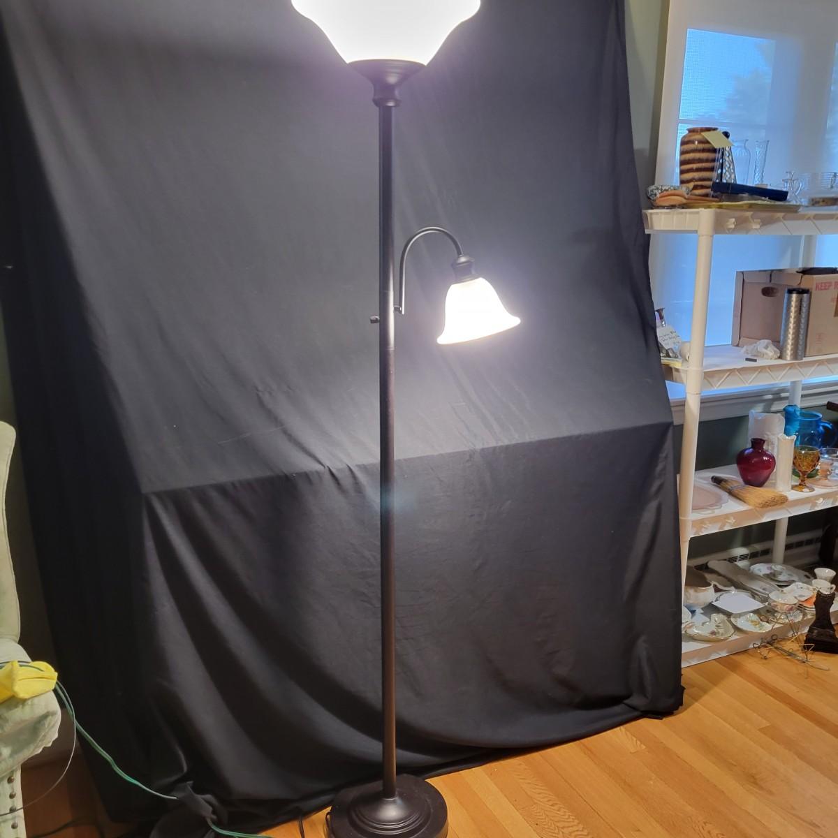 A black metal floor lamp with two lights in good condition. This lamp is made of a heavier guage metal for its base and stem. Lamps can be turned on independently and feature smoke swirl glass shades. Measures approximately 11" x 71". Local pickup only
