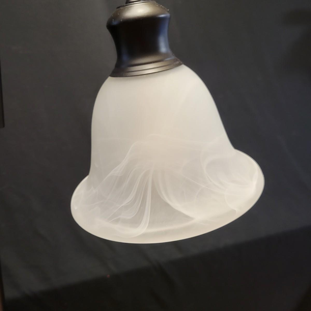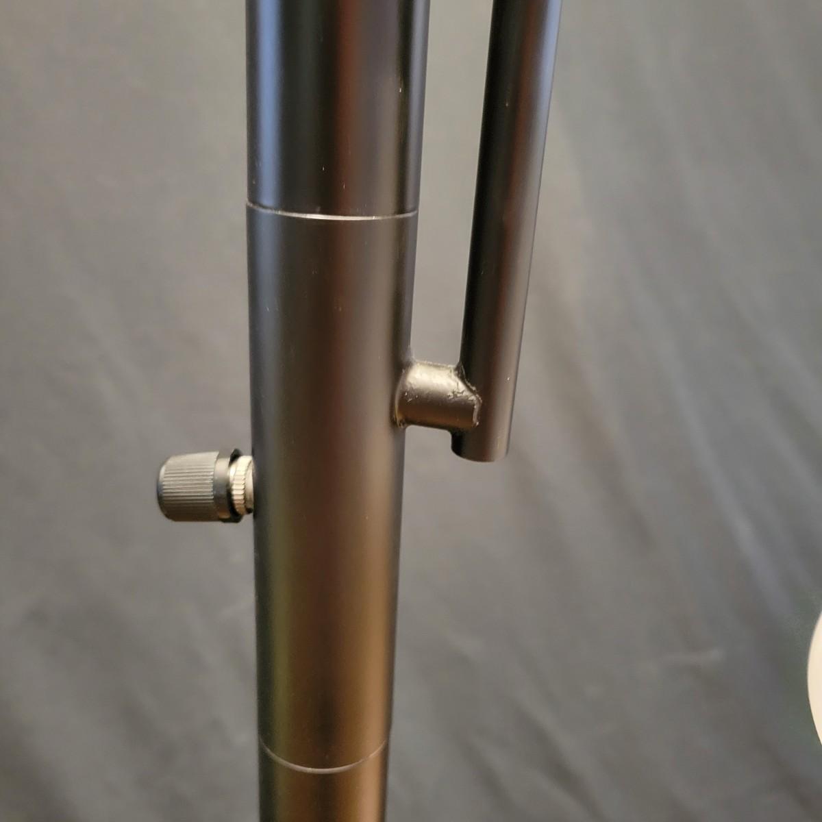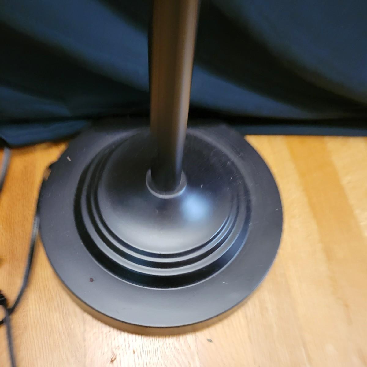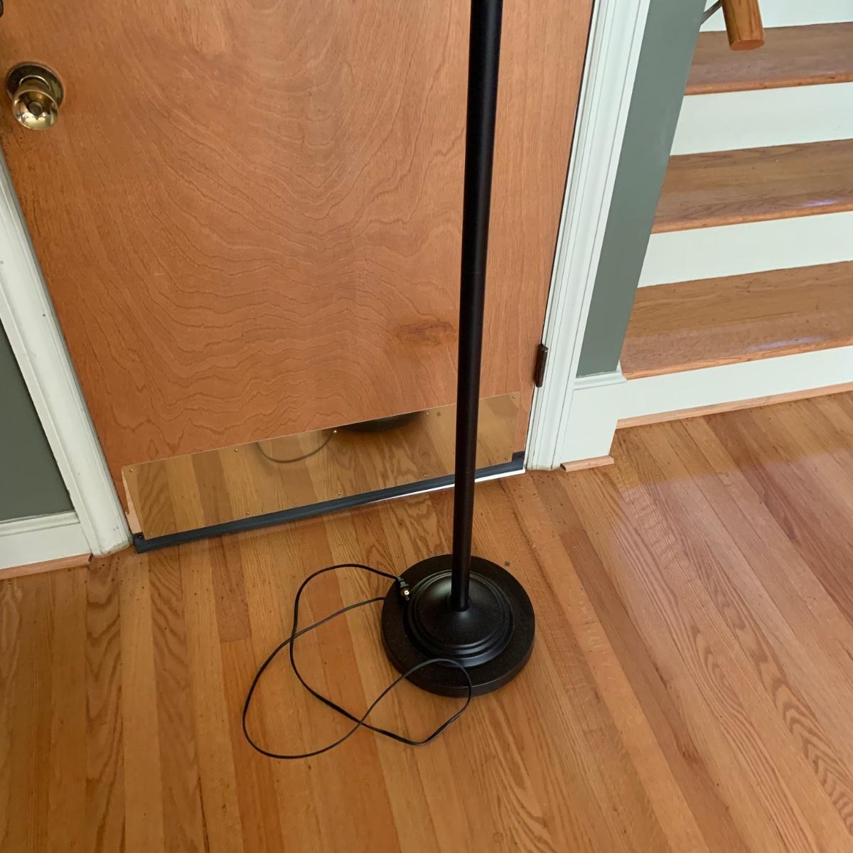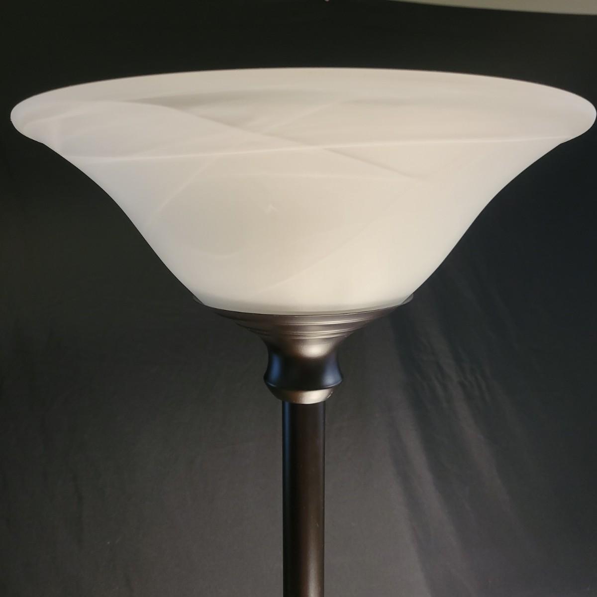 A black metal floor lamp with two lights in good condition. This lamp is made of a heavier guage metal for its base and stem. Lamps can be turned on independently and feature smoke swirl glass shades. Measures approximately 11" x 71". Local pickup only