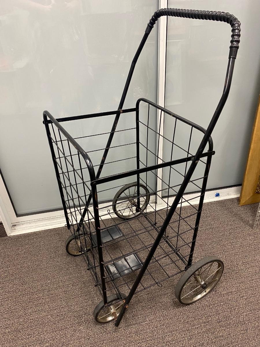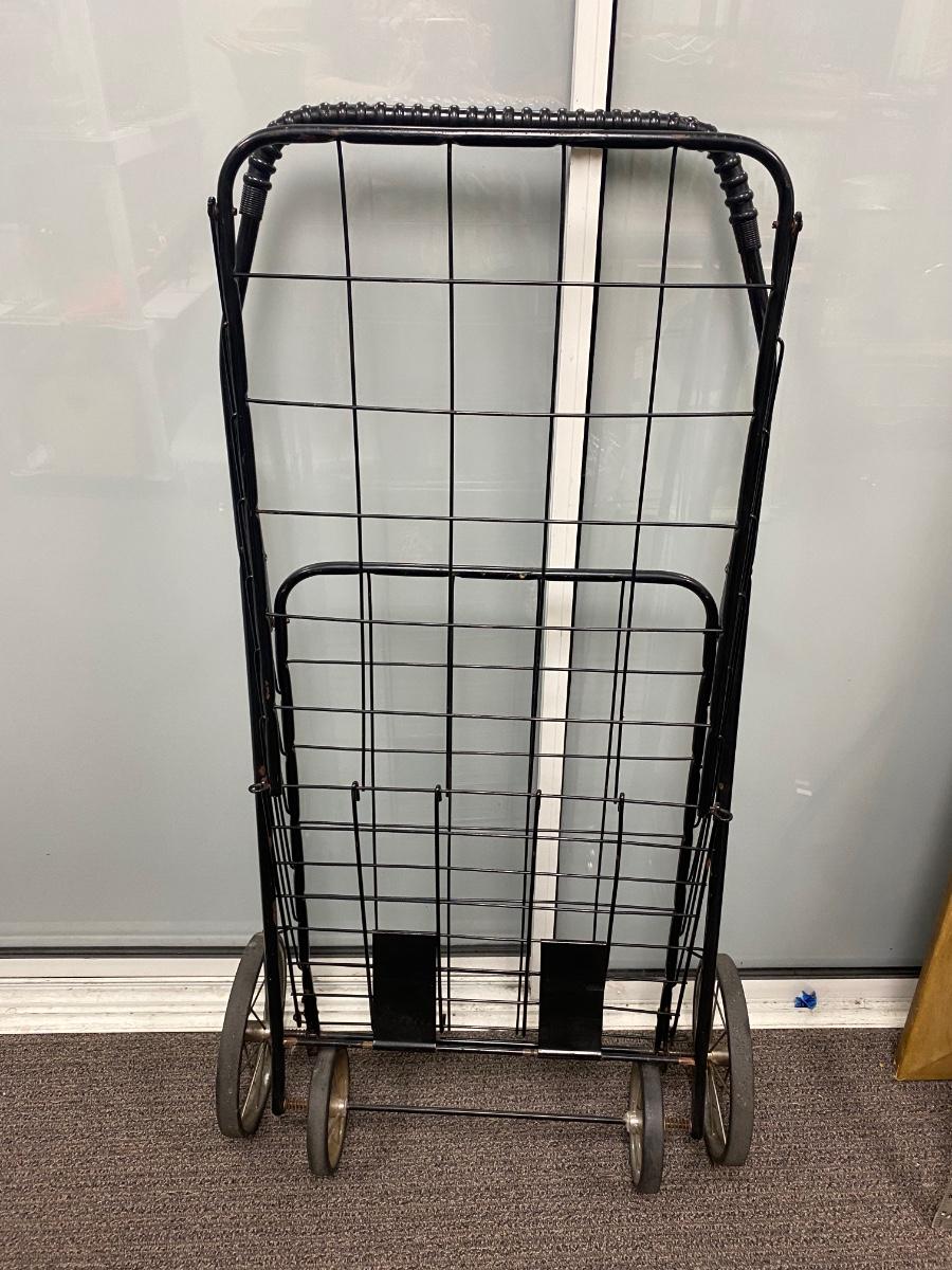 Black Metal Folding Rolling Cart. In used condition, folds easily, rolls ok.