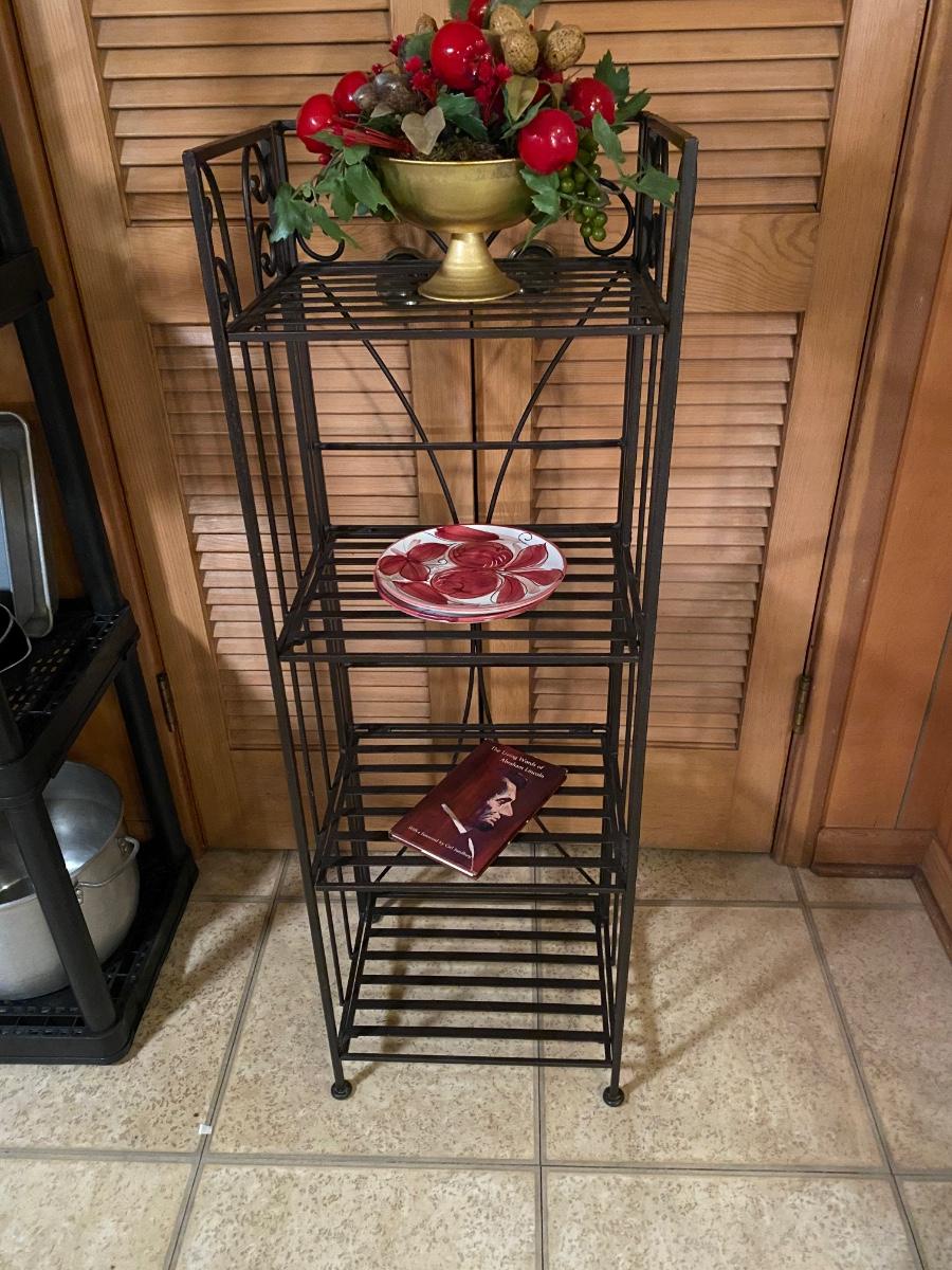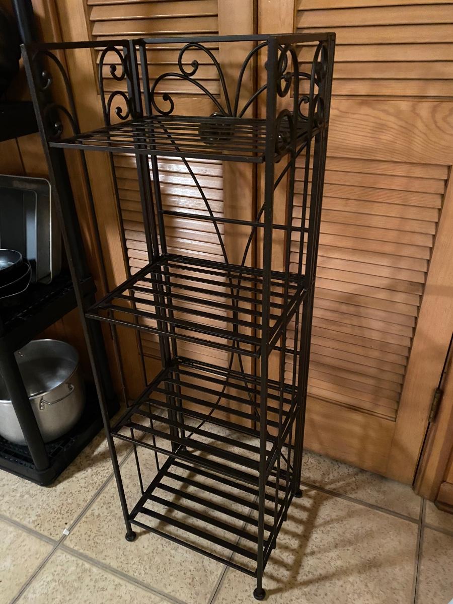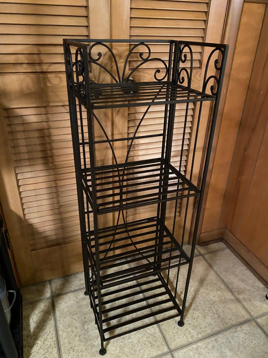 Black metal folding shelf. Approx 14”w x 11-1/2”d x 42-1/2”h. Excellent condition