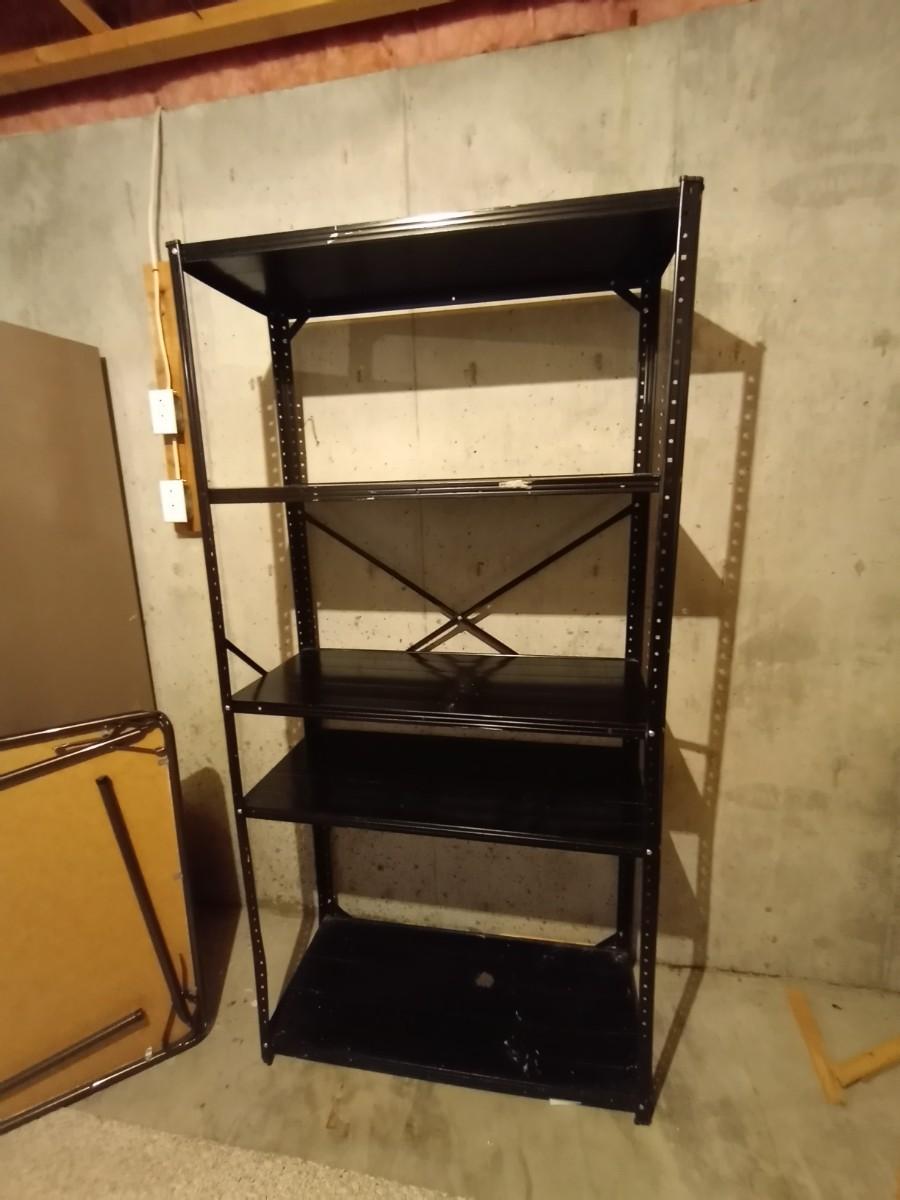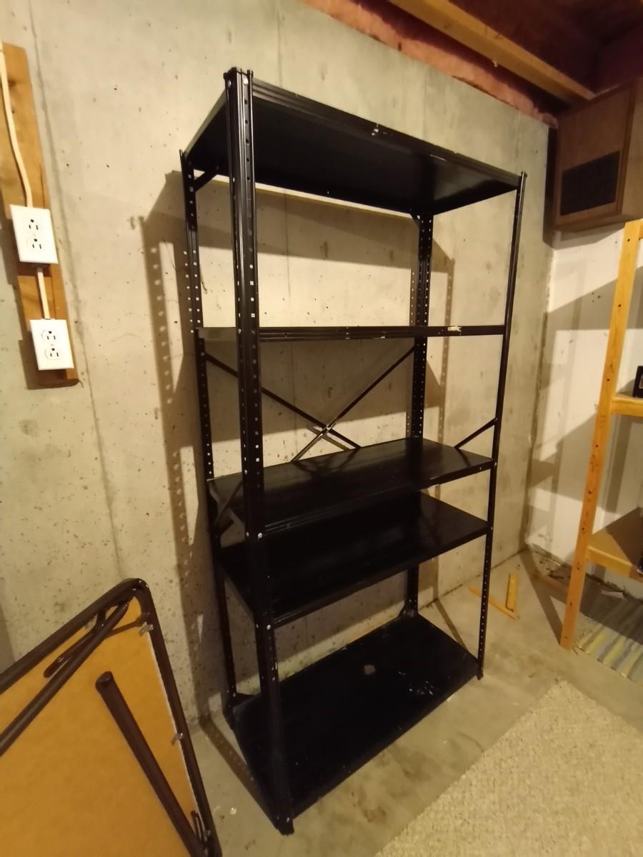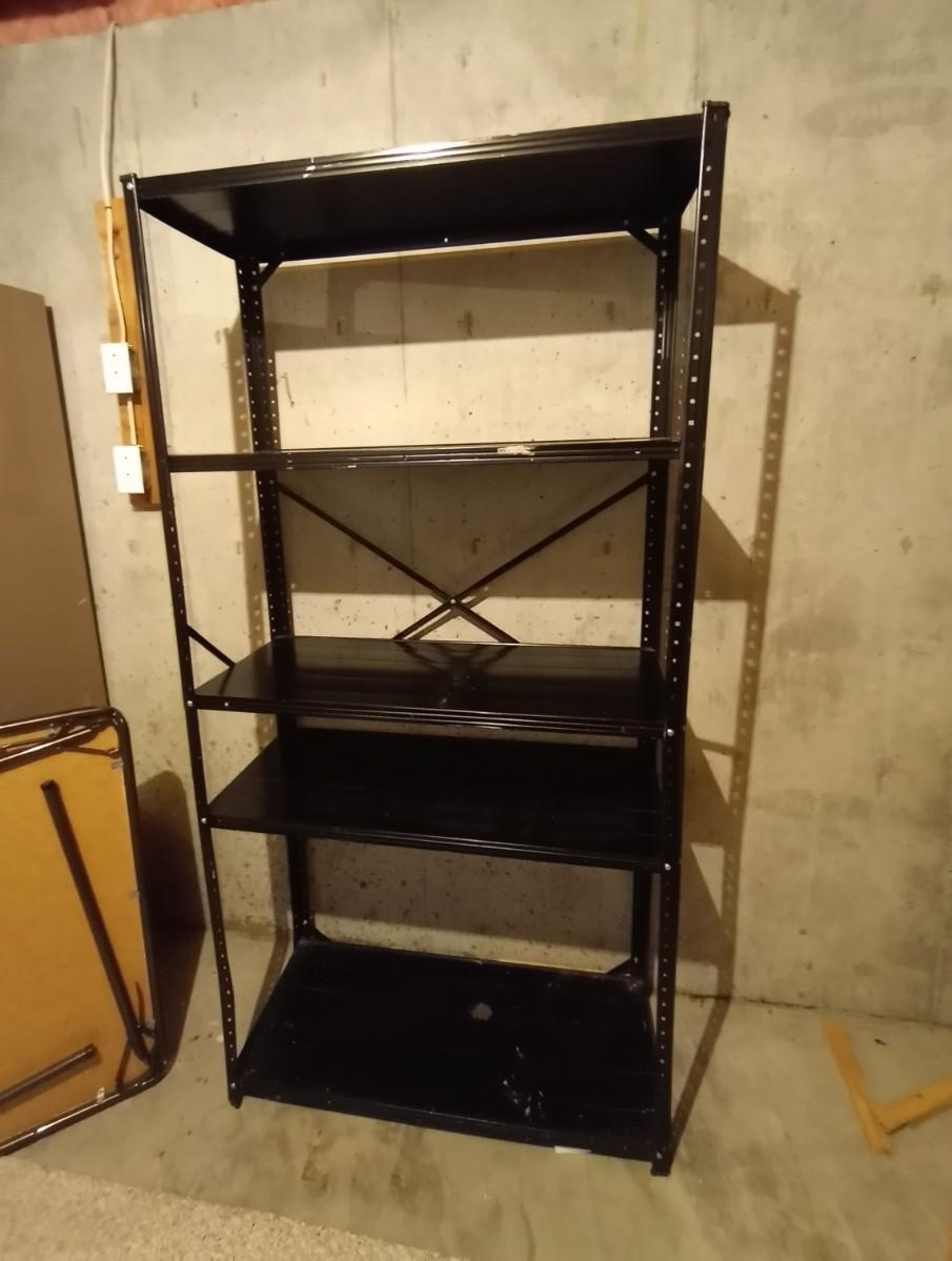 BLACK METAL FOUR SHELVES UNIT APPROX. 36X16X71 AND PAINTED WOODEN FOUR DRAWER CHEST OF DRAWER APPROX. 30X14X43