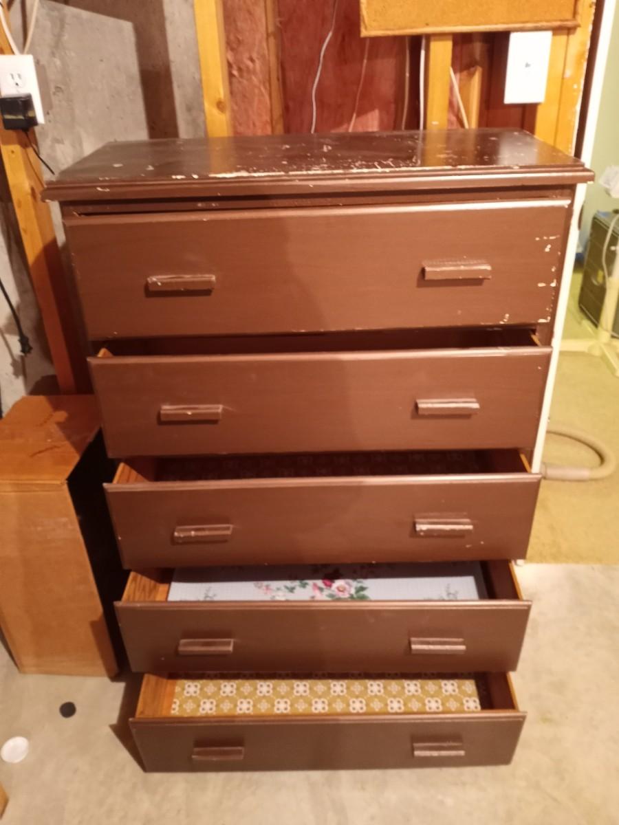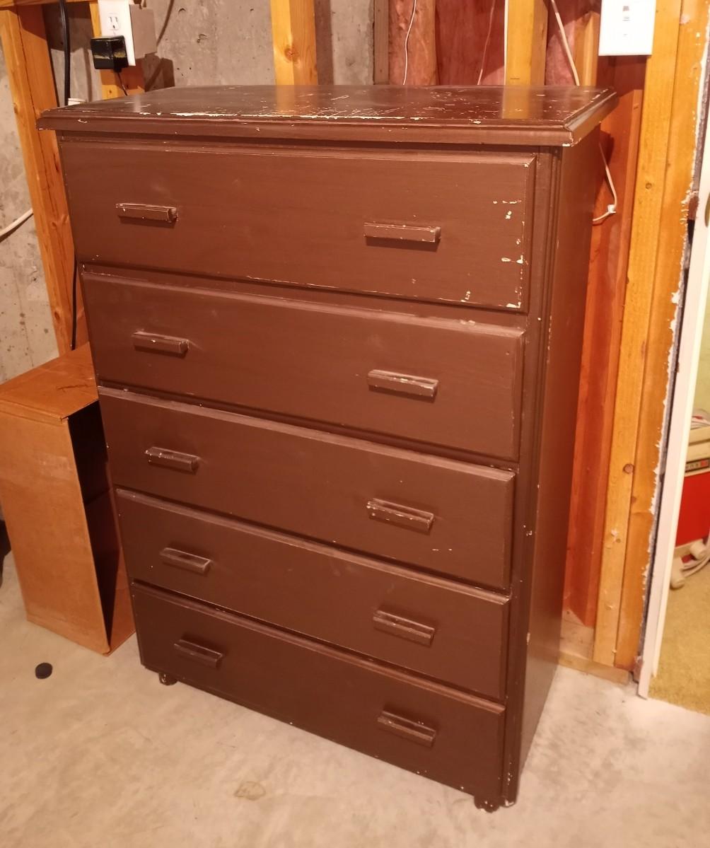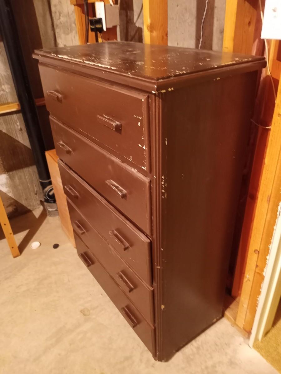 BLACK METAL FOUR SHELVES UNIT APPROX. 36X16X71 AND PAINTED WOODEN FOUR DRAWER CHEST OF DRAWER APPROX. 30X14X43