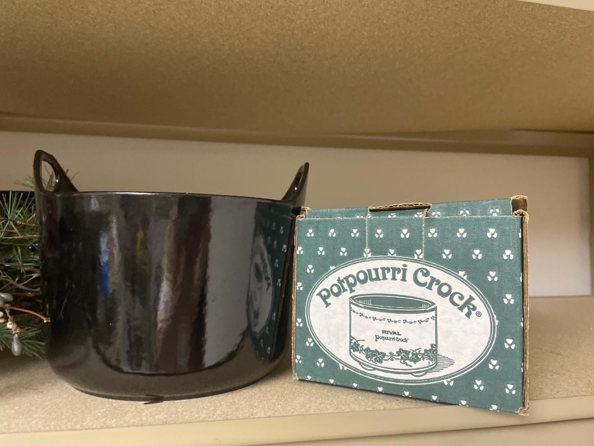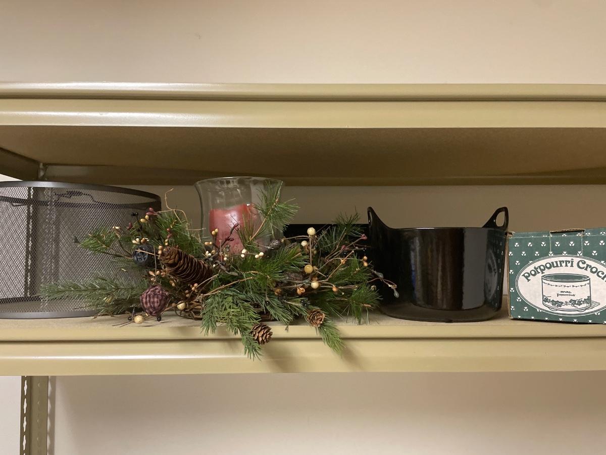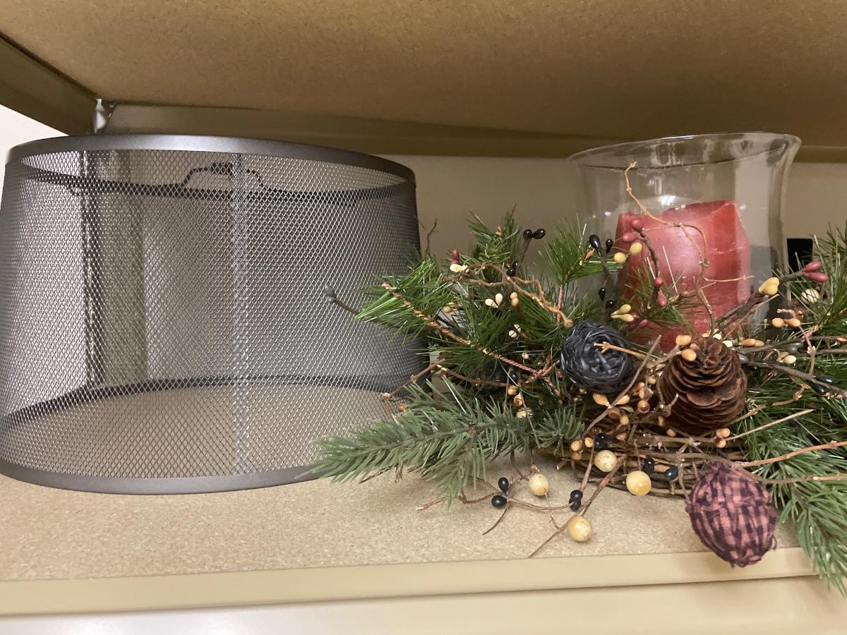 Black metal lampshade, crocs, and Christmas decor