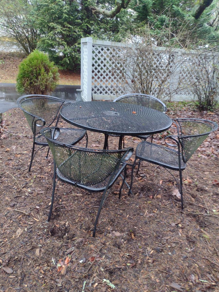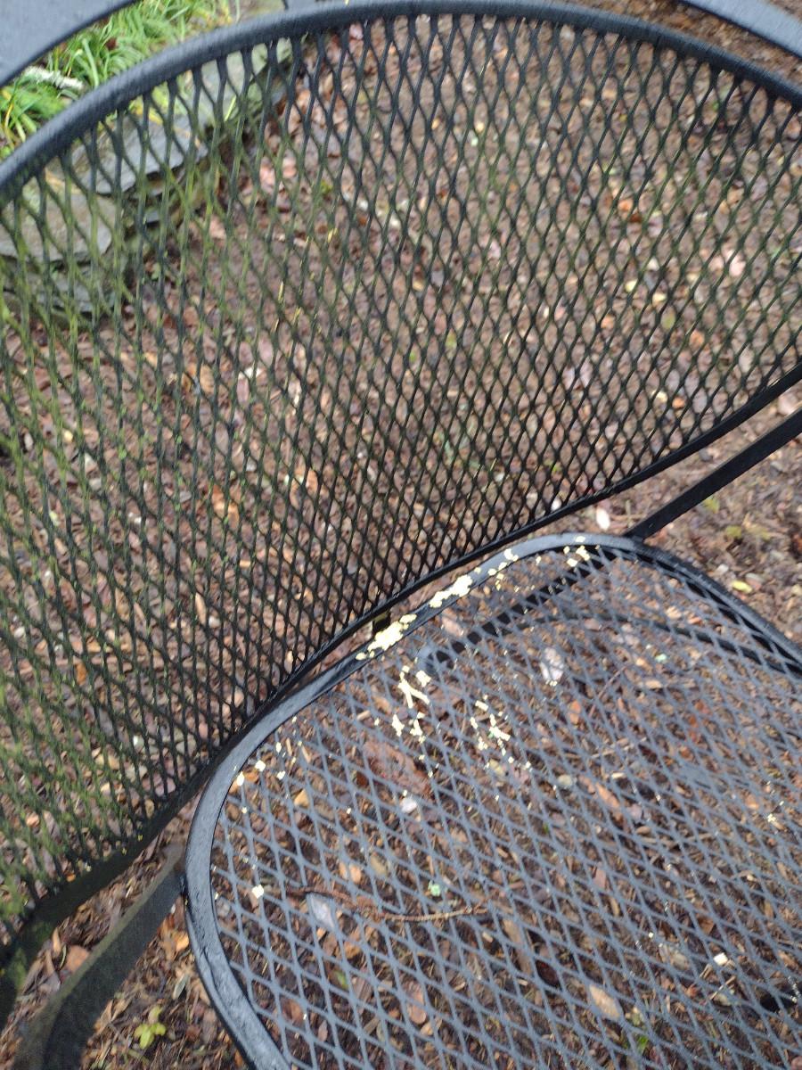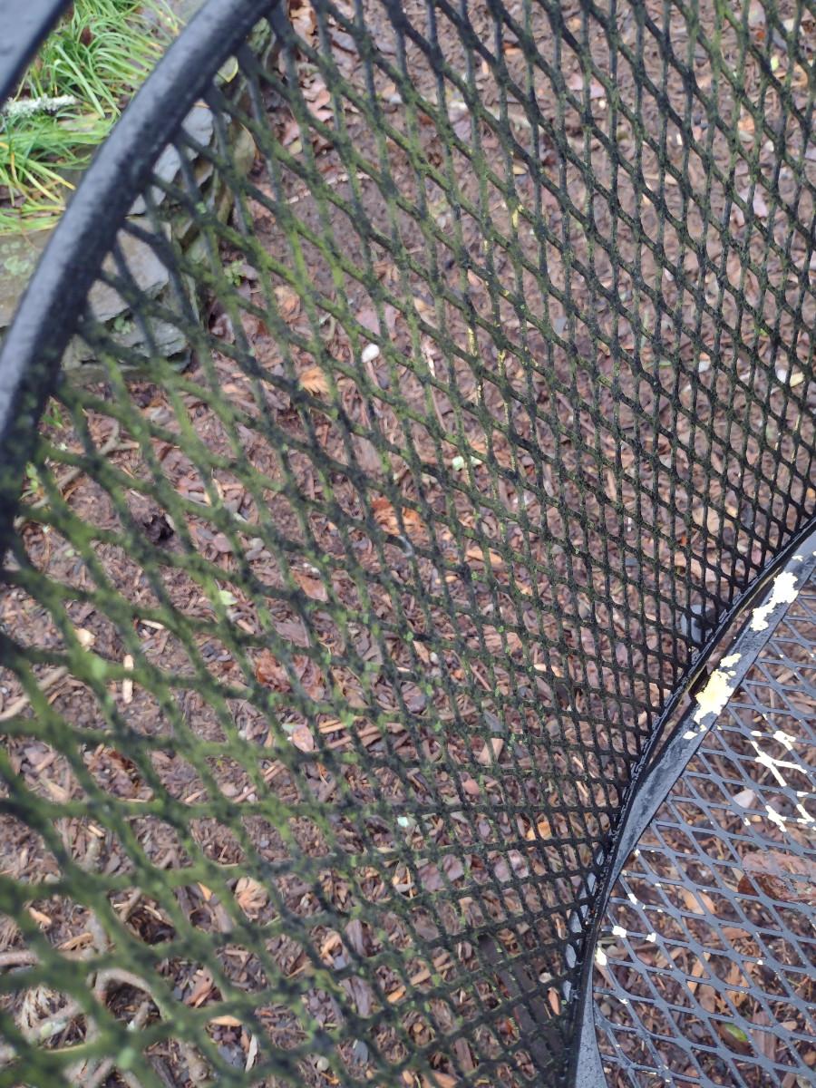 Black Metal Mesh Outdoor Table and Four Chairs. Table is approx 41" in diameter.