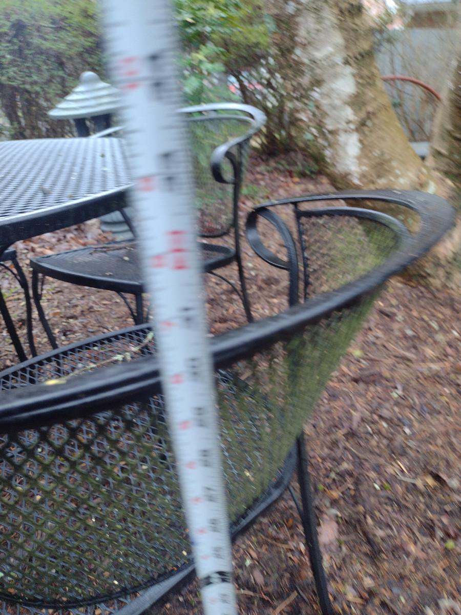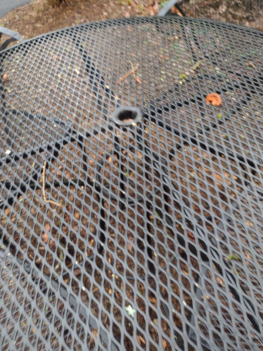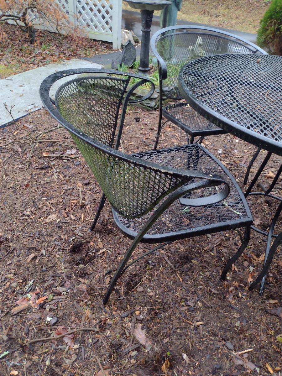 Black Metal Mesh Outdoor Table and Four Chairs. Table is approx 41" in diameter.