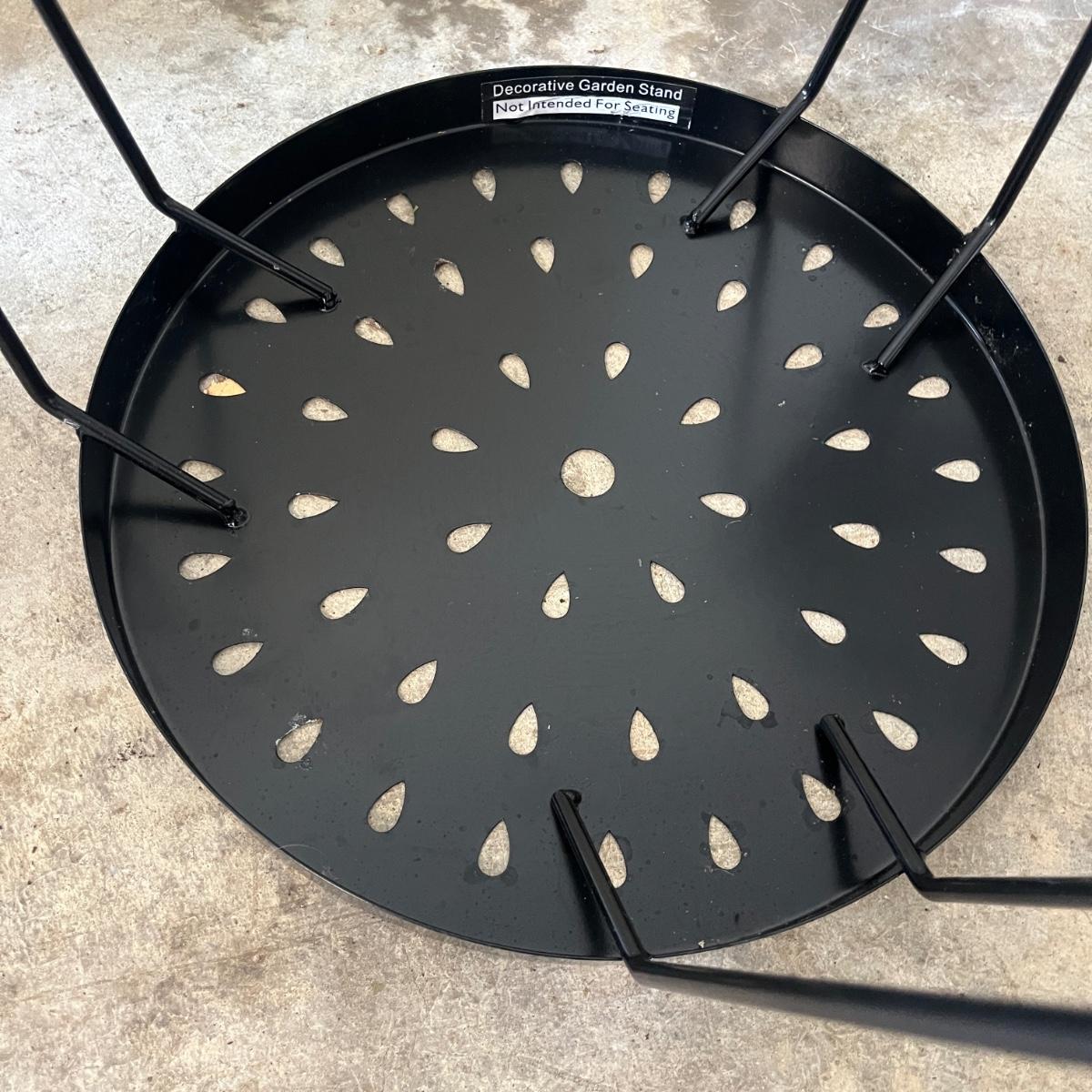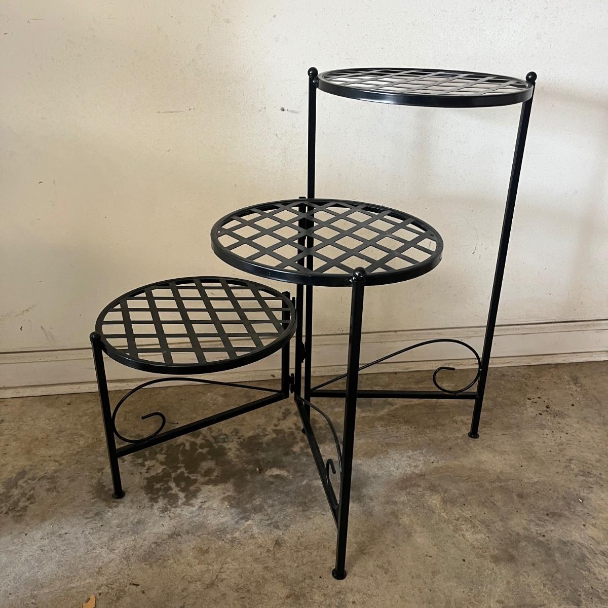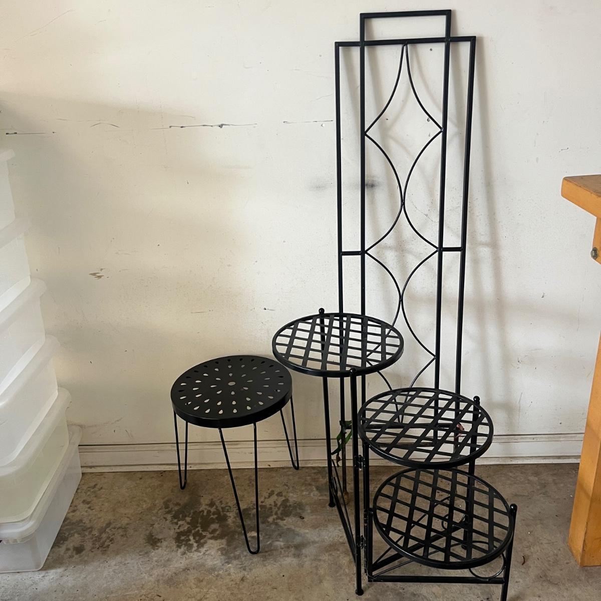 Lot includes a black metal trellis, metal folding three plant stand and a single metal plant stand. Three plant stand measures 26” x 17” x 24”H when opened. Local pickup only.