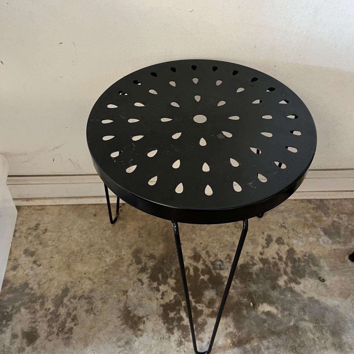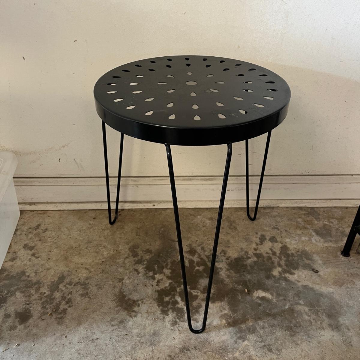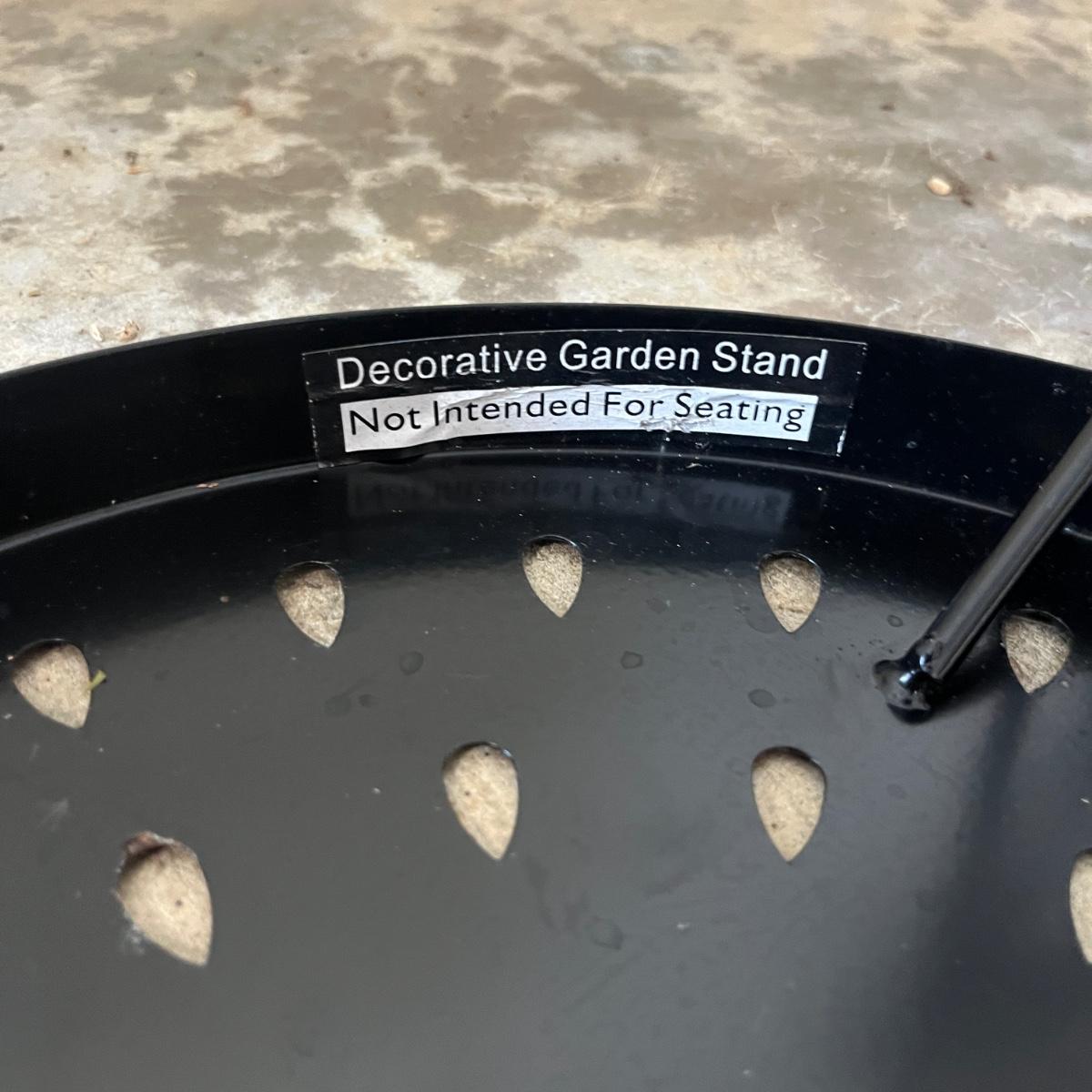 Lot includes a black metal trellis, metal folding three plant stand and a single metal plant stand. Three plant stand measures 26” x 17” x 24”H when opened. Local pickup only.
