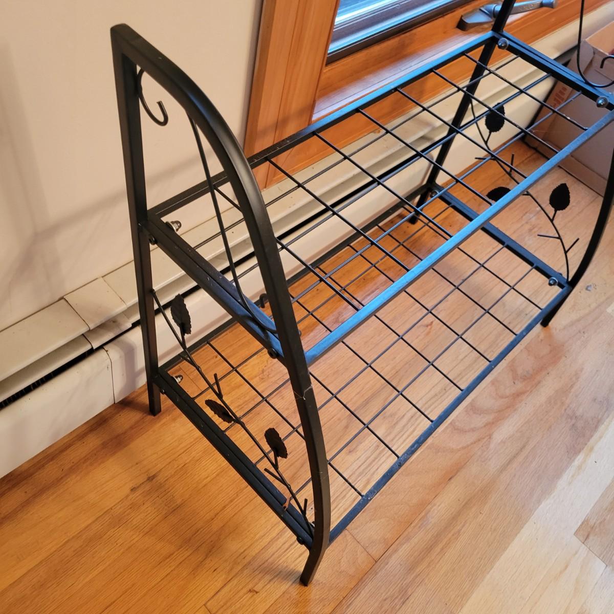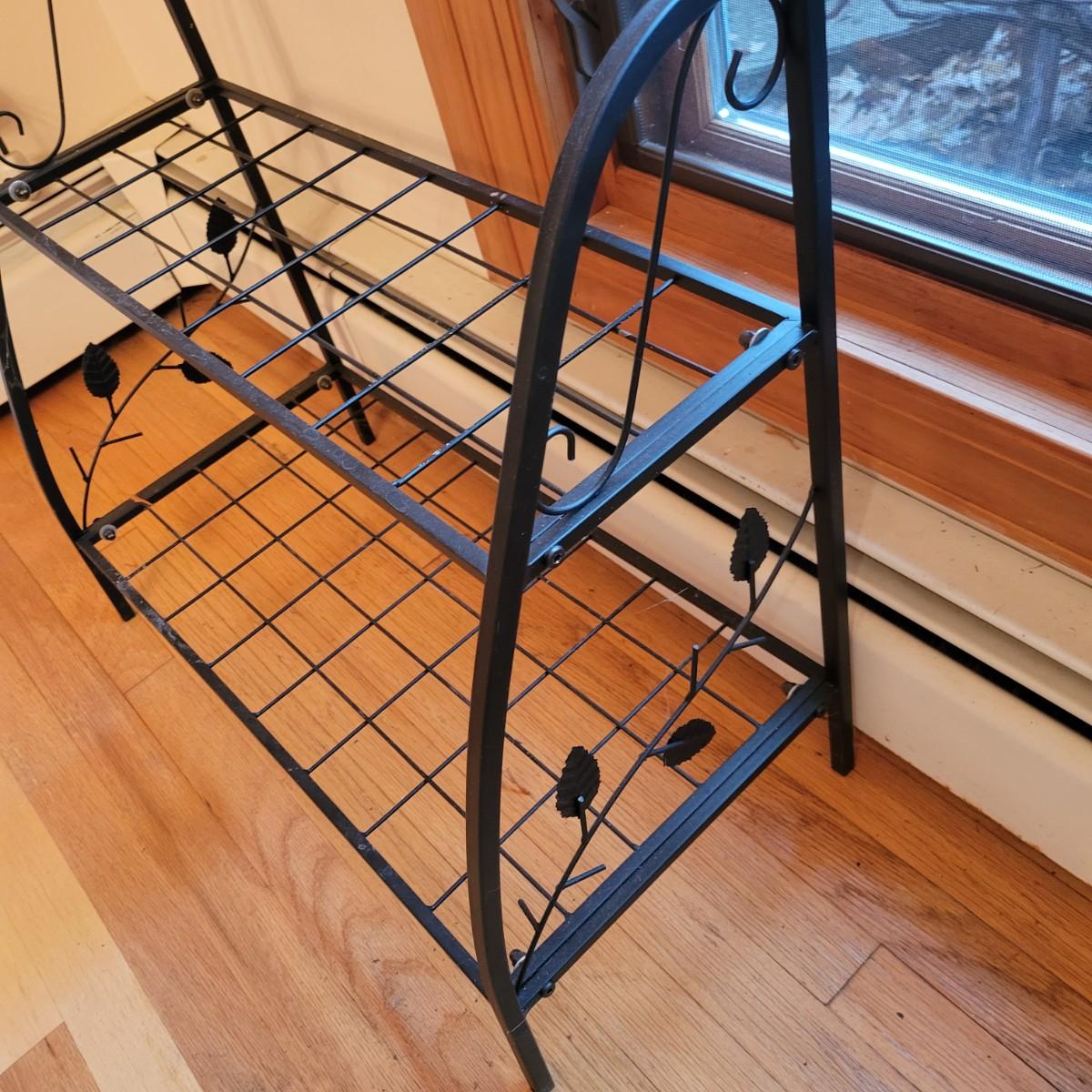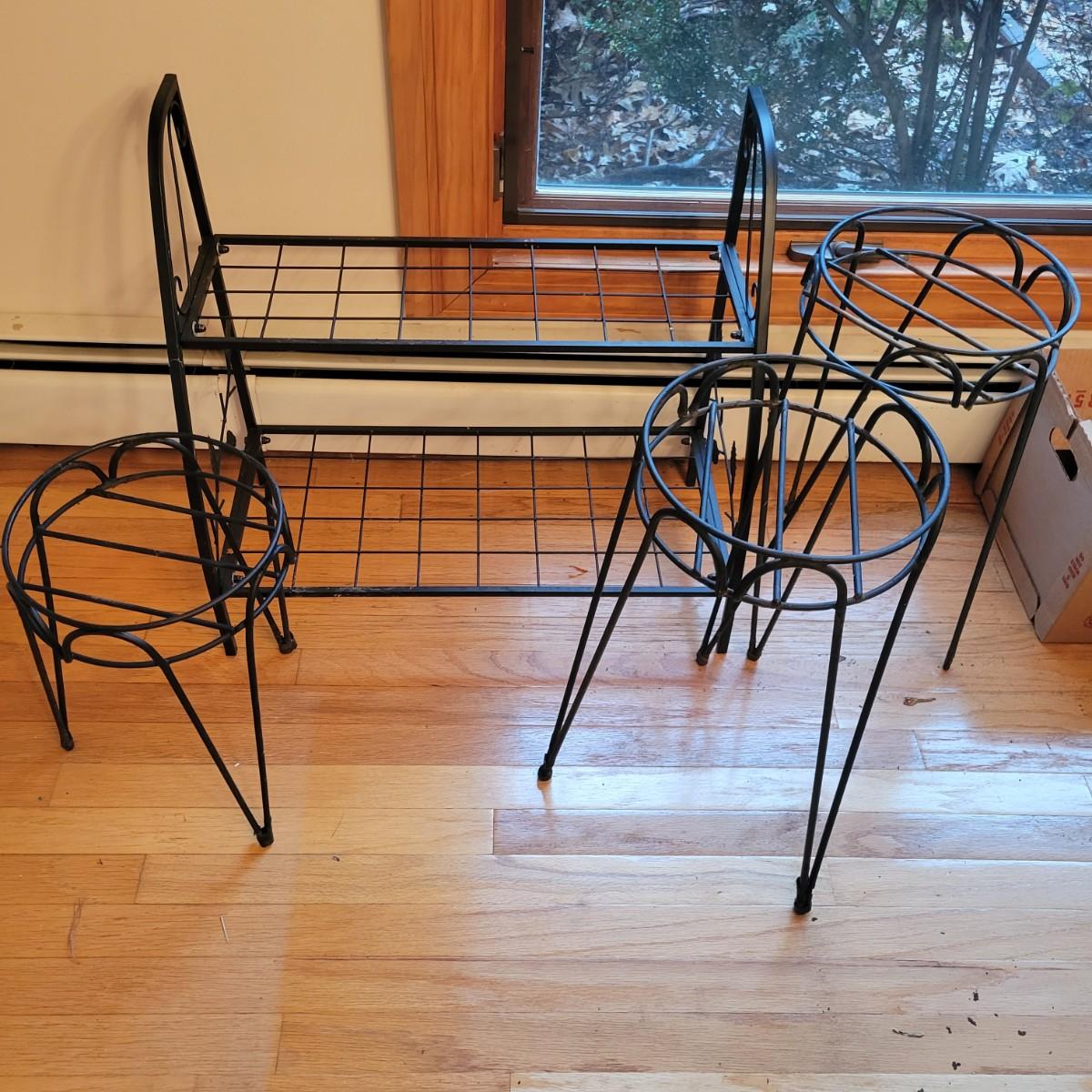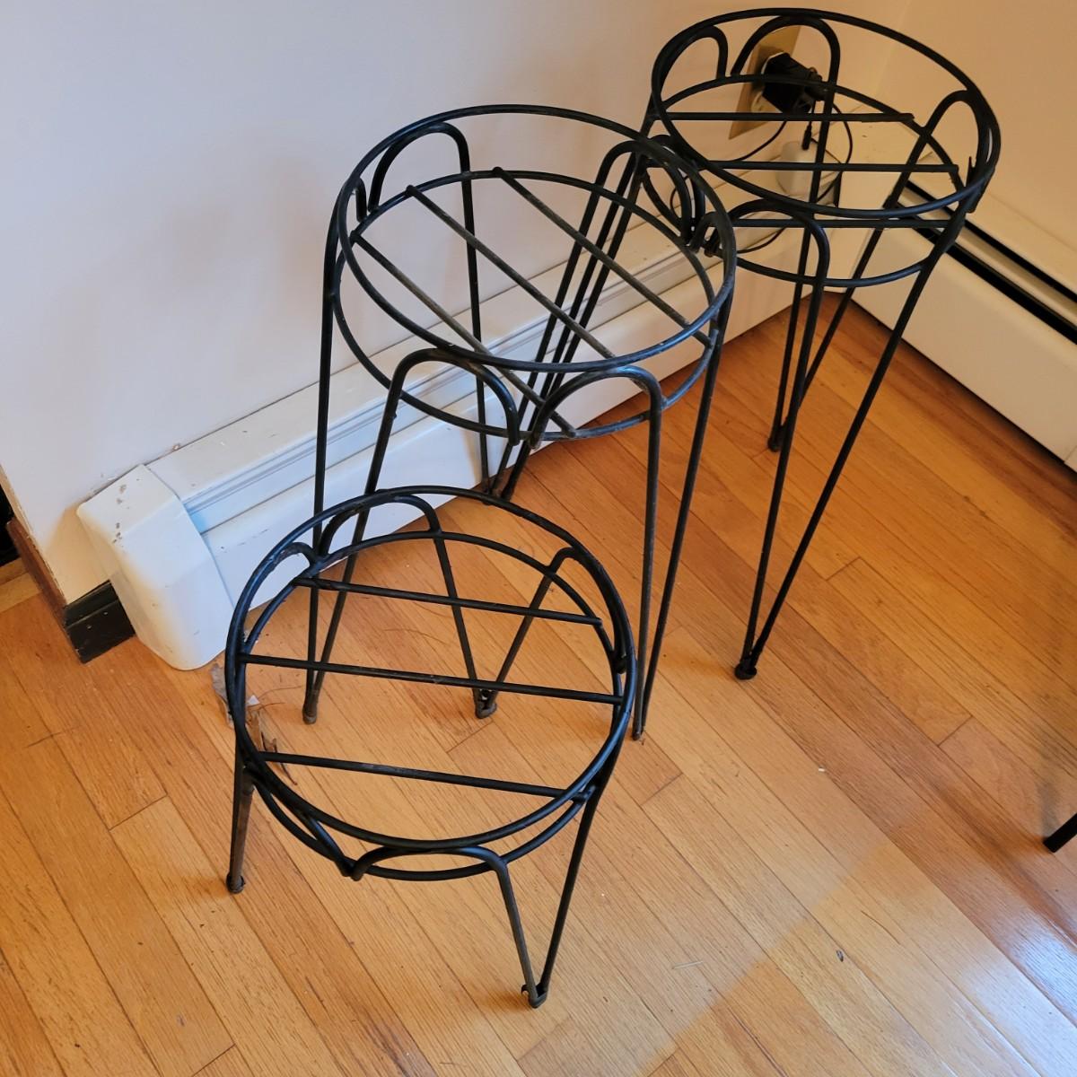 An assortment of four black metal plant stands. One has two shelves and a decorative leaf pattern on its side. It measures approximately 26" x 13" x 24"H. Also included are three matching single plant stands, the tallest of which measures approximately 10"D x 21.5"H. Local pickup only