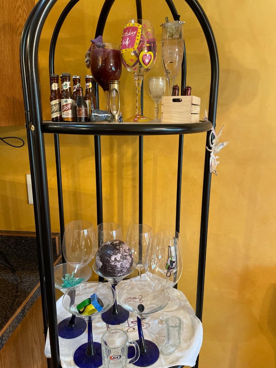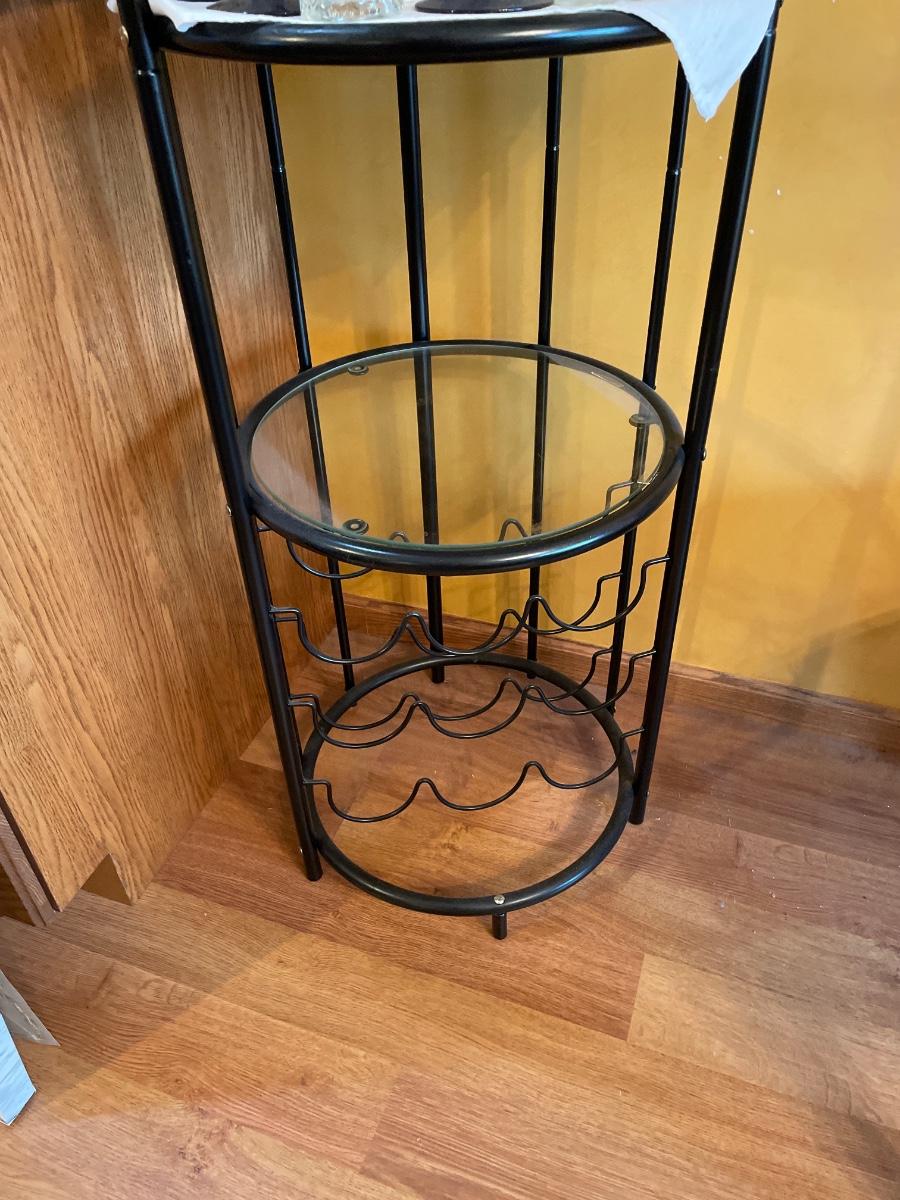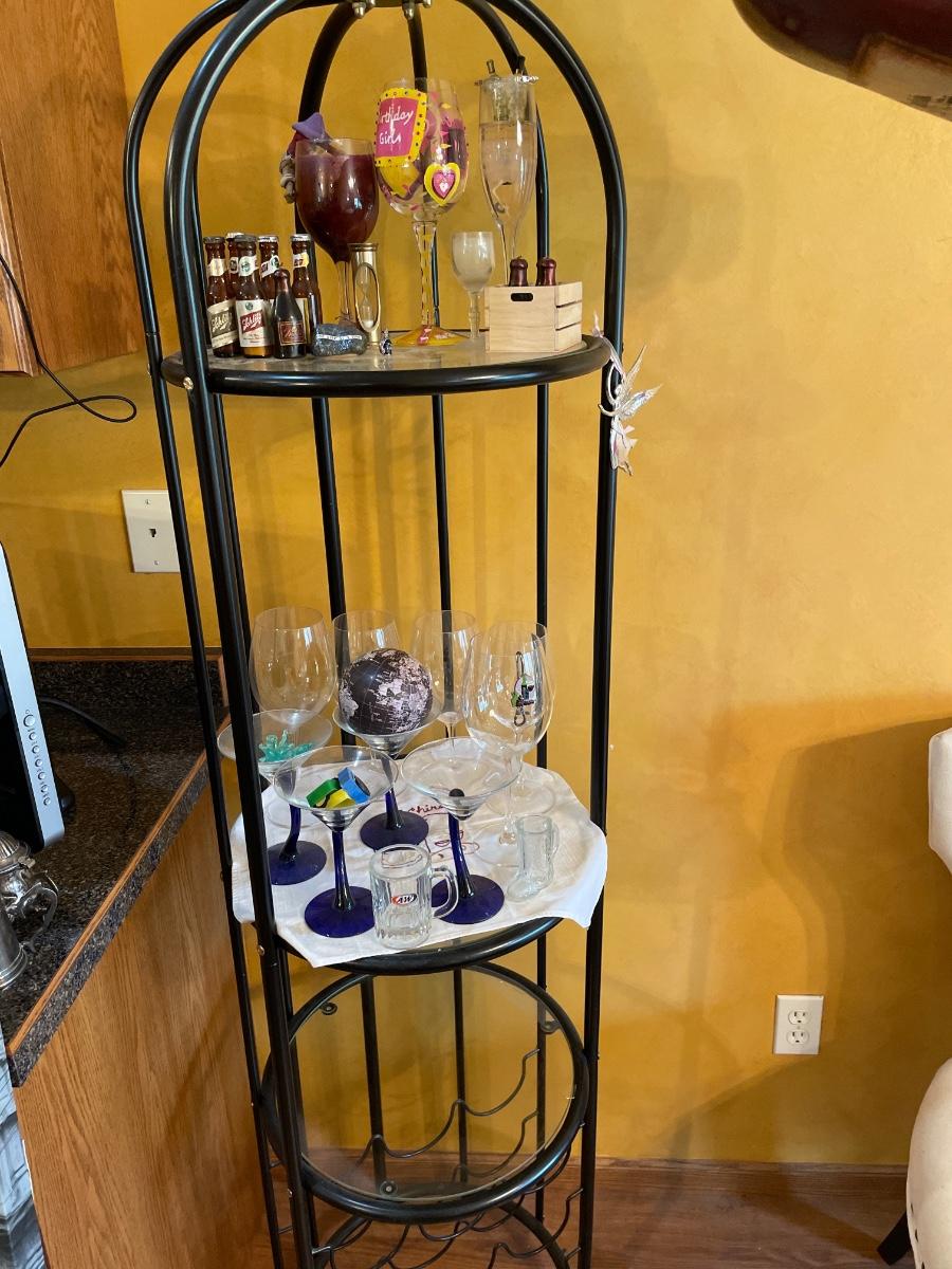 Black metal wine bottle holder and shelving including glasses