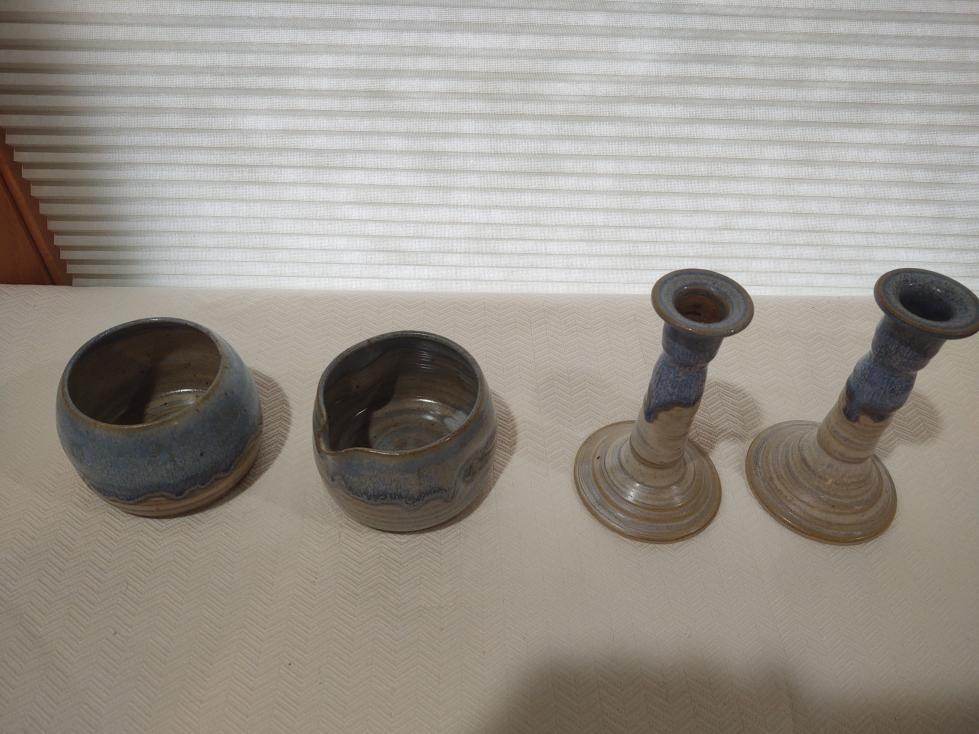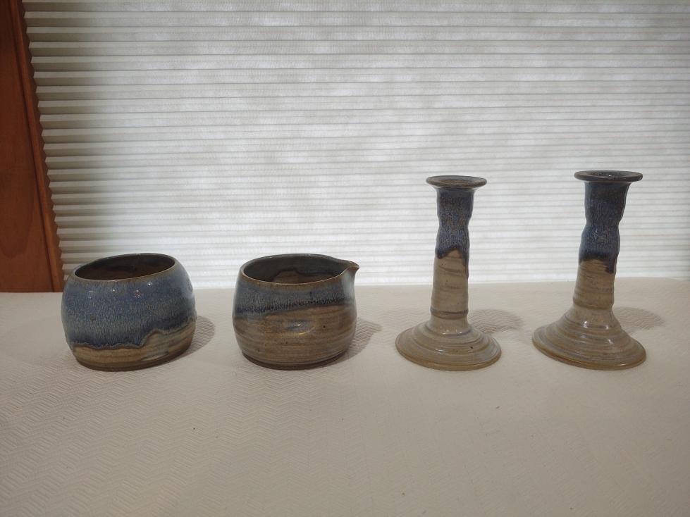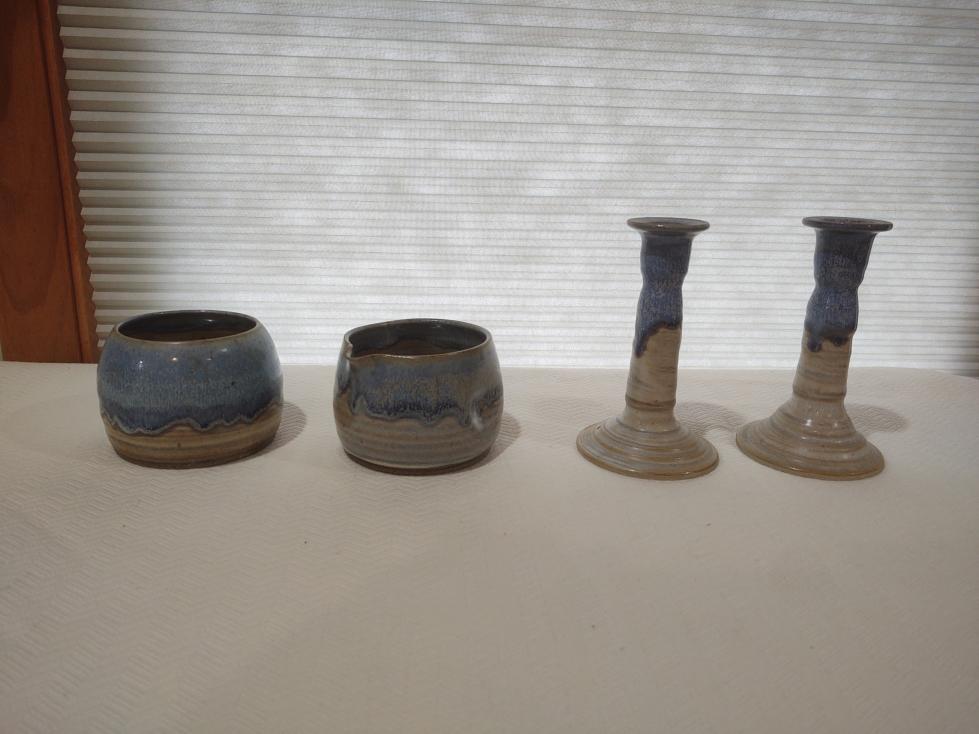 Black Mountain Pottery. Cream & sugar bowls are 3"tall. Candlesticks are 5.75" without a candle.