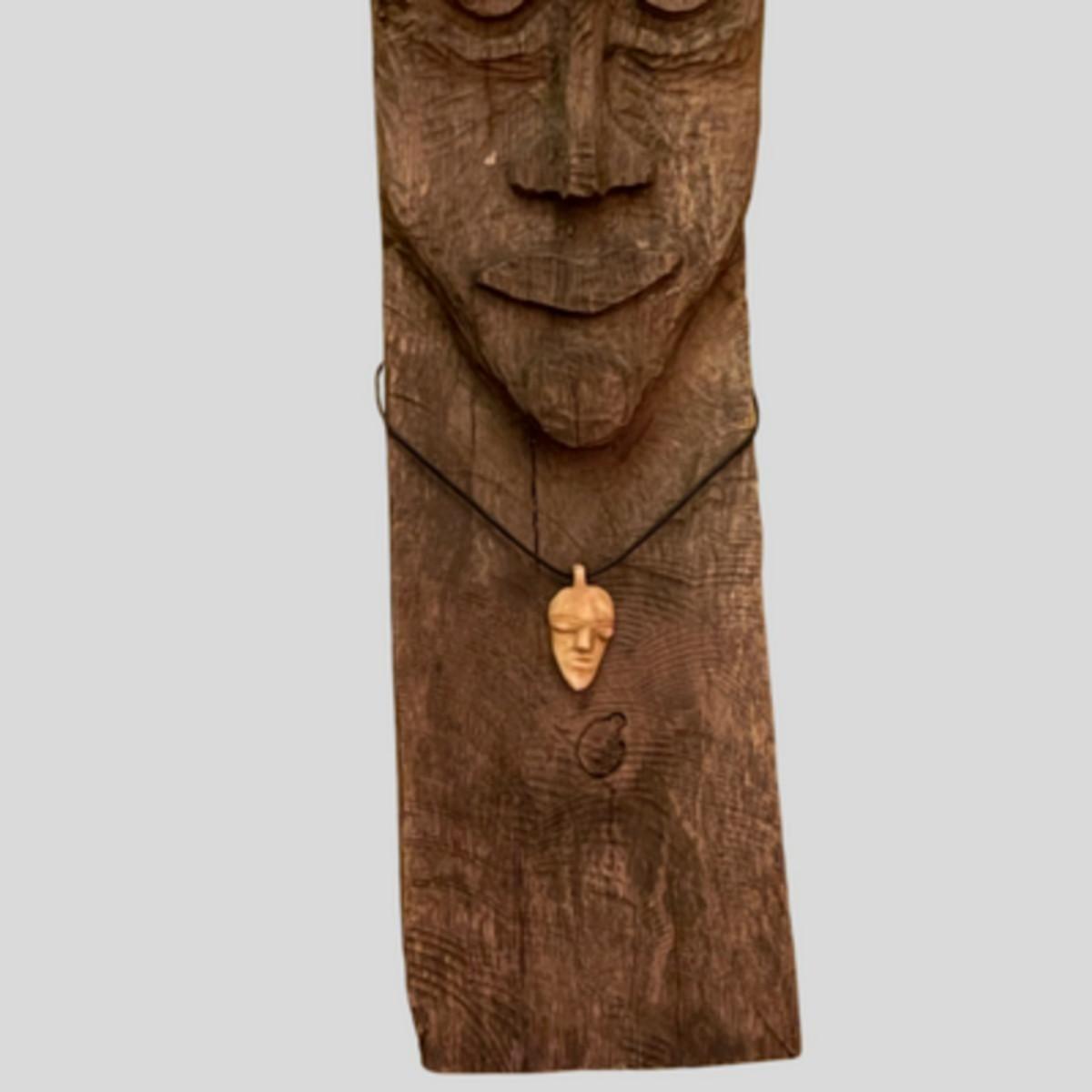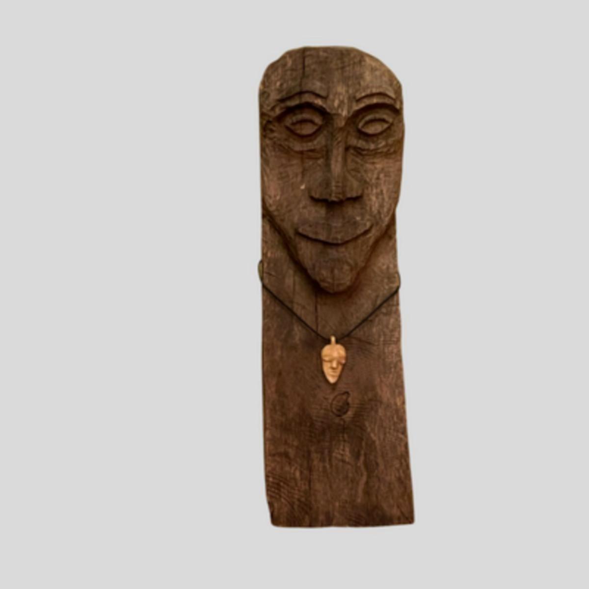 This is an exquisite wood carving. It is believed to have been made in honor of the Native American people. The gold necklace is a replication of the carving.