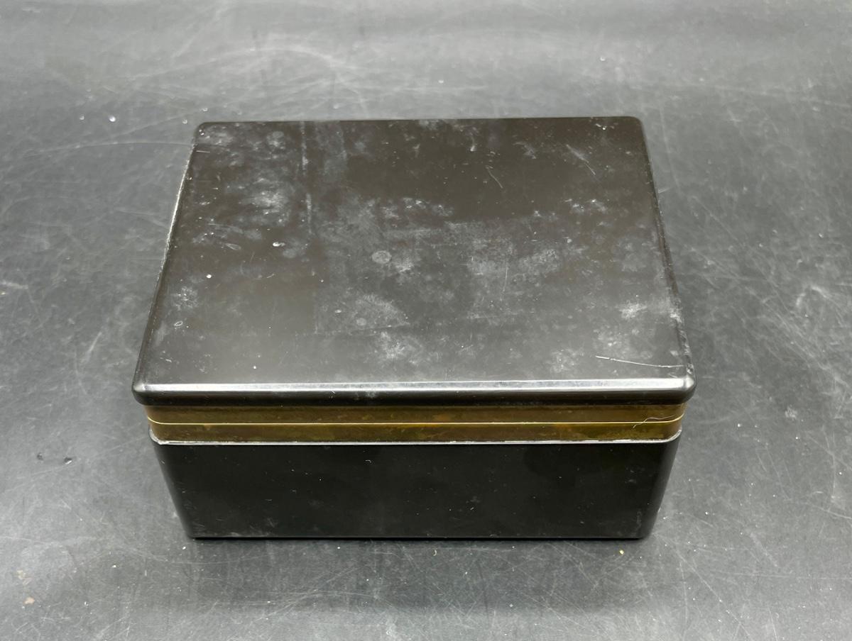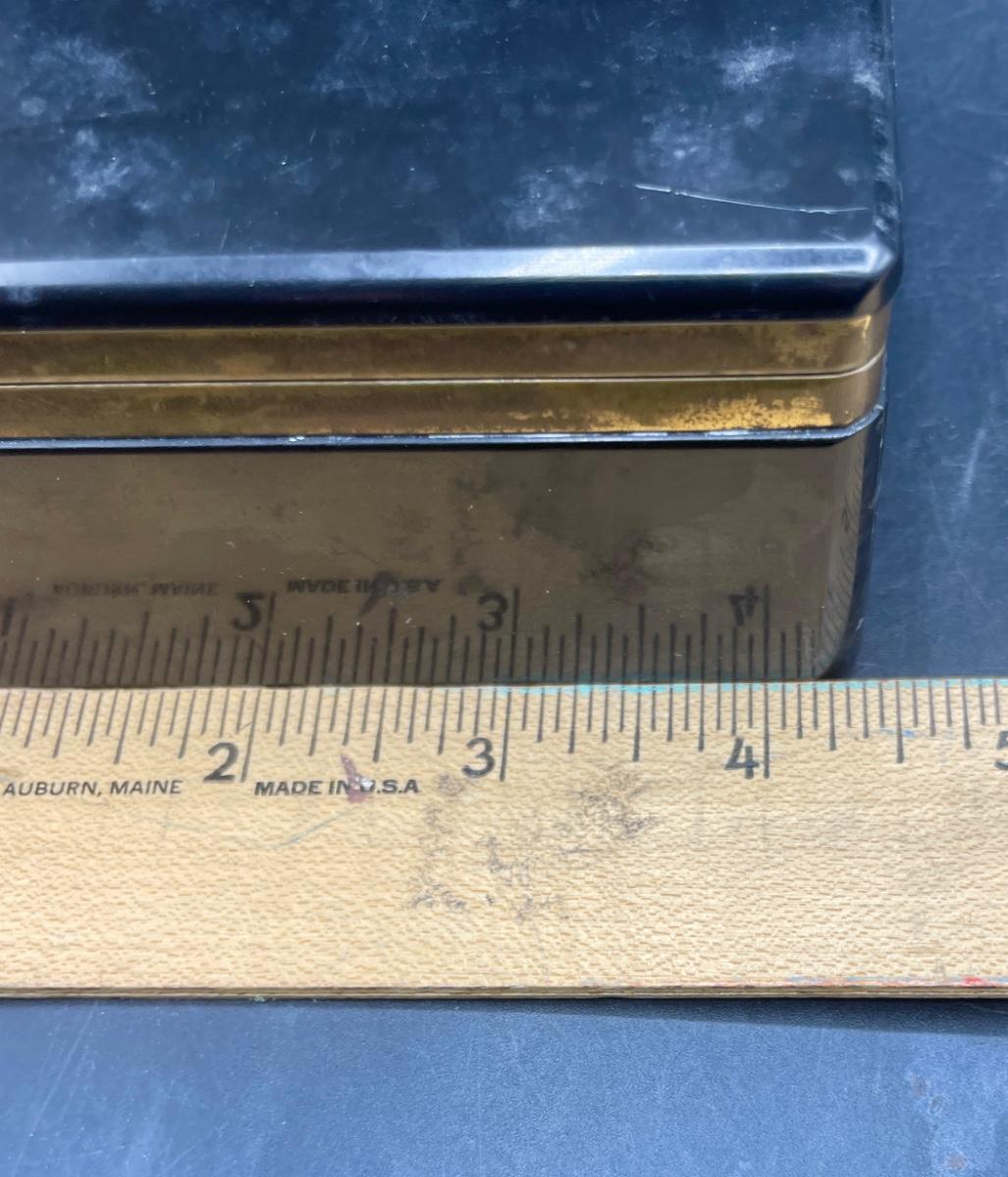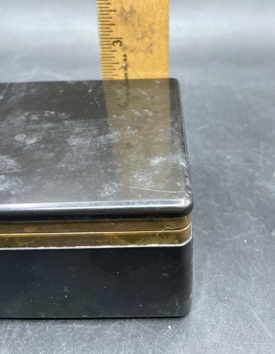 Approx. 4" x 3" with a hinged lid. In good condition.