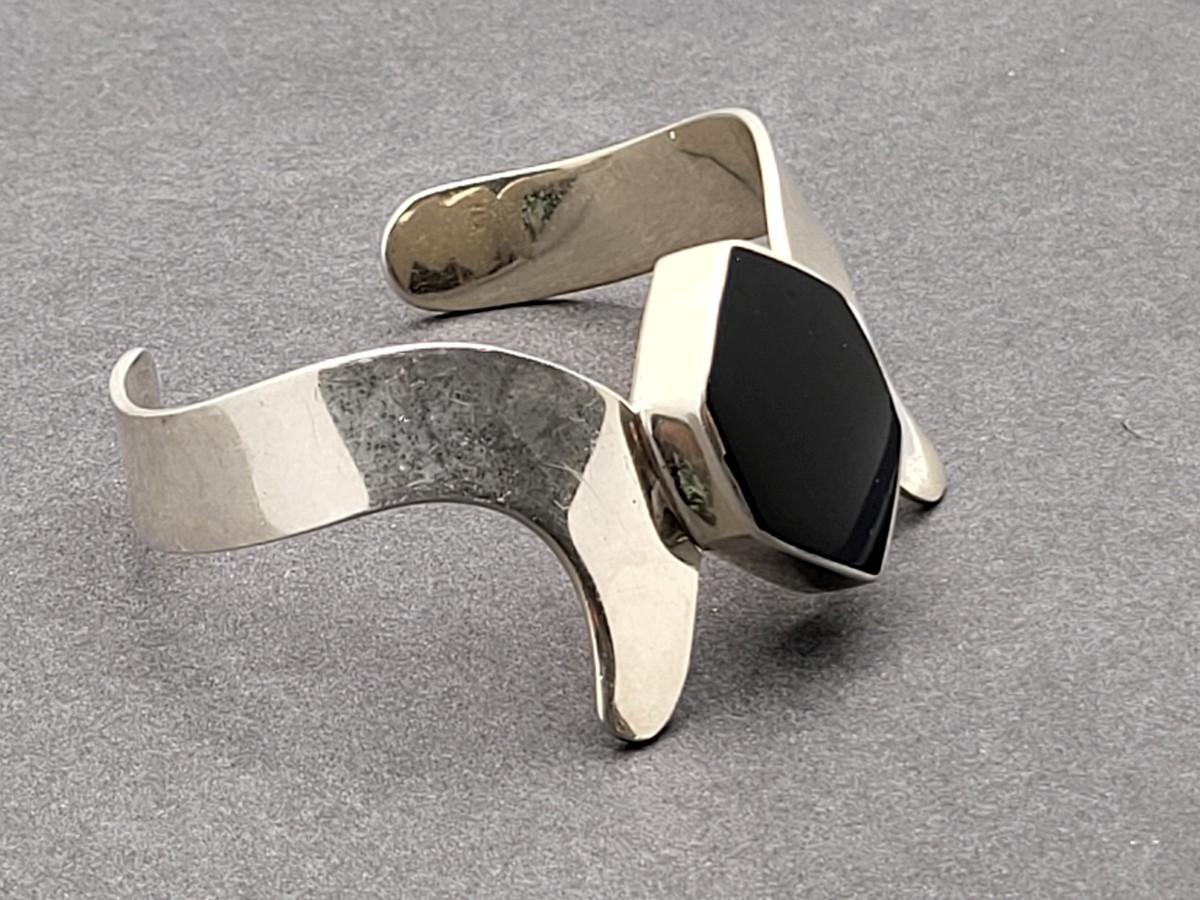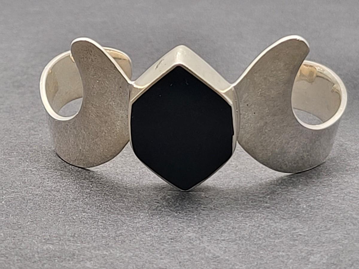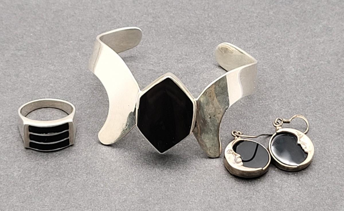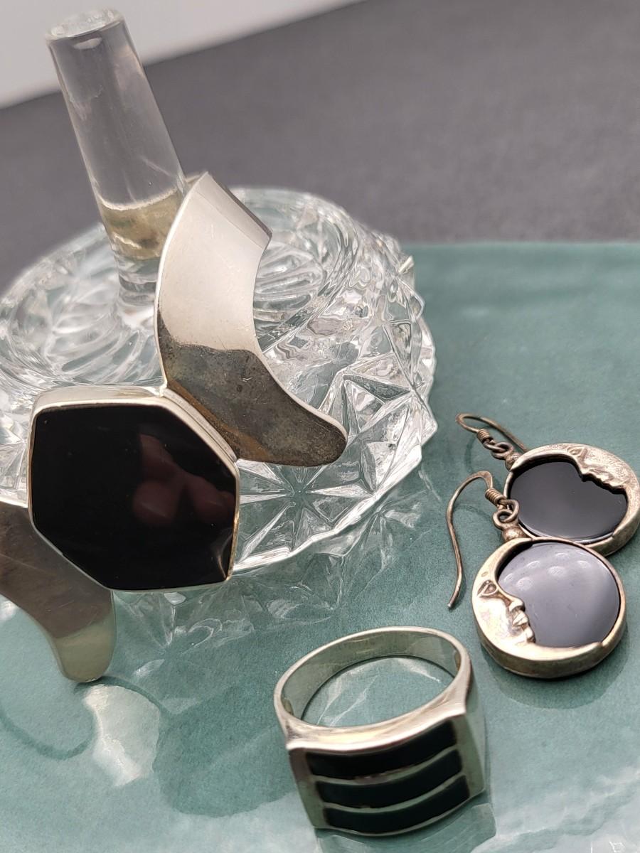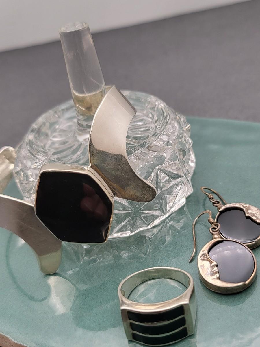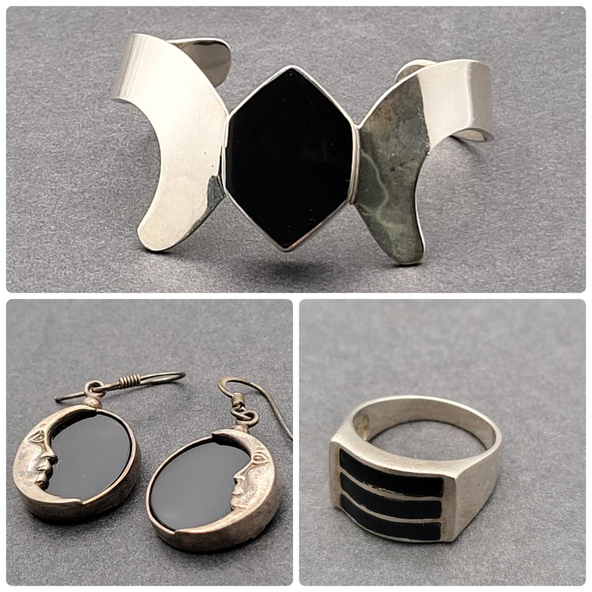 Stunning, vintage Mexico 925 cuff bracelet. Hexagon onyx stone is 1.25" wide. Three row onyx inlay ring size 9.5 & moon earrings, 3/4" diameter. Total weight is 50.7 grams.