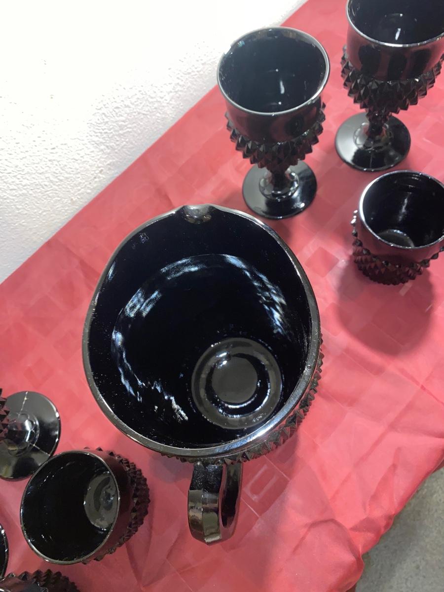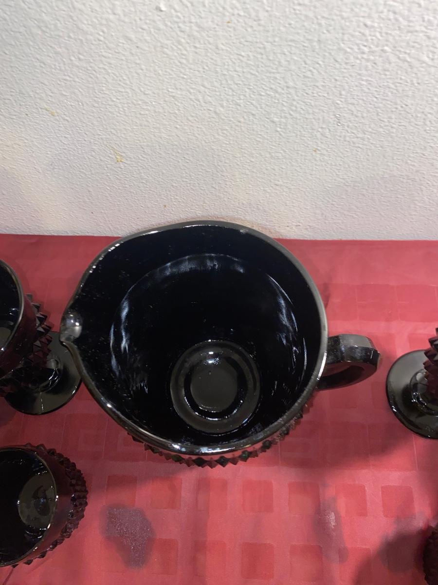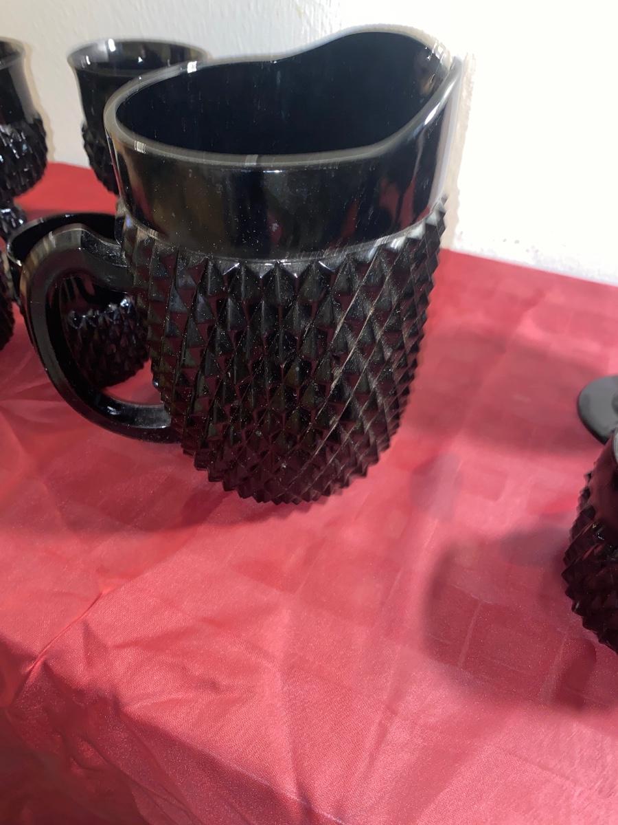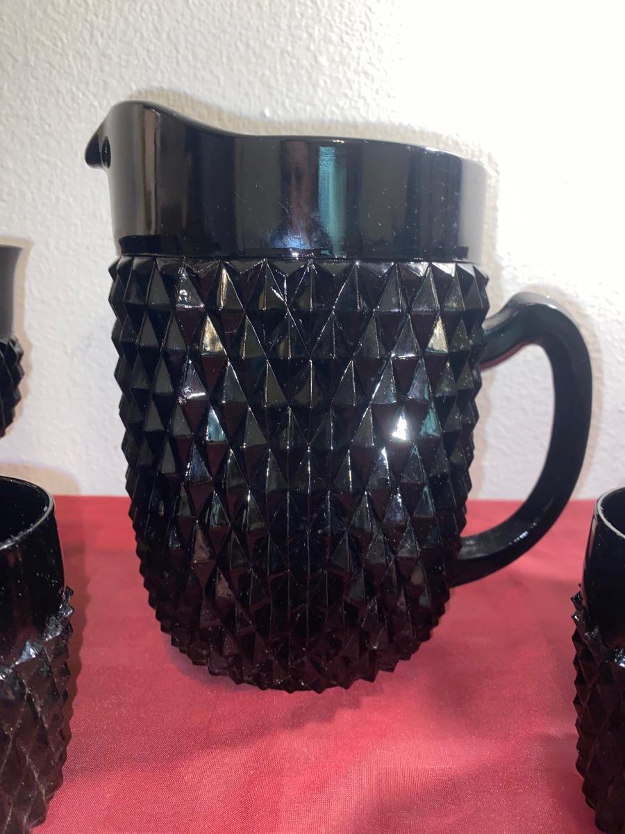 BLACK ONYX DIAMOND POINT TIARA GLASS PITCHER AND DRINK WARE