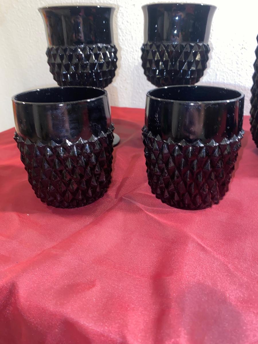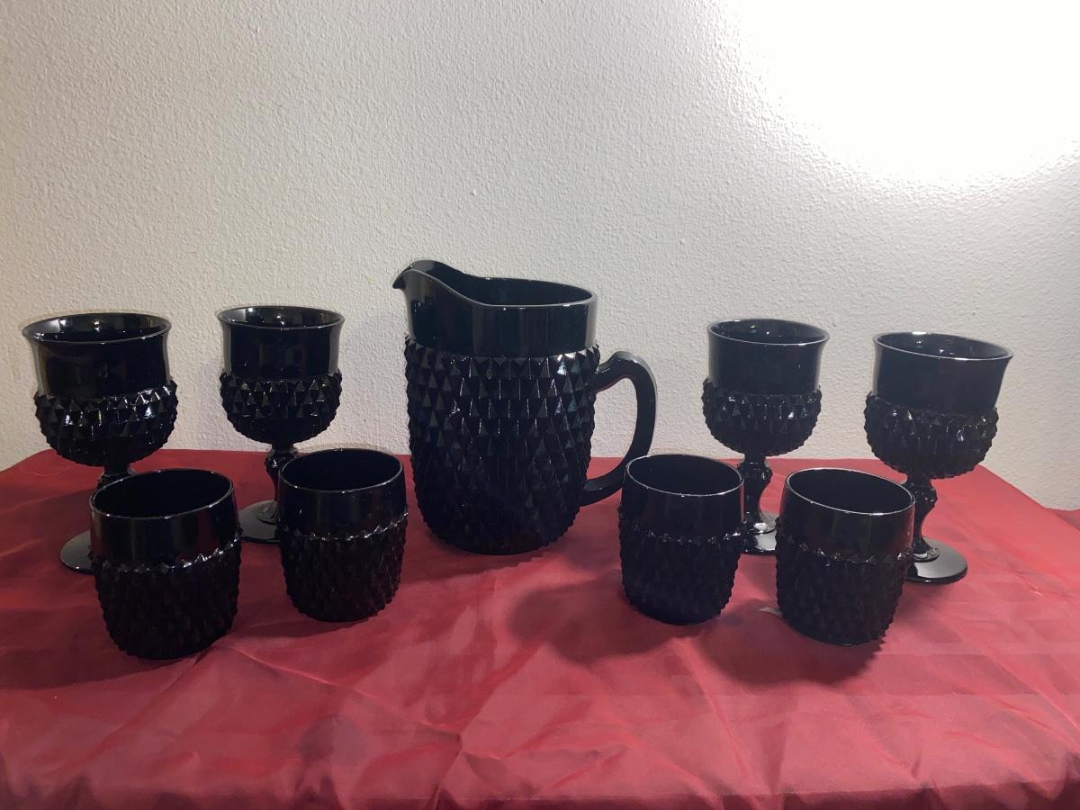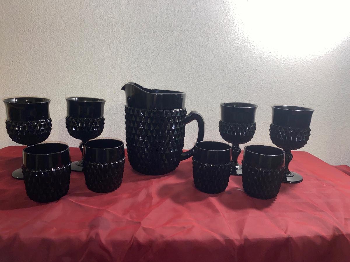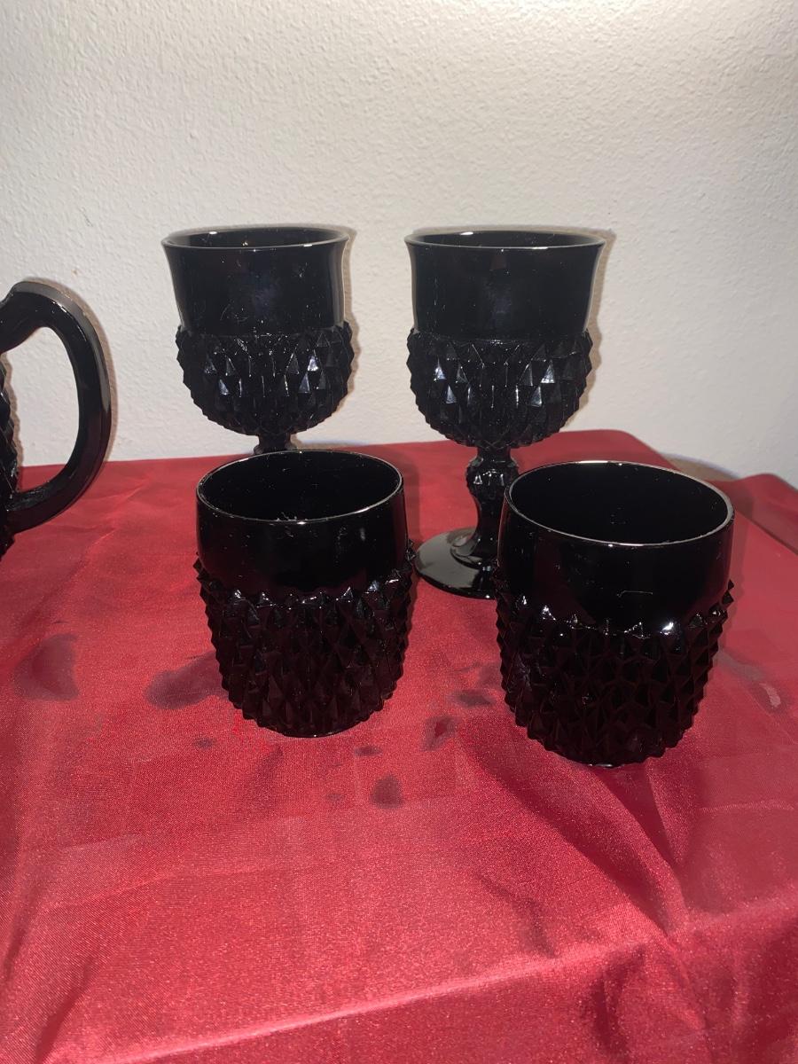 BLACK ONYX DIAMOND POINT TIARA GLASS PITCHER AND DRINK WARE