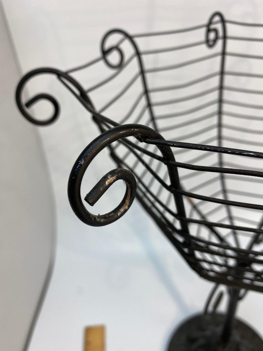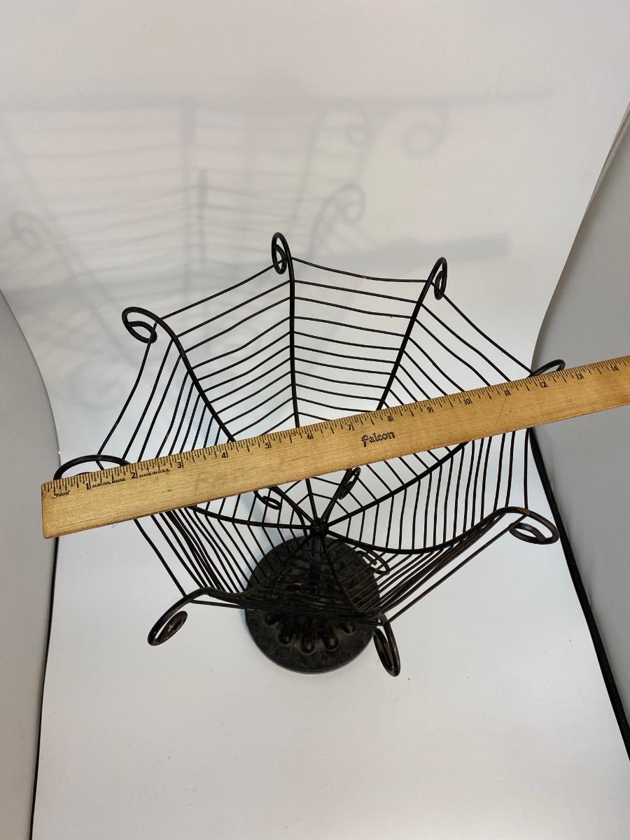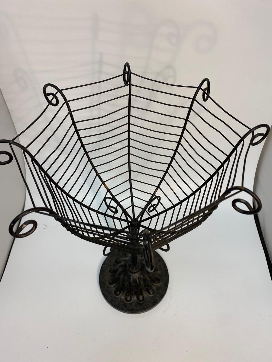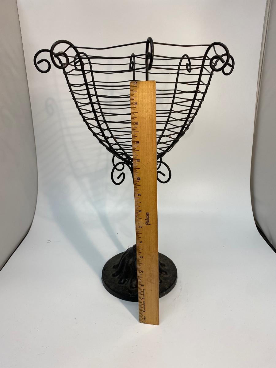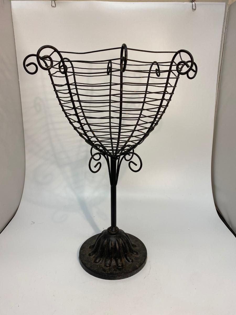 Metal pedestal planter pot basket. Painted metal has a couple scuffs and chips in paint. Stands about 16" tall. In overall good condition, great for inside or outside decor.