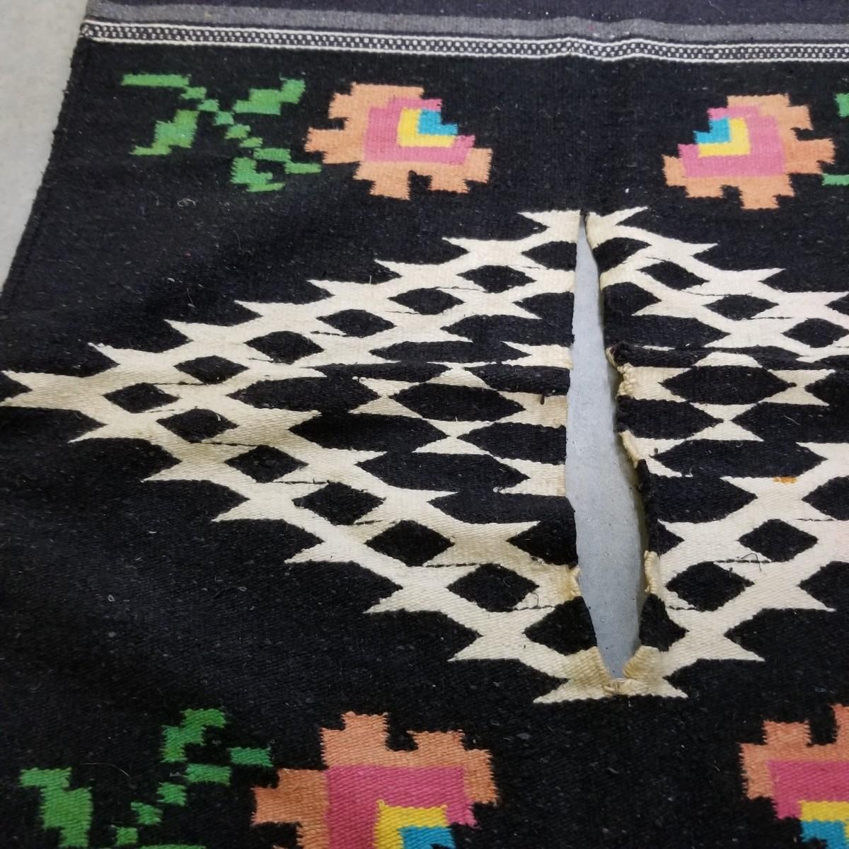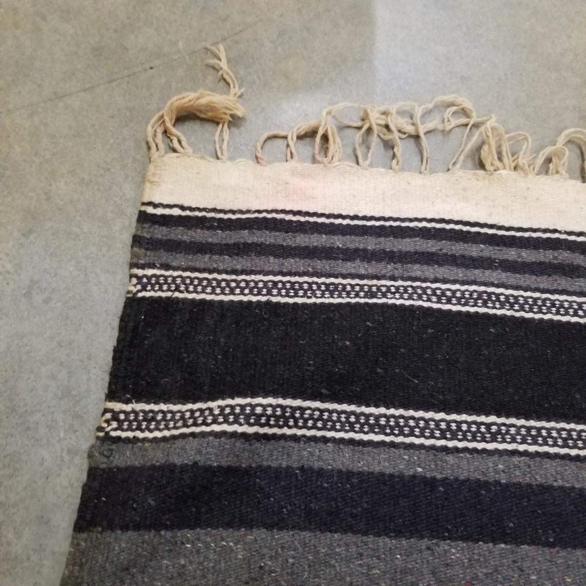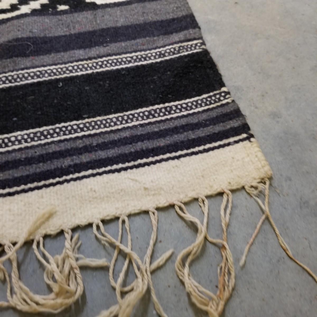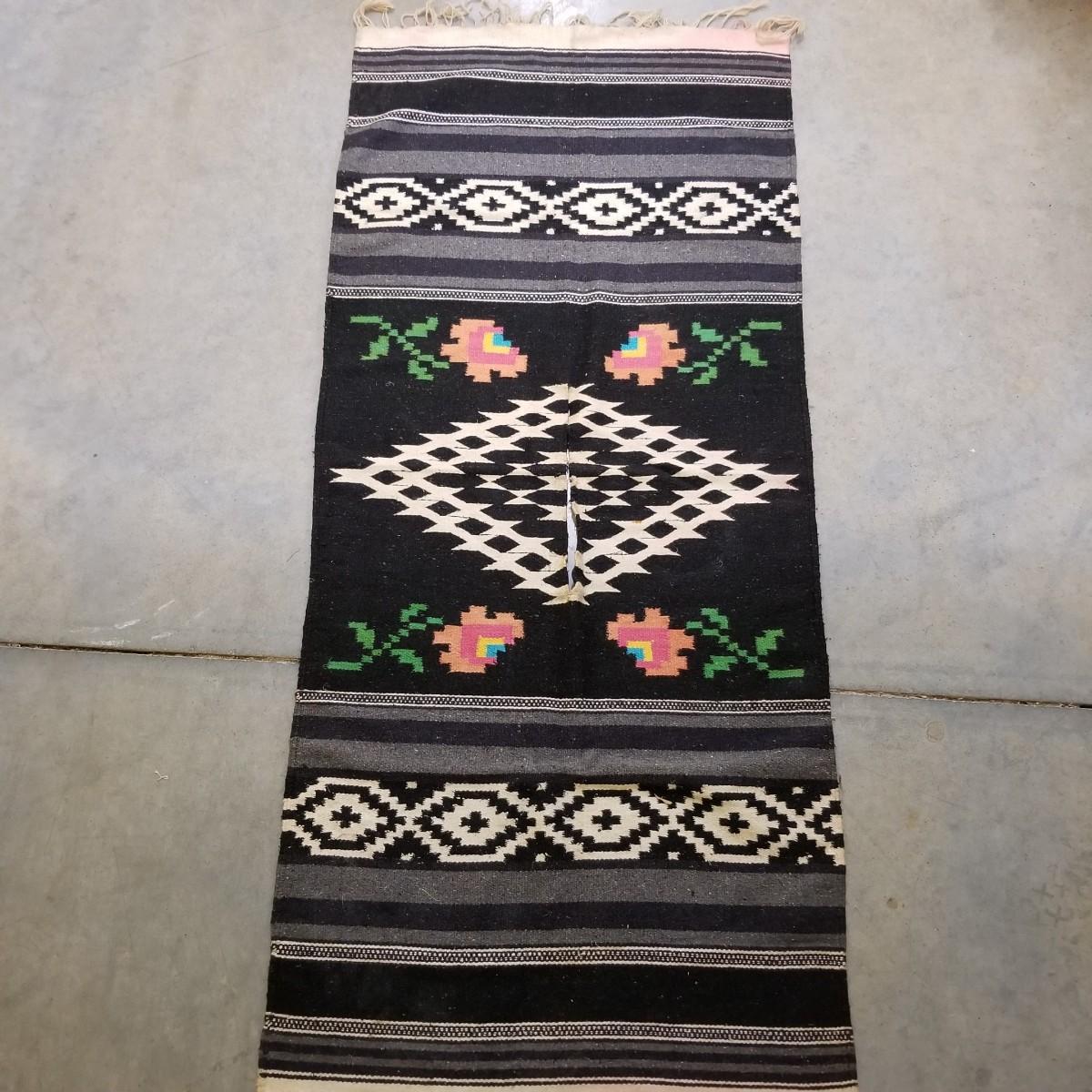 Designed to be worn over clothing, this black and grey serape has flowers and chevron patterns woven throughout.  Slit in middle is partly torn and fringe ends have some staining. 27"x67". See photos for detail.  Shipping available.
