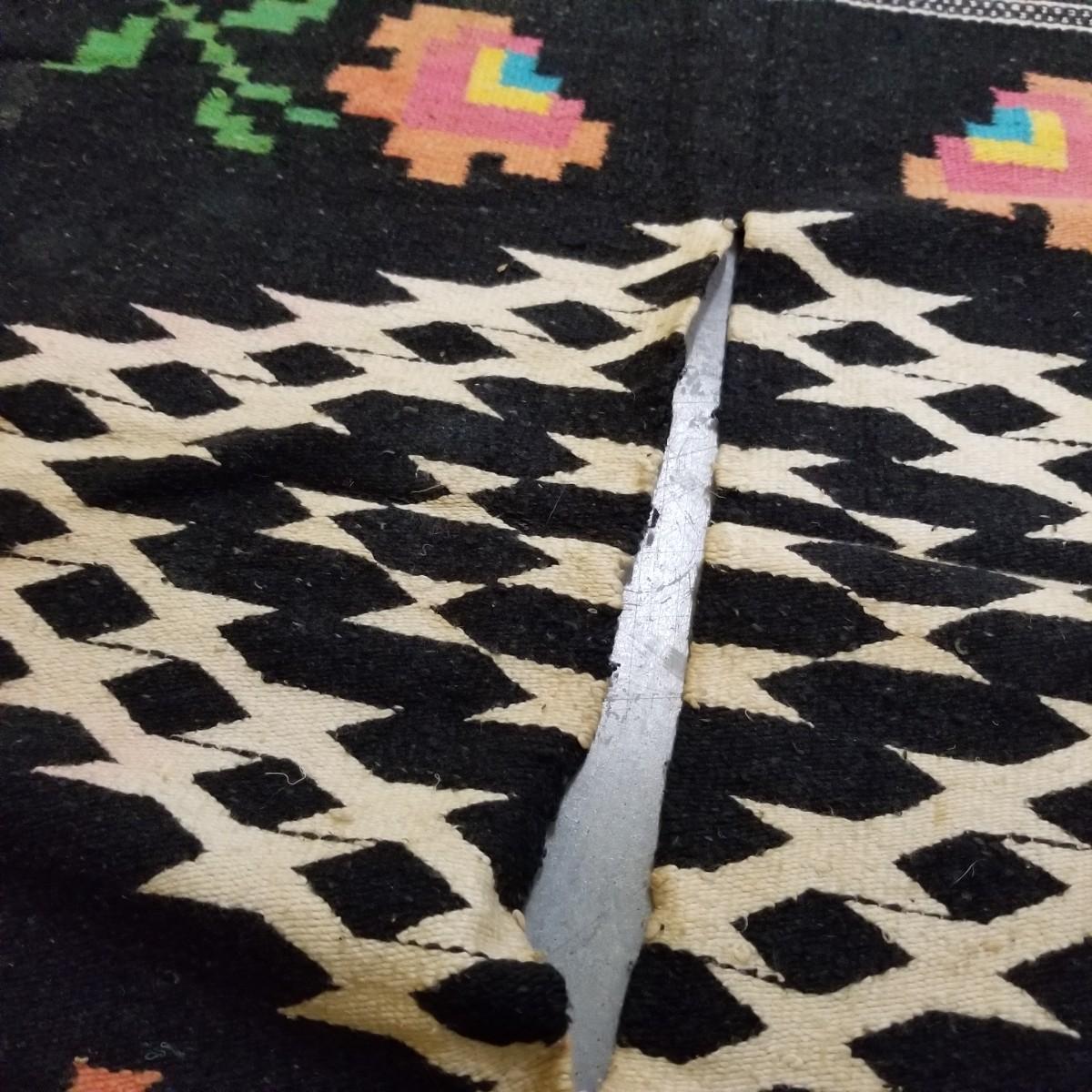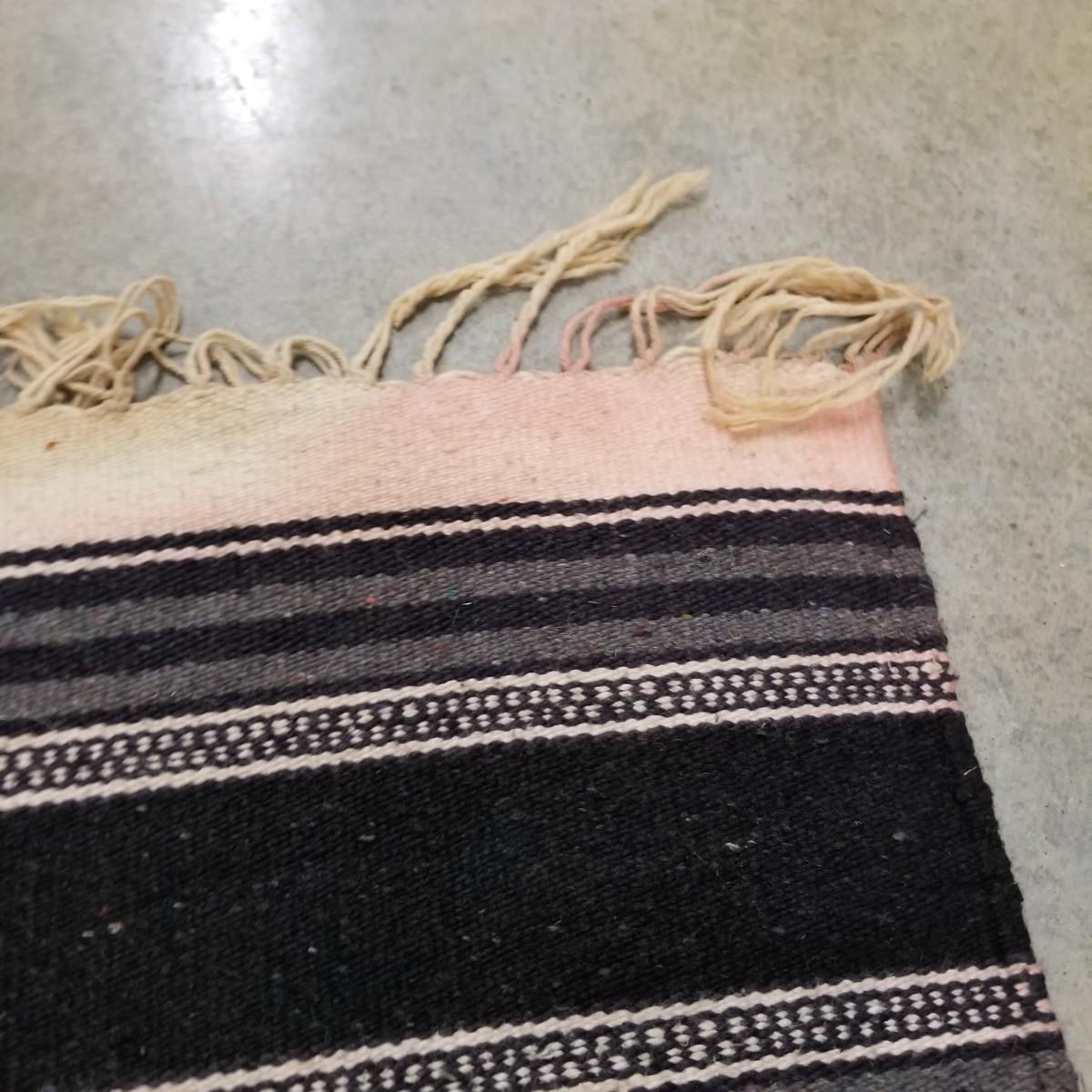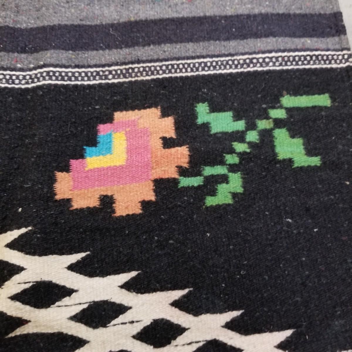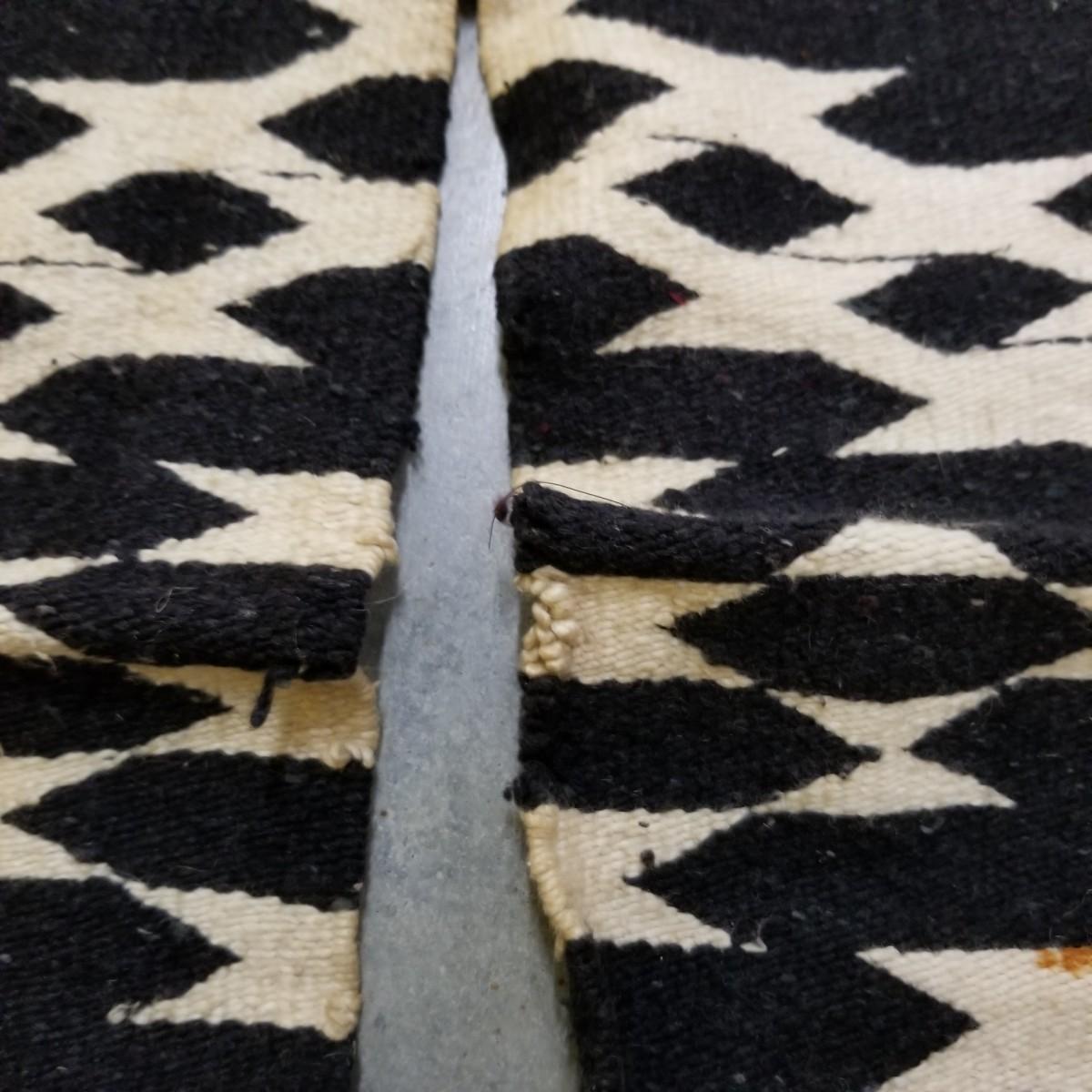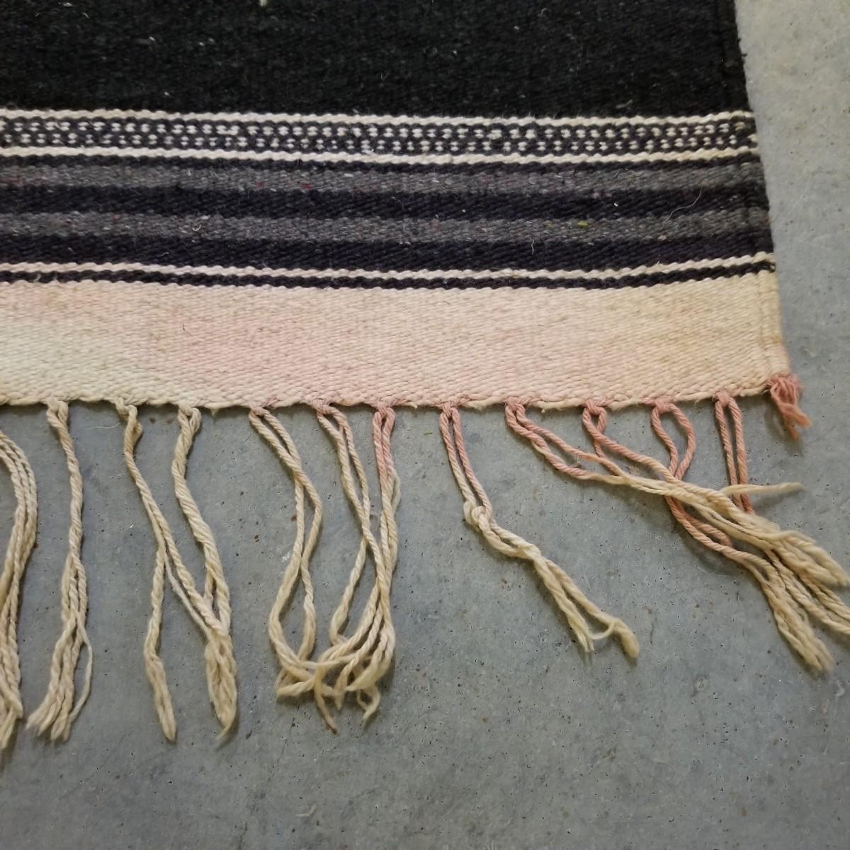 Designed to be worn over clothing, this black and grey serape has flowers and chevron patterns woven throughout.  Slit in middle is partly torn and fringe ends have some staining. 27"x67". See photos for detail.  Shipping available.