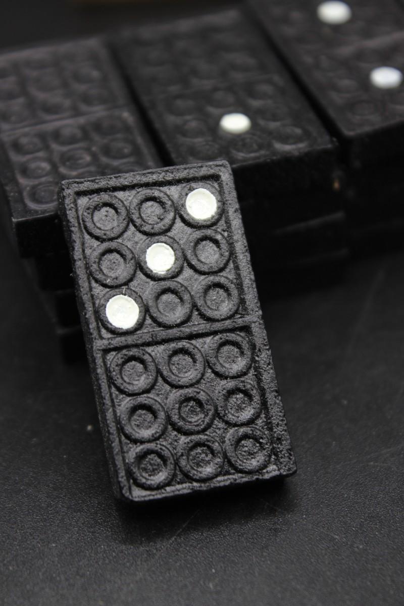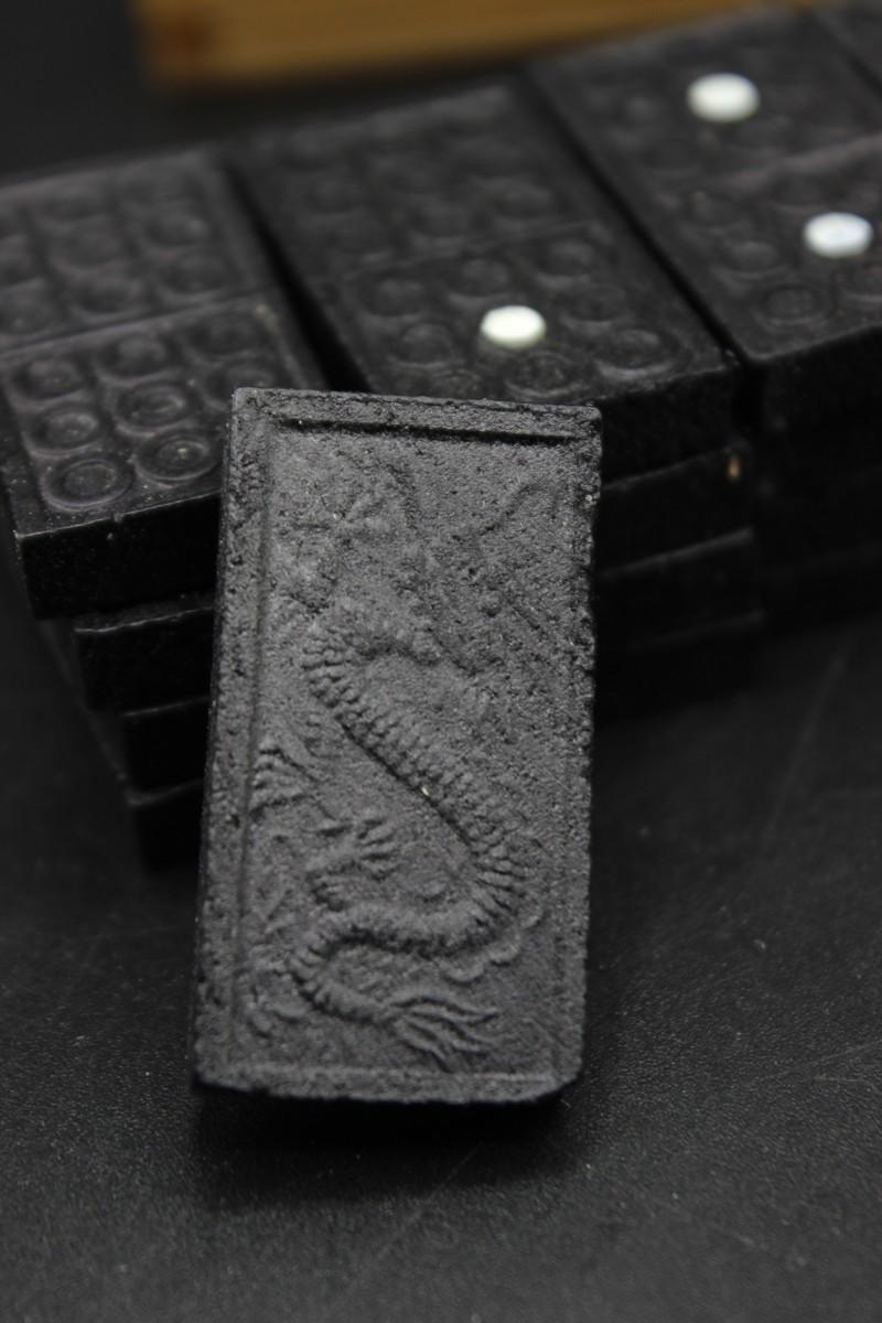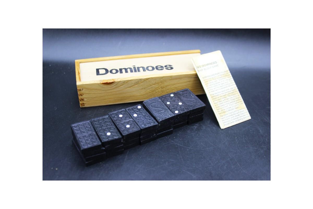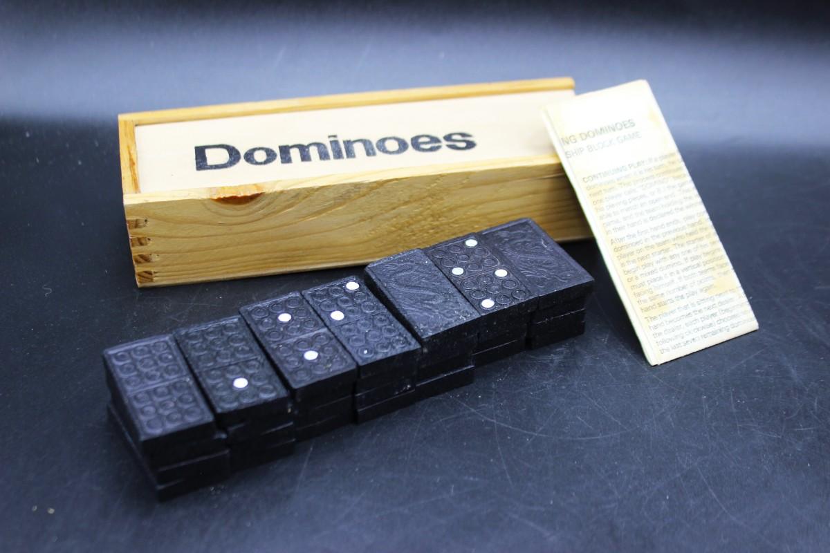 Black plastic Domino set. Come in wood box with instructions. Dragon pattern on back.