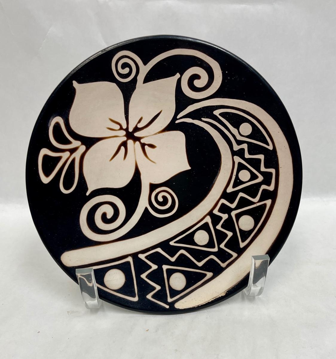 Possibly of Hawaiian or Peruvian origin. Unmarked and undated, good condition with holes and a cord attached for hanging on a wall. Approx. 8" across.