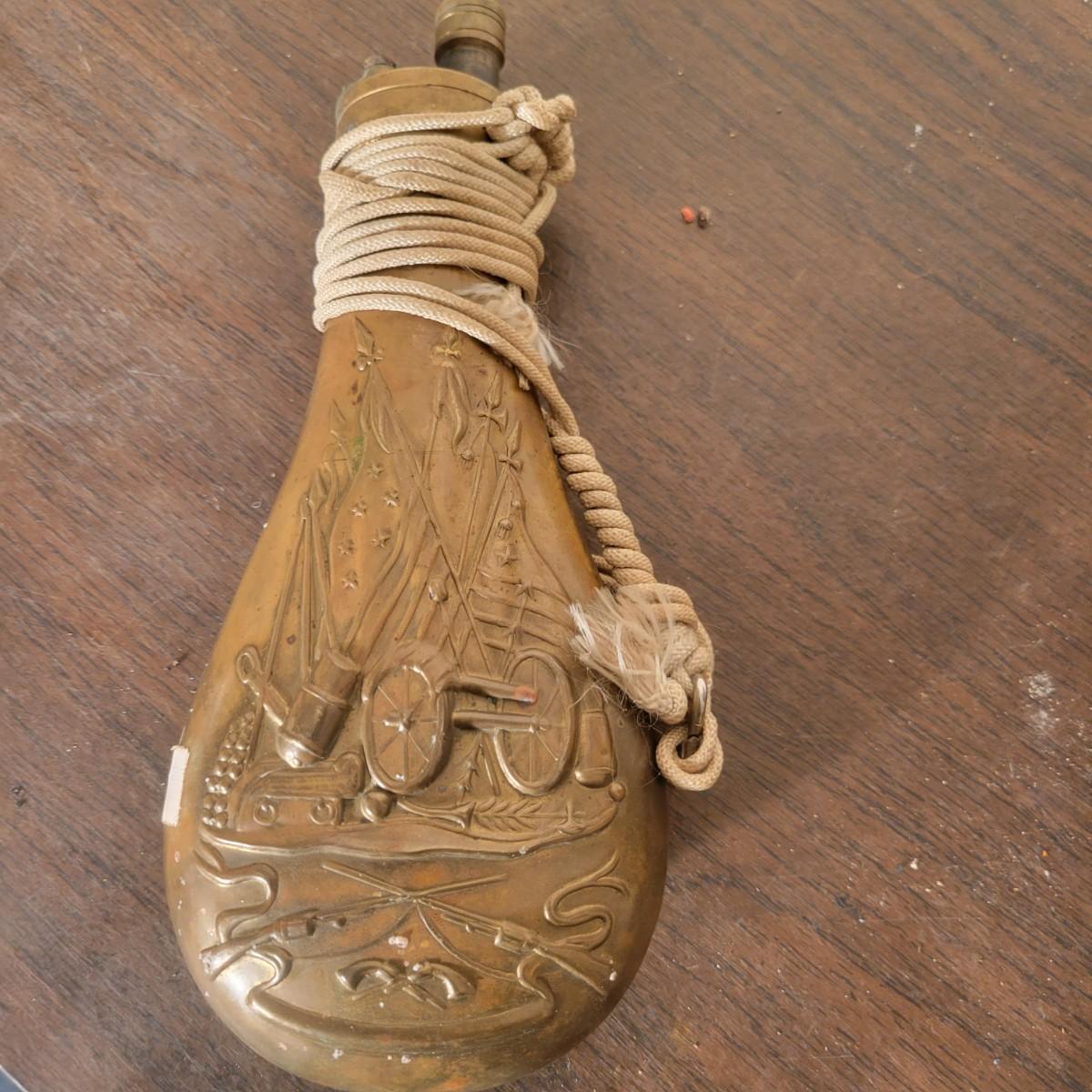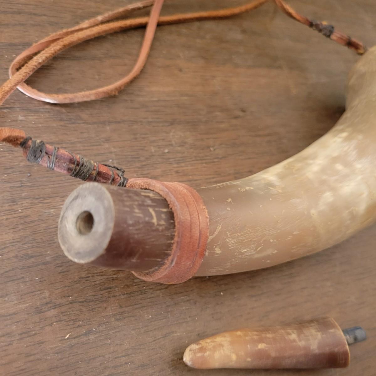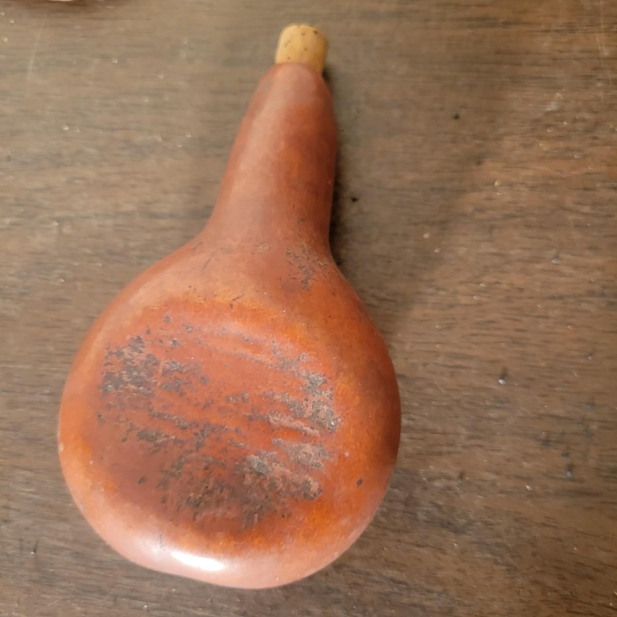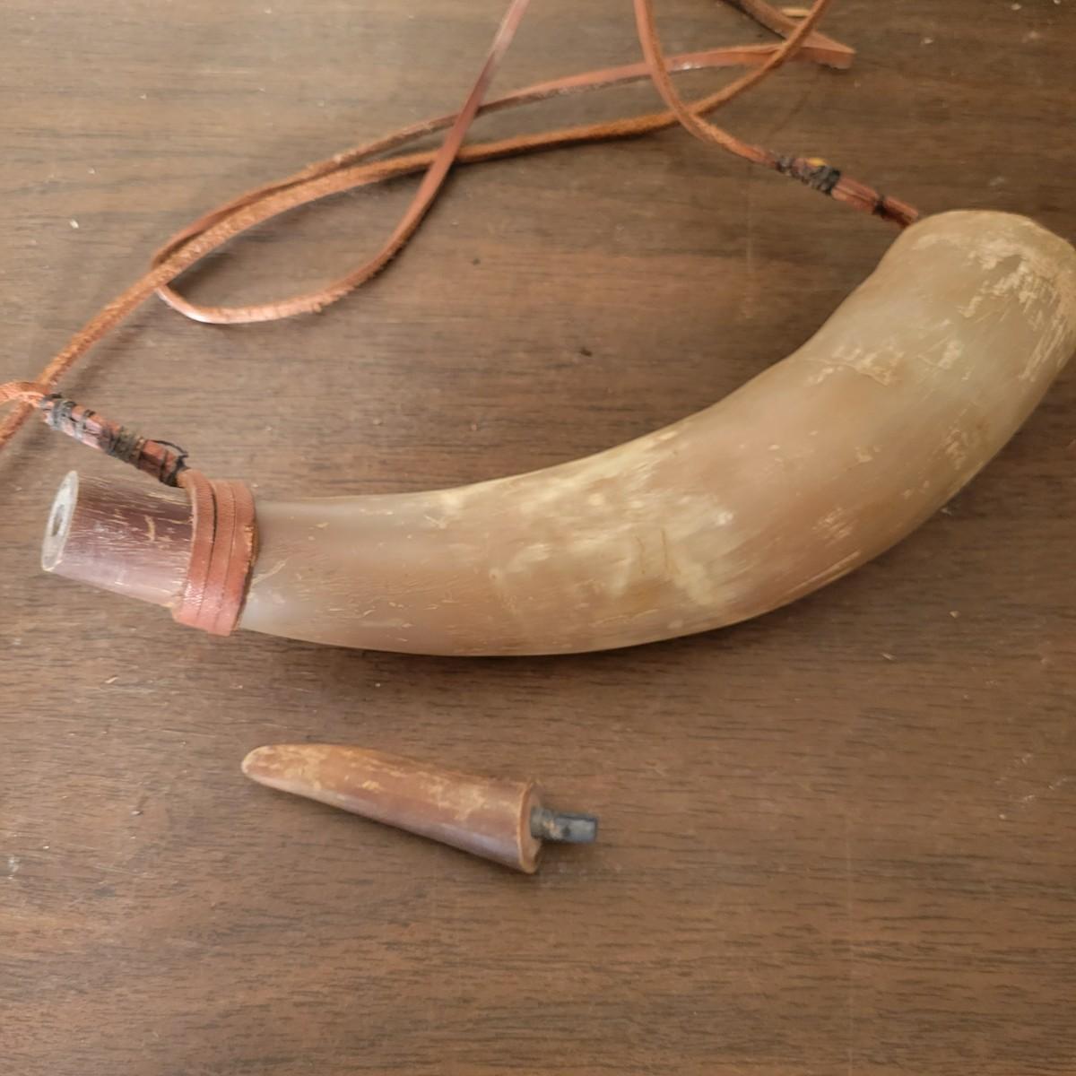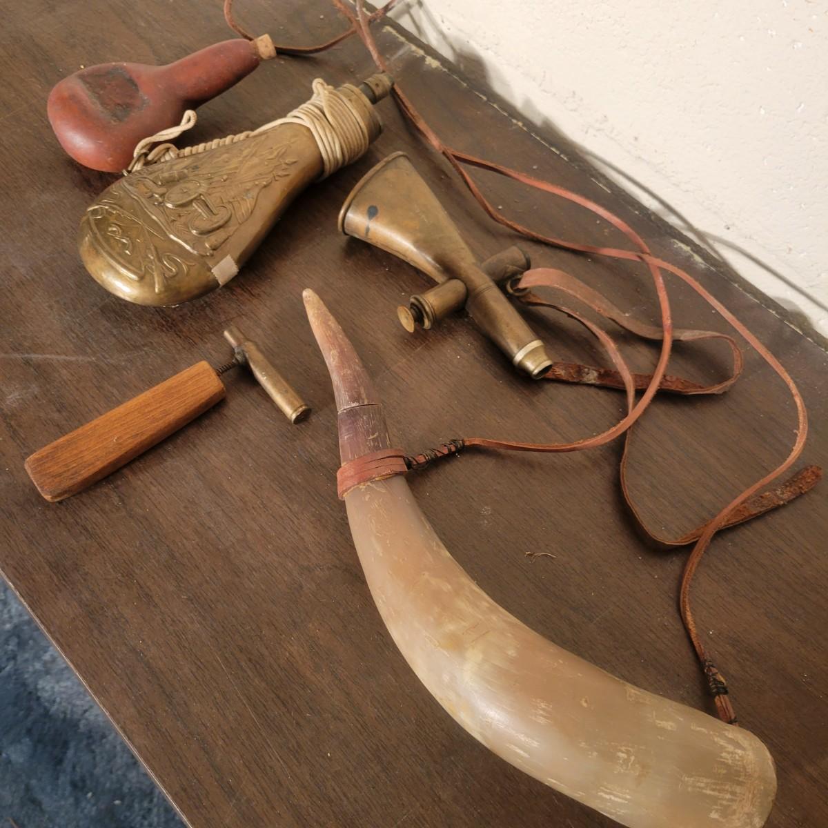 A collection black powder horns and novelties. One horn is made of actual horn, another is made from a gourd and one is made of brass with intricate carvings. Largest horn measures approximately 12" in length. Some horns may still contain powder residue. The other two items are not able to be verified but the one wooden handle with open end bullet mounted to it may have been a scooper for the powder. The other seems to be brass and appears to have maybe been a horn or caller of some sort. See photos for full inventory. Local pickup only