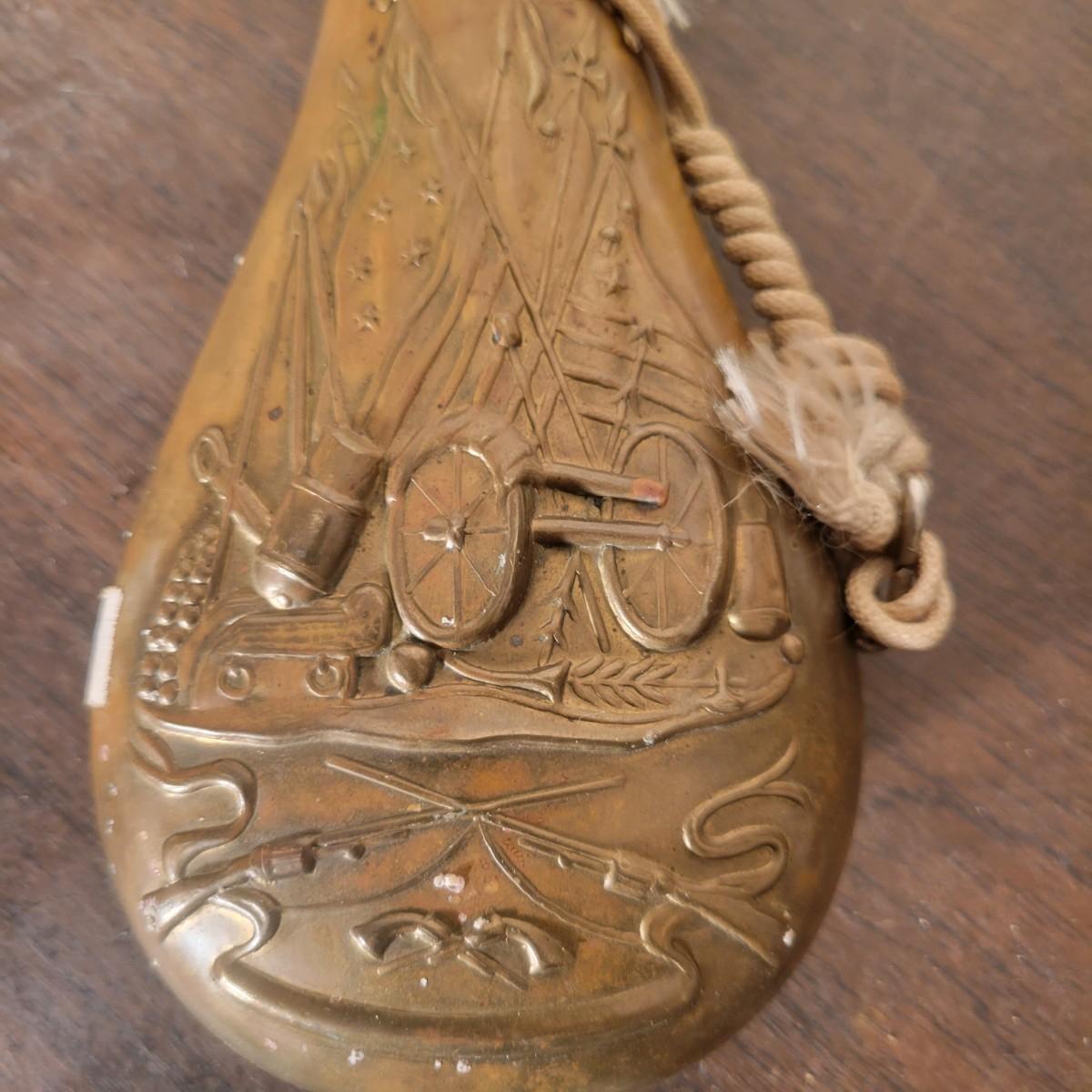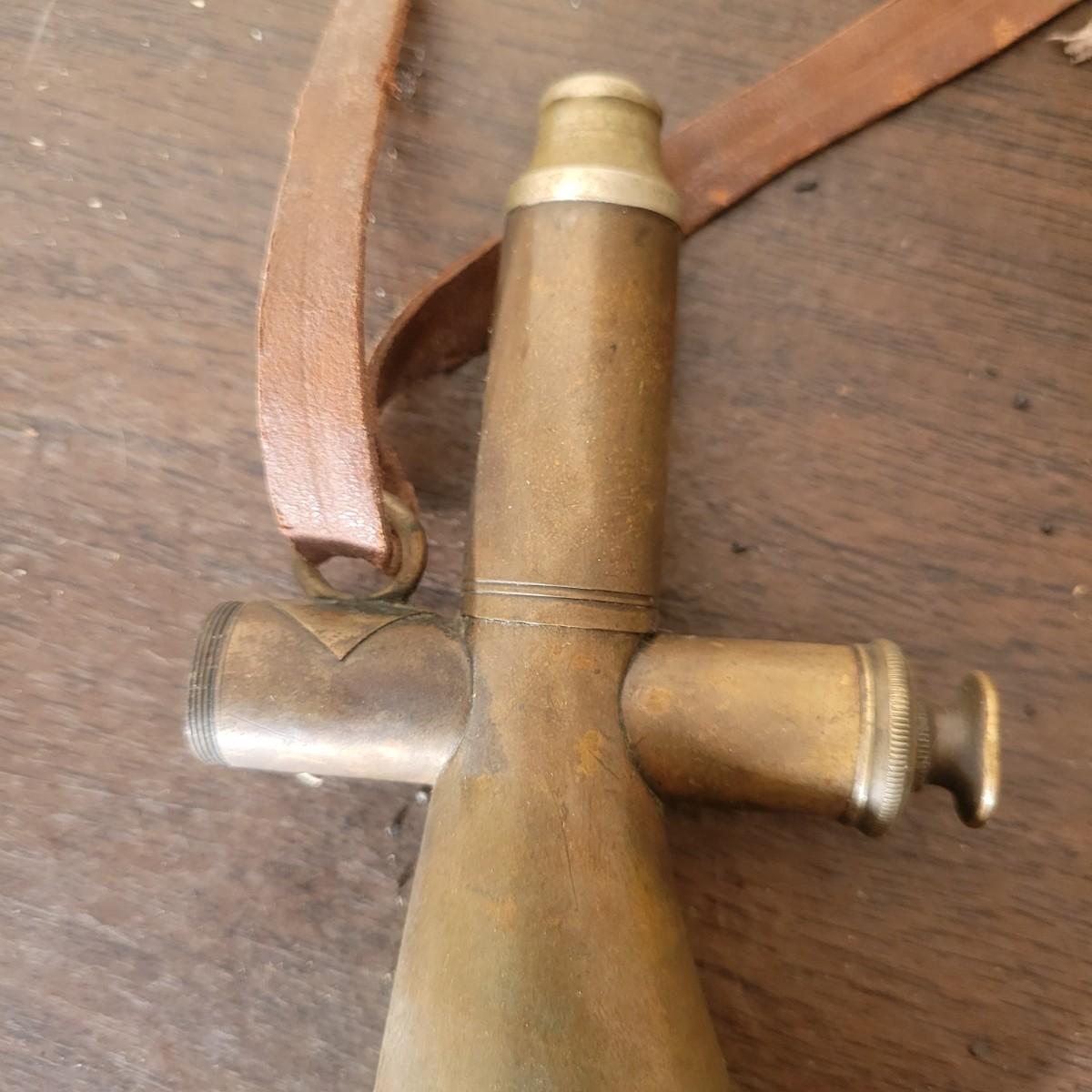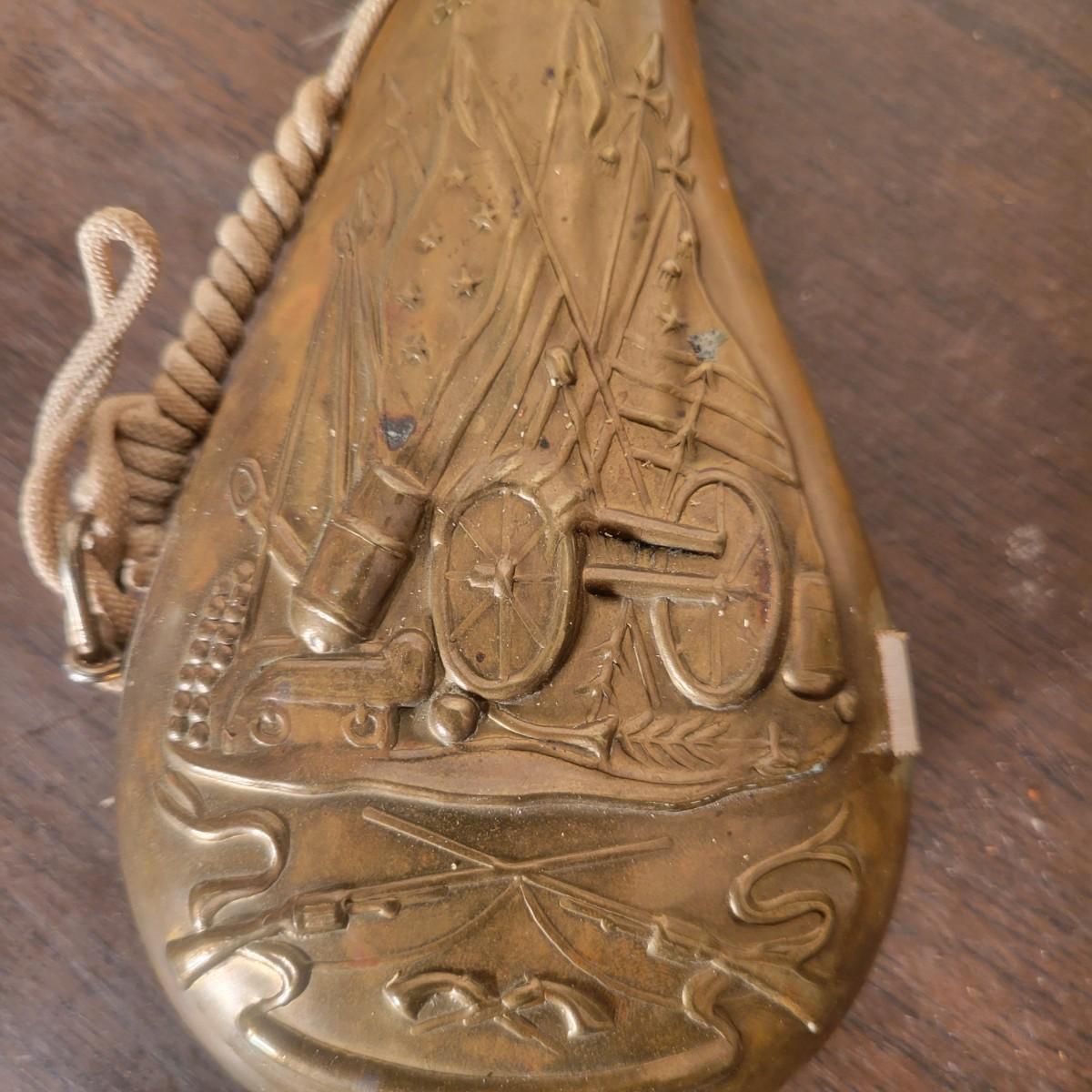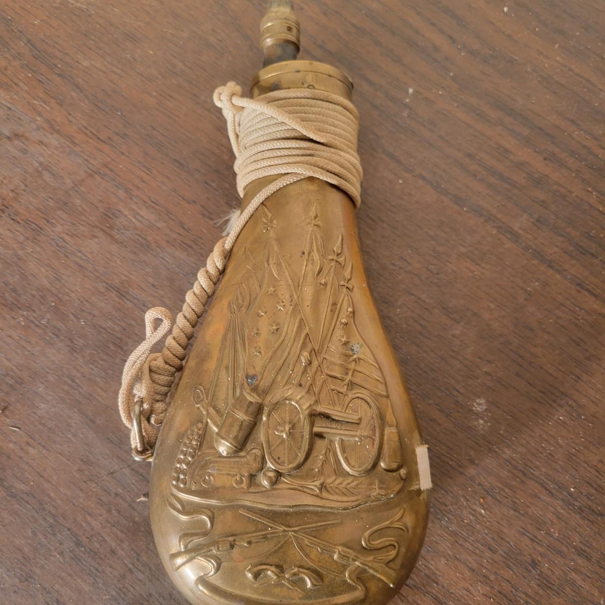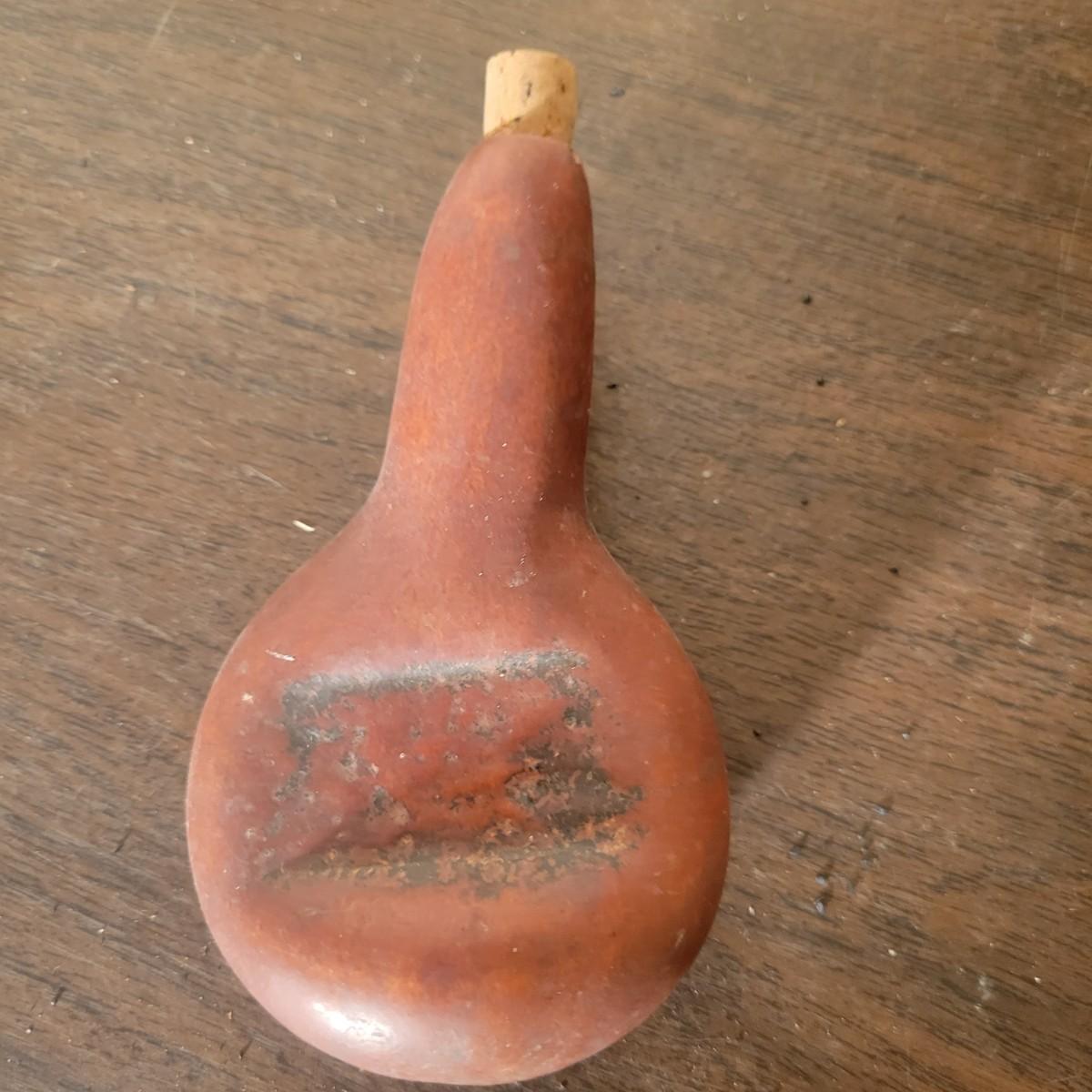 A collection black powder horns and novelties. One horn is made of actual horn, another is made from a gourd and one is made of brass with intricate carvings. Largest horn measures approximately 12" in length. Some horns may still contain powder residue. The other two items are not able to be verified but the one wooden handle with open end bullet mounted to it may have been a scooper for the powder. The other seems to be brass and appears to have maybe been a horn or caller of some sort. See photos for full inventory. Local pickup only