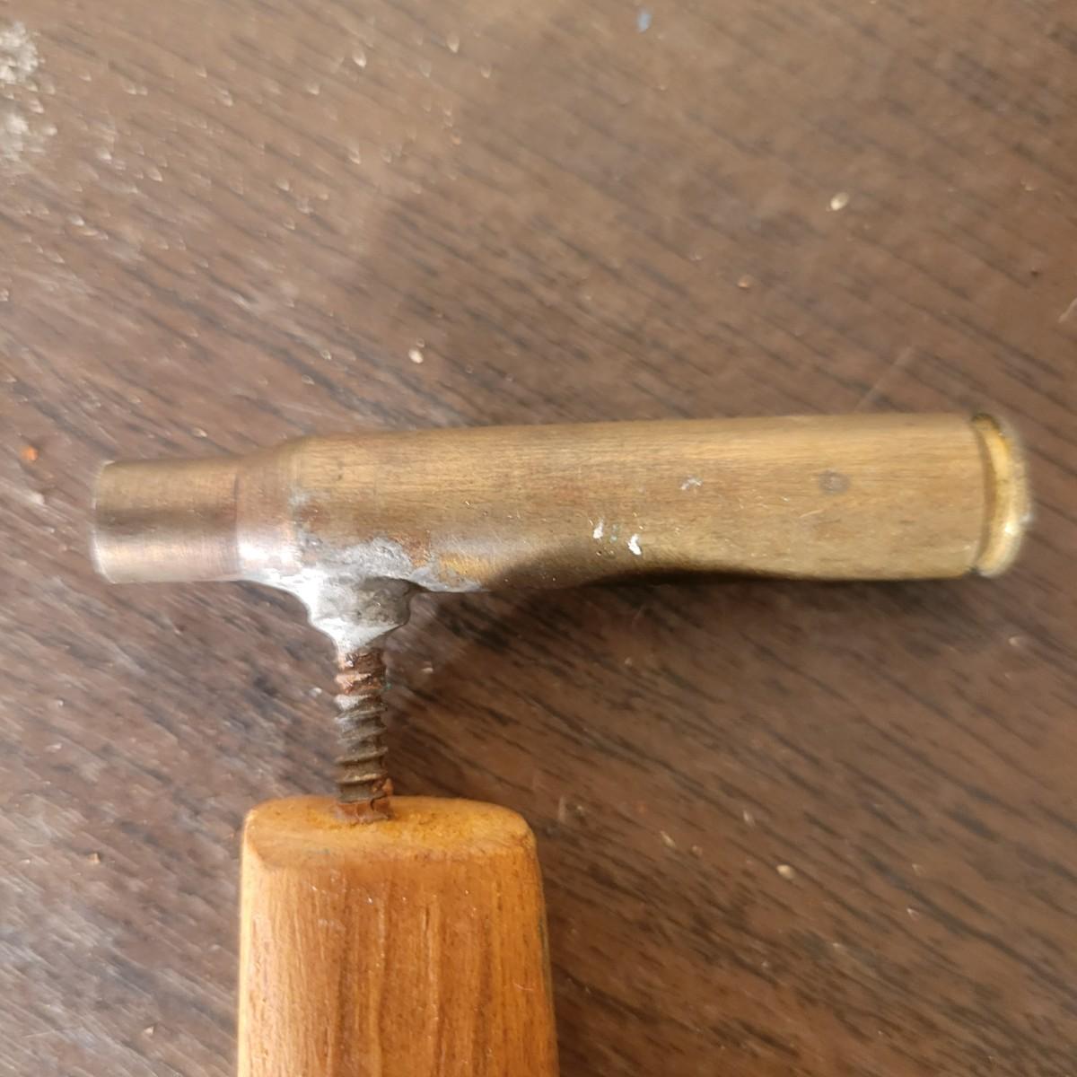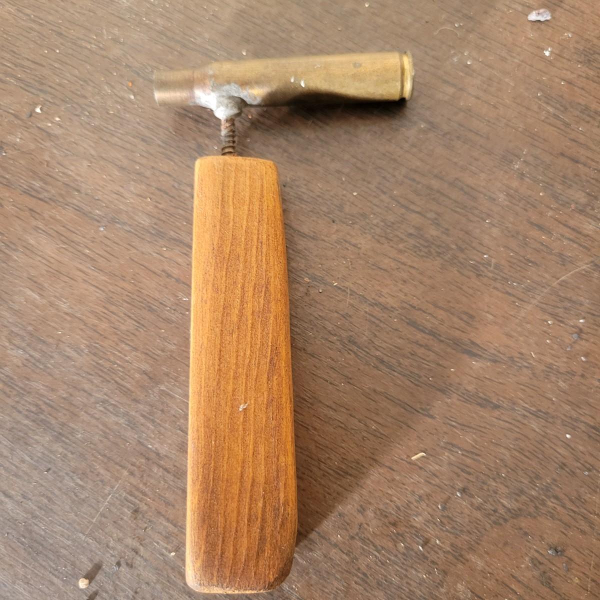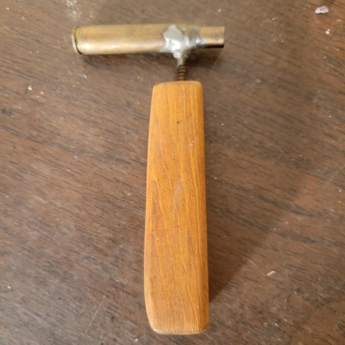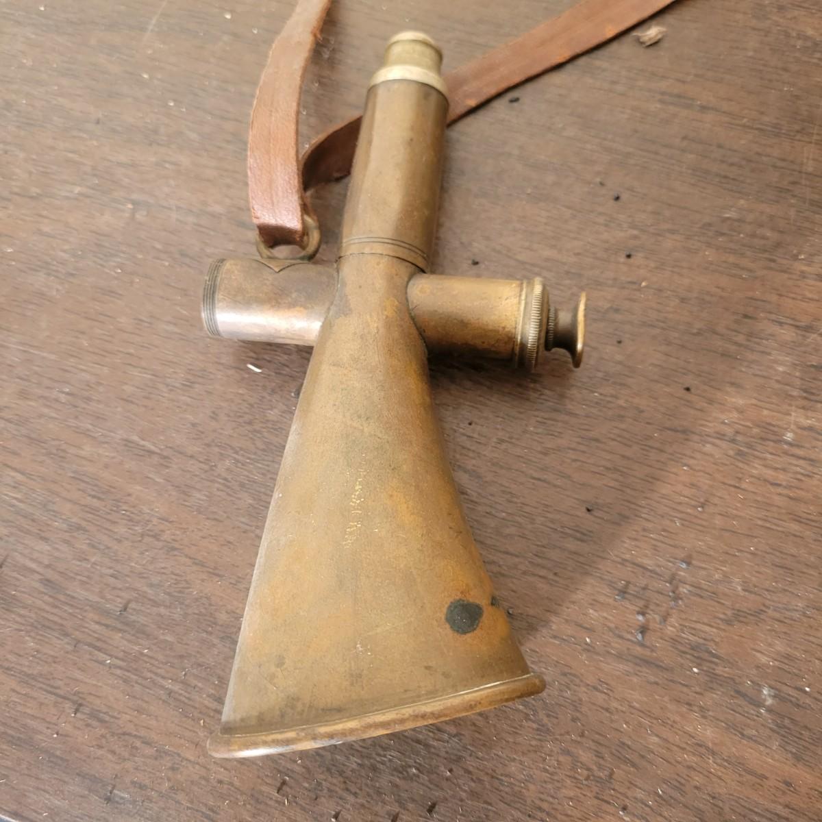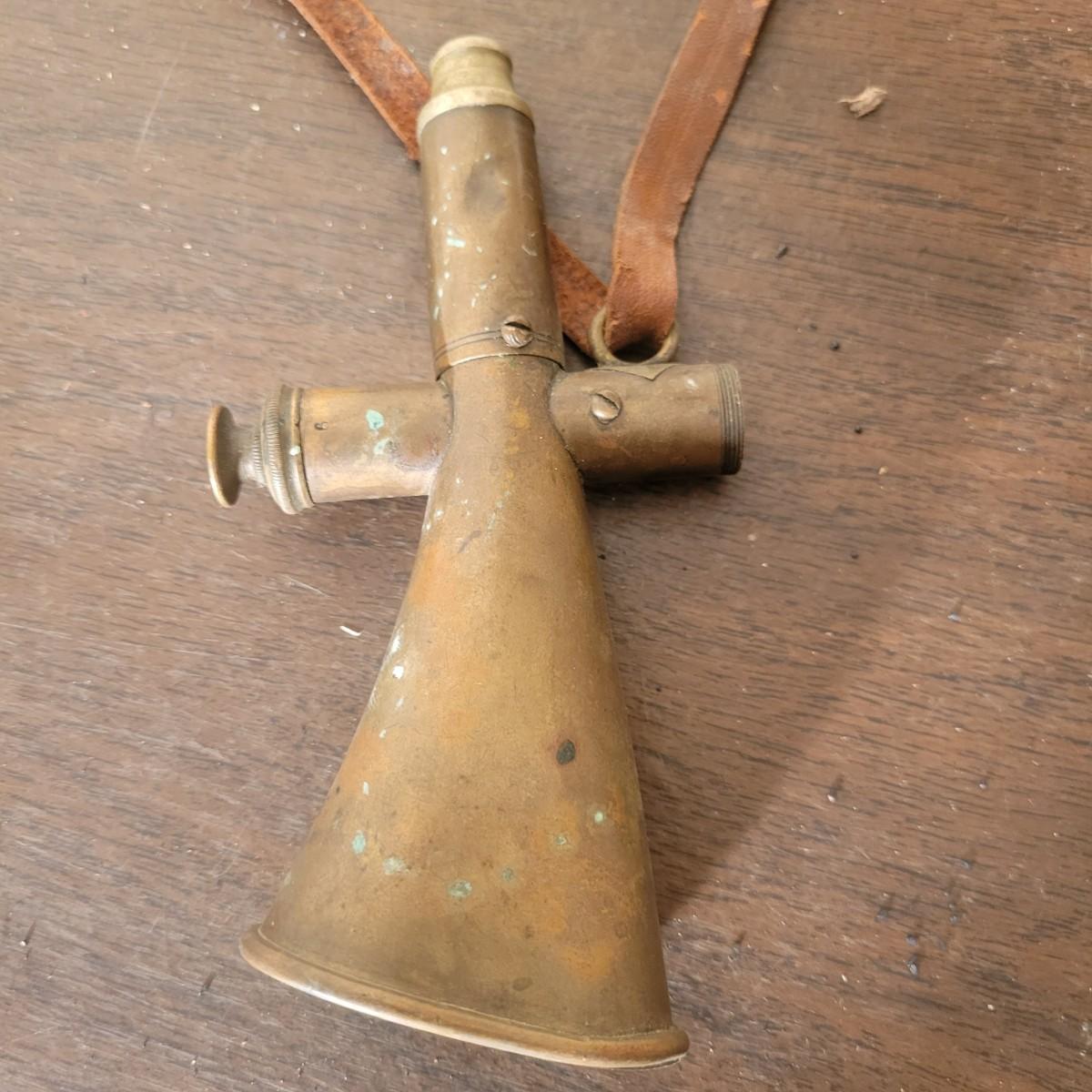 A collection black powder horns and novelties. One horn is made of actual horn, another is made from a gourd and one is made of brass with intricate carvings. Largest horn measures approximately 12" in length. Some horns may still contain powder residue. The other two items are not able to be verified but the one wooden handle with open end bullet mounted to it may have been a scooper for the powder. The other seems to be brass and appears to have maybe been a horn or caller of some sort. See photos for full inventory. Local pickup only