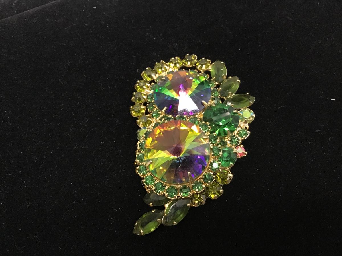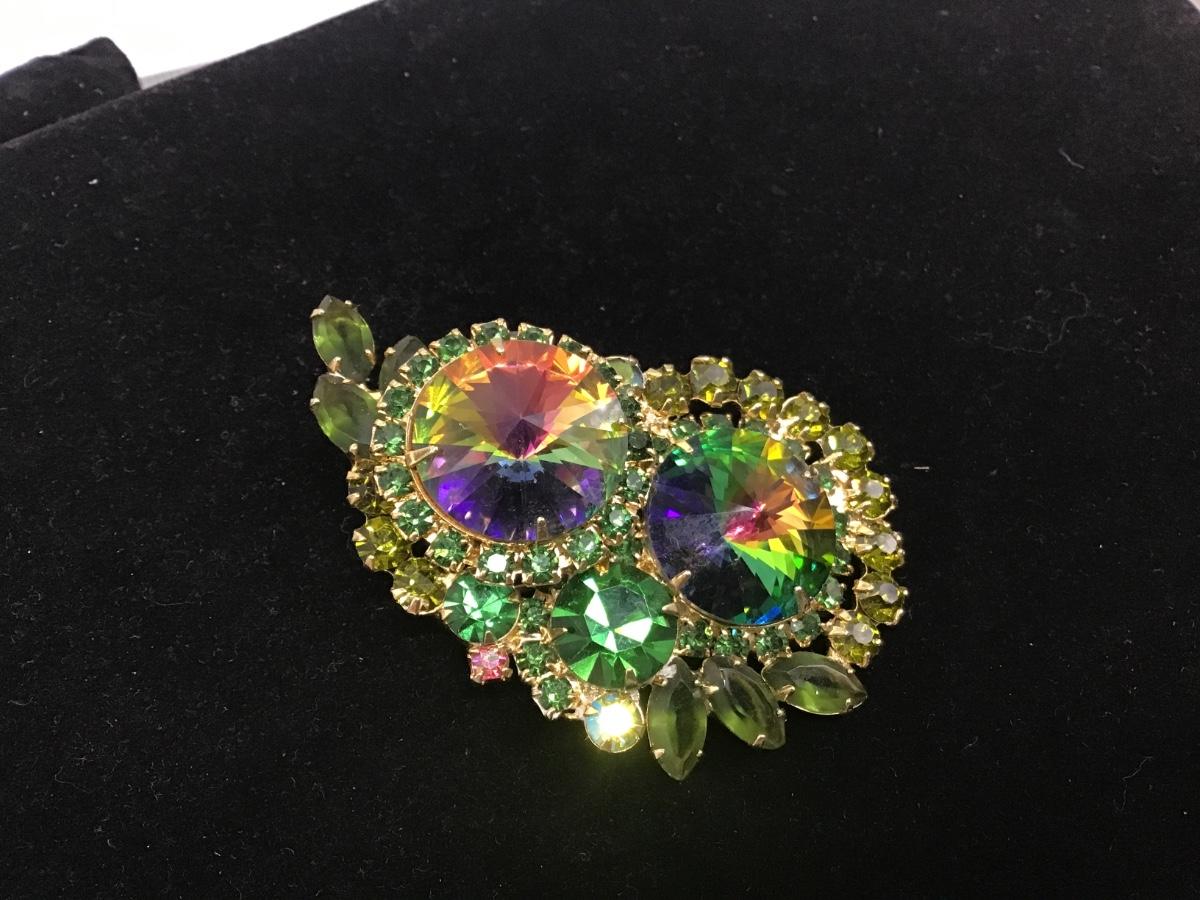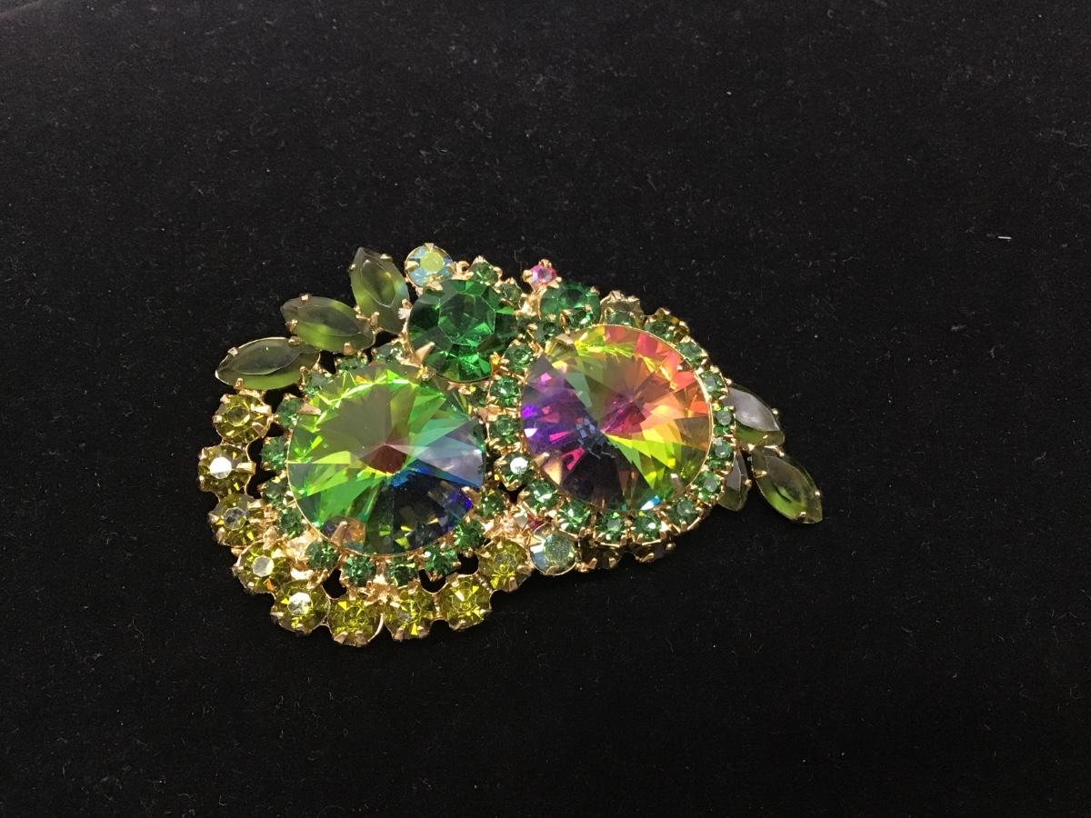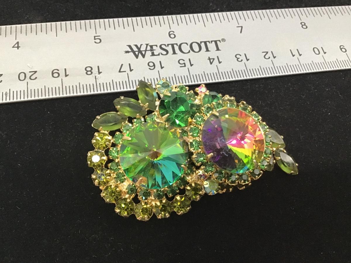VTG Juliana D&E OWL Green Watermelon Rivoli Rhinestone Brooch Pin AB EXCELLENT