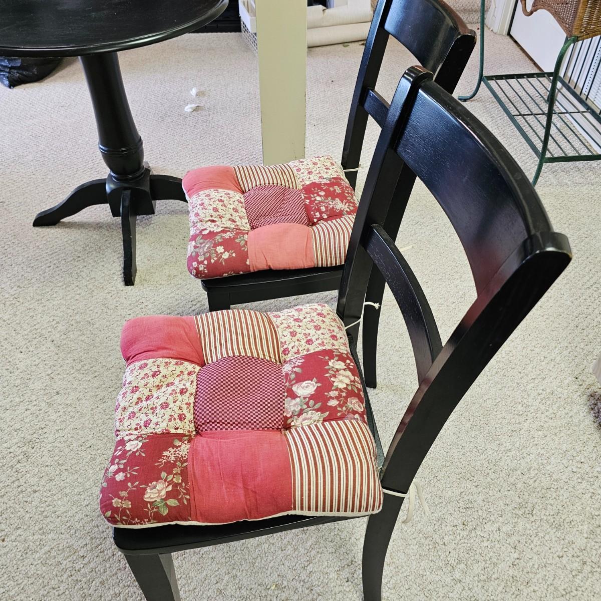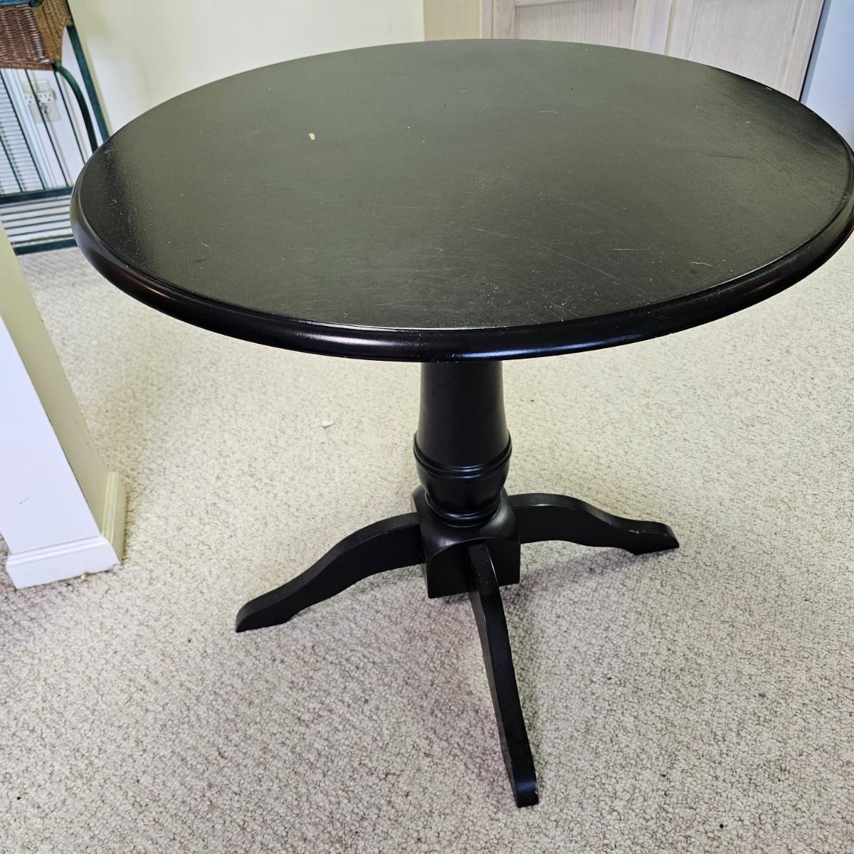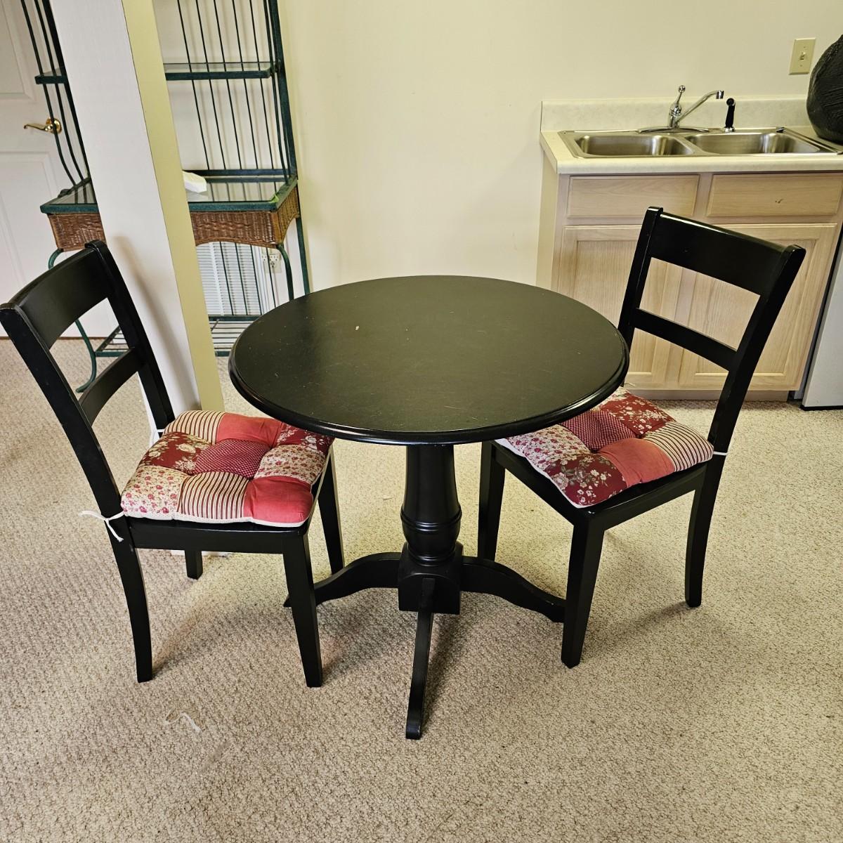 Cozy classic café style table with a pair of chairs, designed to fit in that perfect nook. Table and chairs are solid wood and appear very sturdy. Table measures 32"D x 30"H and chairs are 17" x 19" x 35.5"H with an 18" seat height. A few minor nicks and scratches. See photos for details. Local pickup only. This item is located in the basement with a flight of stairs or alternatively a garden path with approximately 15 steps that can be used to go around the side of the house.