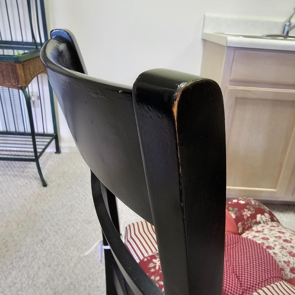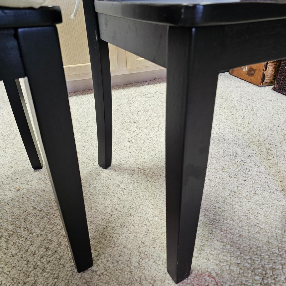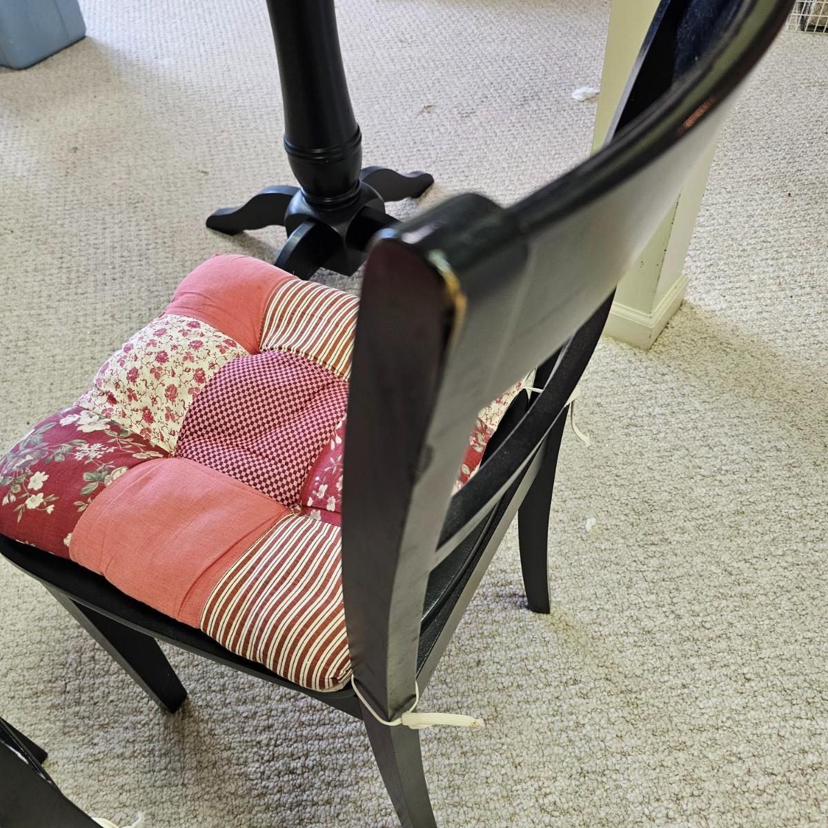 Cozy classic café style table with a pair of chairs, designed to fit in that perfect nook. Table and chairs are solid wood and appear very sturdy. Table measures 32"D x 30"H and chairs are 17" x 19" x 35.5"H with an 18" seat height. A few minor nicks and scratches. See photos for details. Local pickup only. This item is located in the basement with a flight of stairs or alternatively a garden path with approximately 15 steps that can be used to go around the side of the house.
